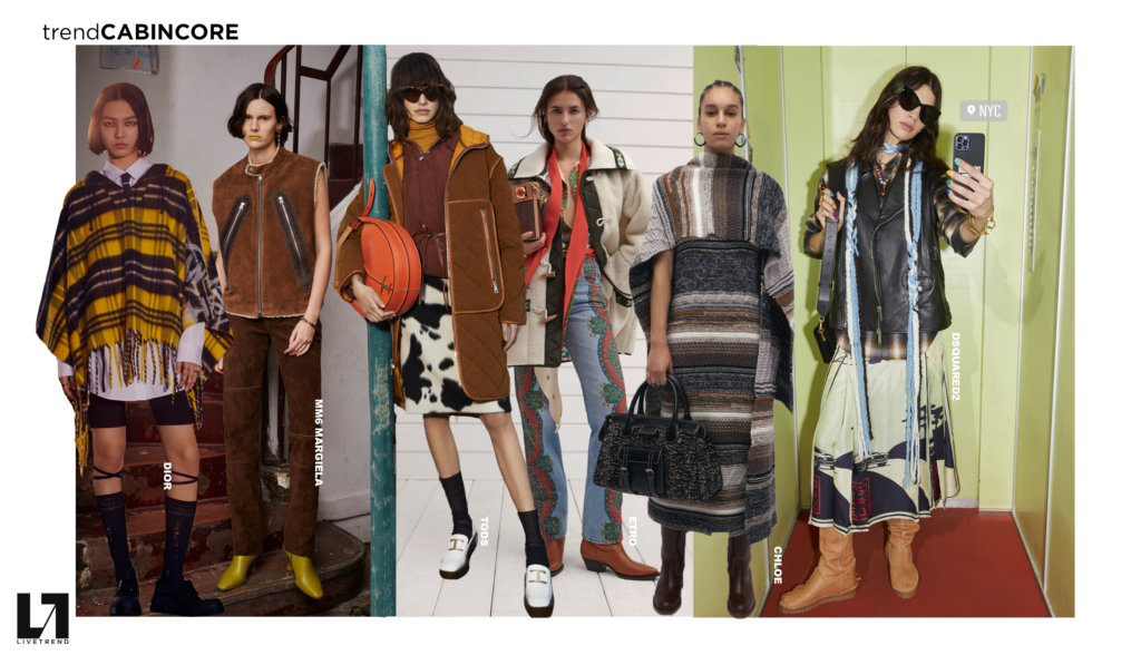 The Pre-Fall 2022 shows have shown a distinct preference for cabincore-themed design. The autumnal story proposes an evolution to the pandemic’s cottage core trend and takes it to a more authentic and practical level. Its inspiration of woodsy landscapes suggest a cozy retreat from urban life, busy schedules and intense workdays, as life is returning to a new normal. Cabincore feels more tangible and versatile than its dreamy predecessor, yet it maintains its rustic and countryside appeal. The look is able to add a sense of creativity to mundane everyday items by combining almost ill-matching pieces in a pursuit to express personality. With re-purposed and nostalgic elements, consumers are able to fuse old and new items into a trendy aesthetic now. Trying to balance feminine and masculine elements and to integrate joyful color hues is crucial for a successful cabincore story. This design trend is a story about the extra layer: with a vest or a poncho to boost outfits in infinite ways. At the same time, the versatile and transeasonal character of the layering look addresses environmentalism through a more mindful attitude towards consumerism. The strong focus on outdoor and nature, which is embedded in the theme, surfaces camouflage designs again. Such prints add a contemporary edge and simultaneously intensify the forest-ready style with an increase of solid +22% from the last year. Denim (+57%) and knitwear (+20%) build the foundation of the lumberjack-like aesthetic and show significant growth this season. Their growth index validates the relevance of the trend for the next seasons.