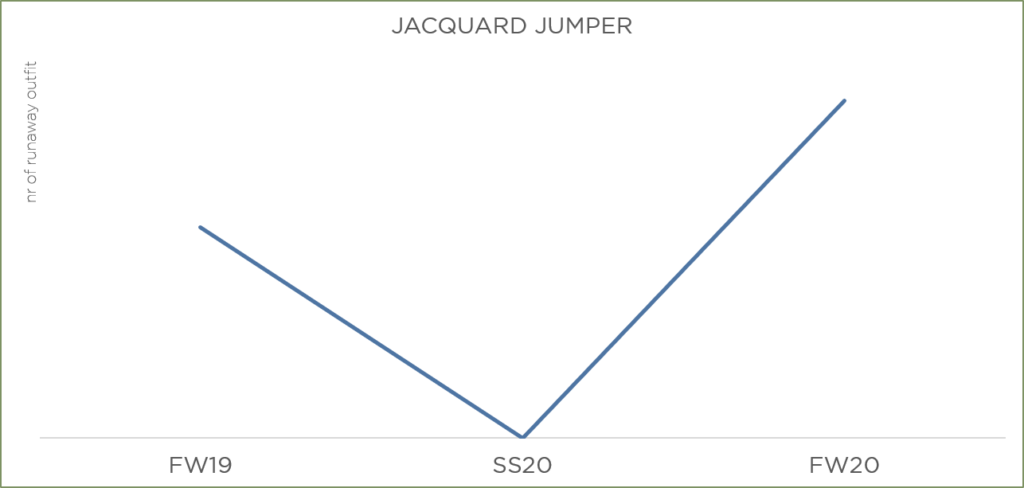 Analyzing Fall Winter 2020 fashion shows, we can track some of the must have of next season. We order by index of grownth compared to FW19, but you can see on the left the quantity of outfits on the catwalk. The graph in the middle illustrates the trend over three consecutive seasons. In this way, on a statistical basis, it is possible to predict the must have trendy pieces and their possible evolution.