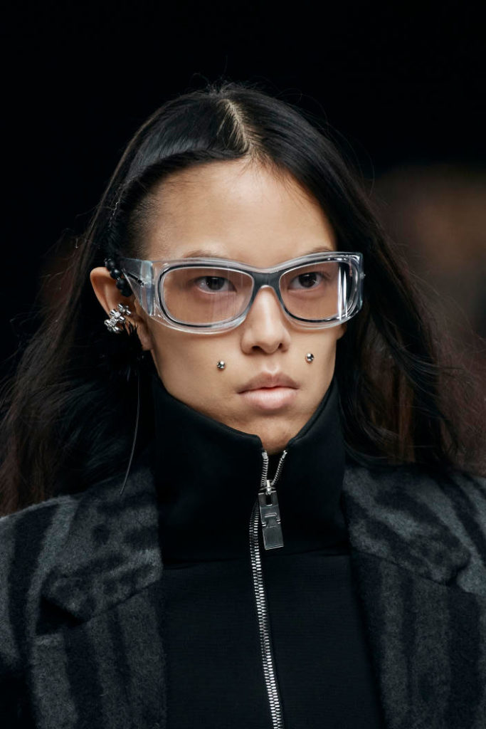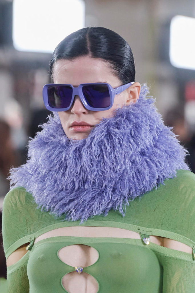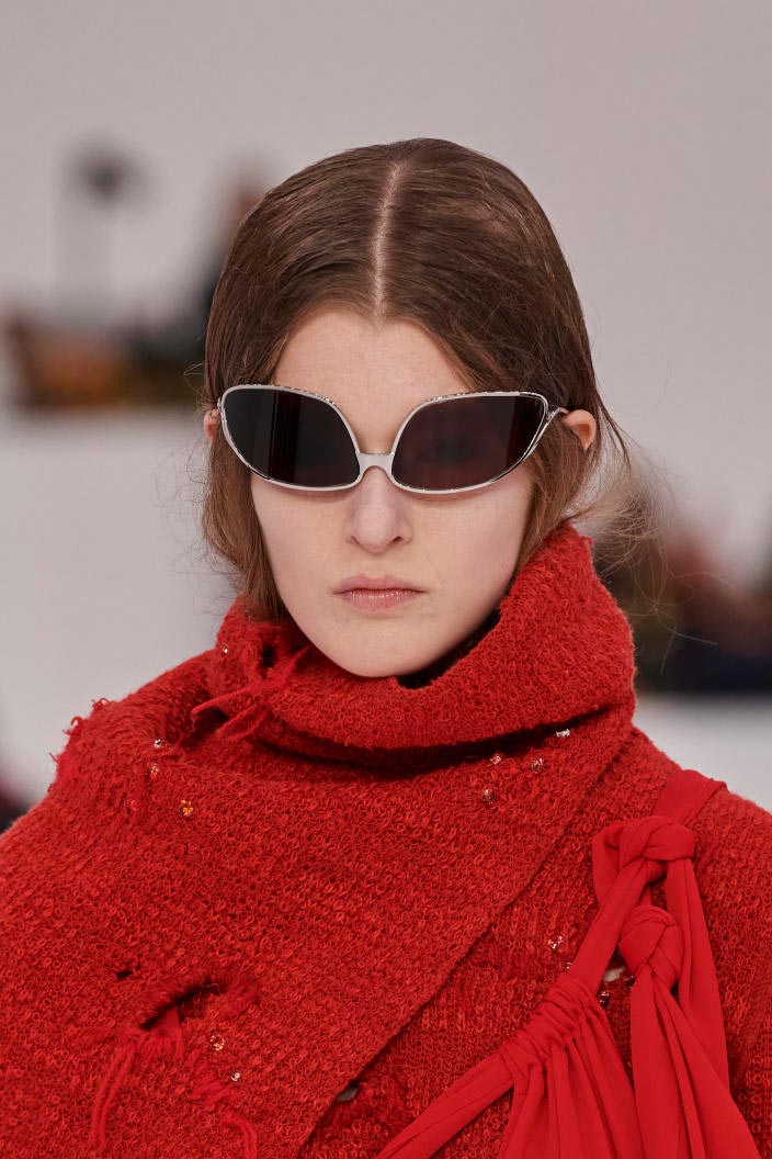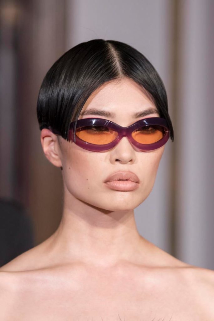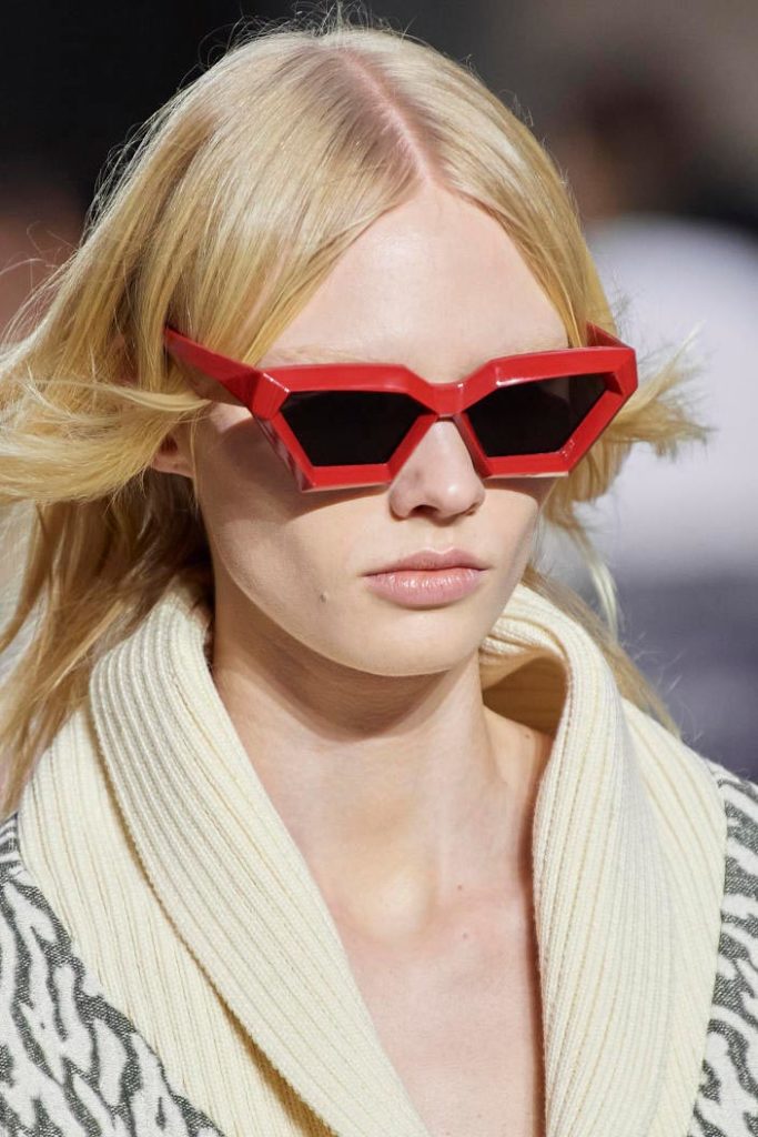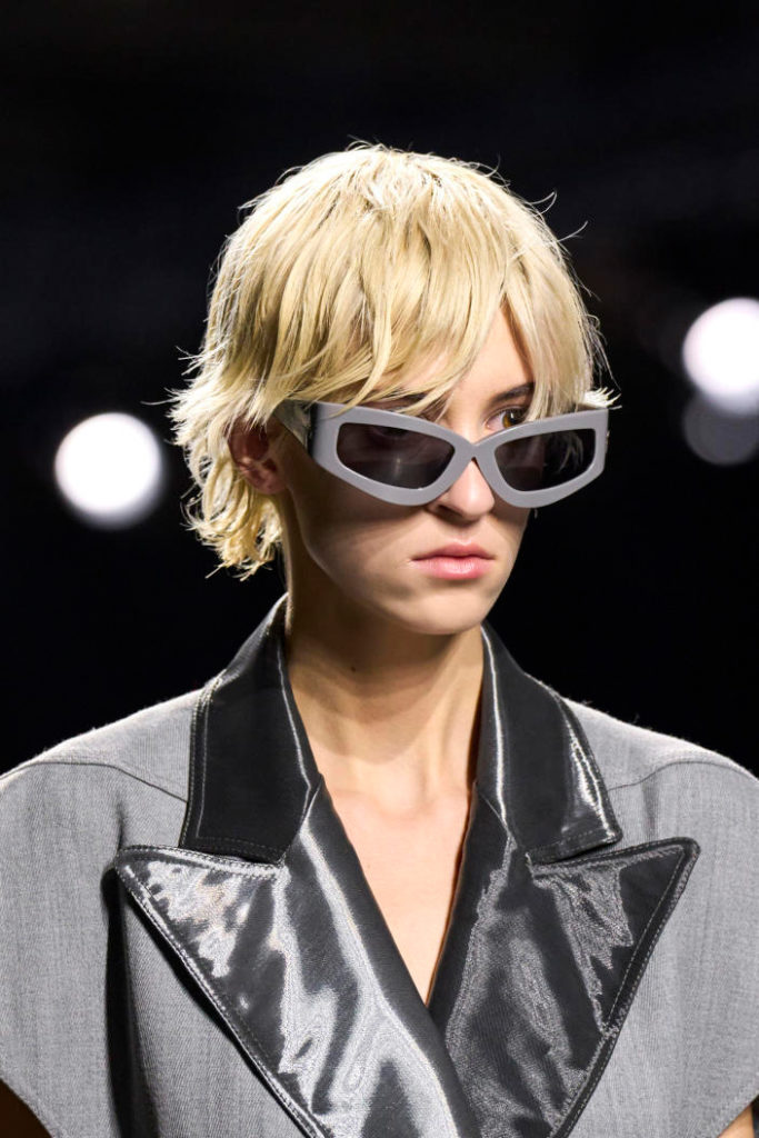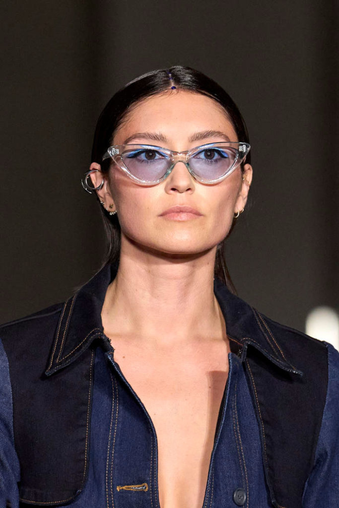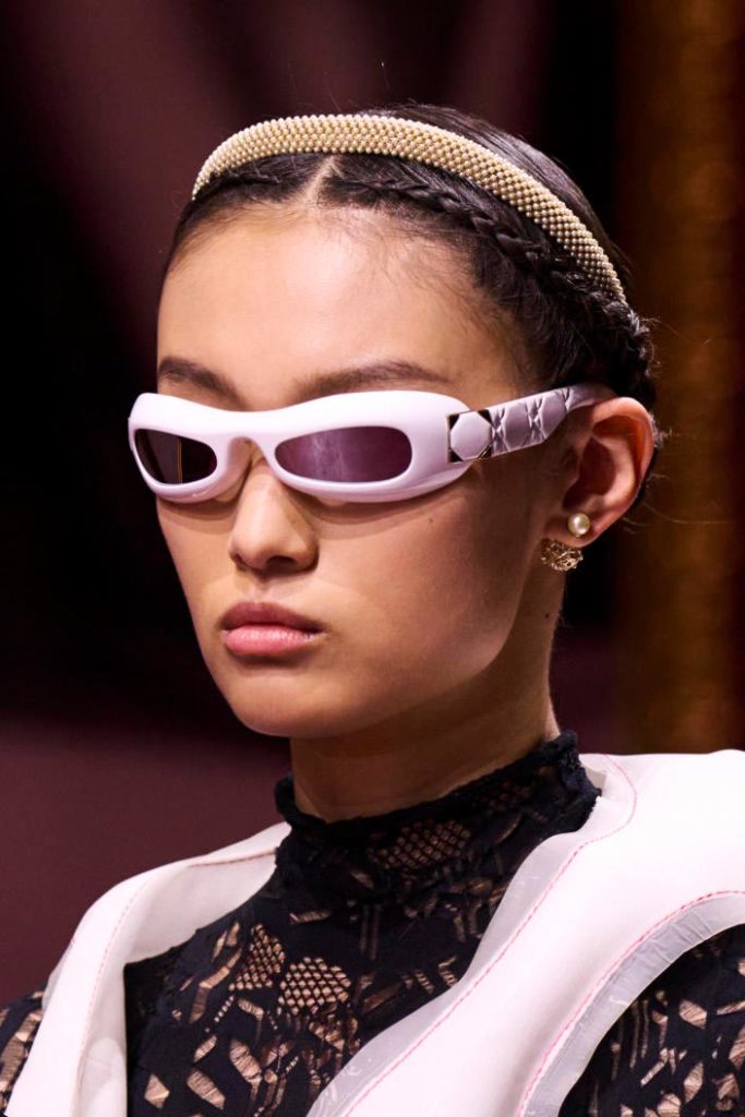 The runways have provided us with a great number of iconic eyewear styles. The biggest trends showed shields, racing styles and cat eyes. All of these trends strive for an empowered femininity and enhance the strong traits of womanhood. Other favorites include stylized round silhouettes and creative upgrades of large and angular retro frames. The most edgy trend was composed by “upside-down” styles, innovative transparencies and barely-there Y2K frames. Altogether, the season provided lots of innovation and eyewear that seems more fashion-forward than ever. Most models incorporate a distinctly futuristic feel and feel appropriate for apocalyptic post-war sceneries, as well as the uncertain metaverse. Clashing such bold shades with hyper feminine and nostalgic silhouettes, constructed in soft and drapes materials, creates an exciting contrast this season and depicts the duality of femininity, balanced between gentleness and power.