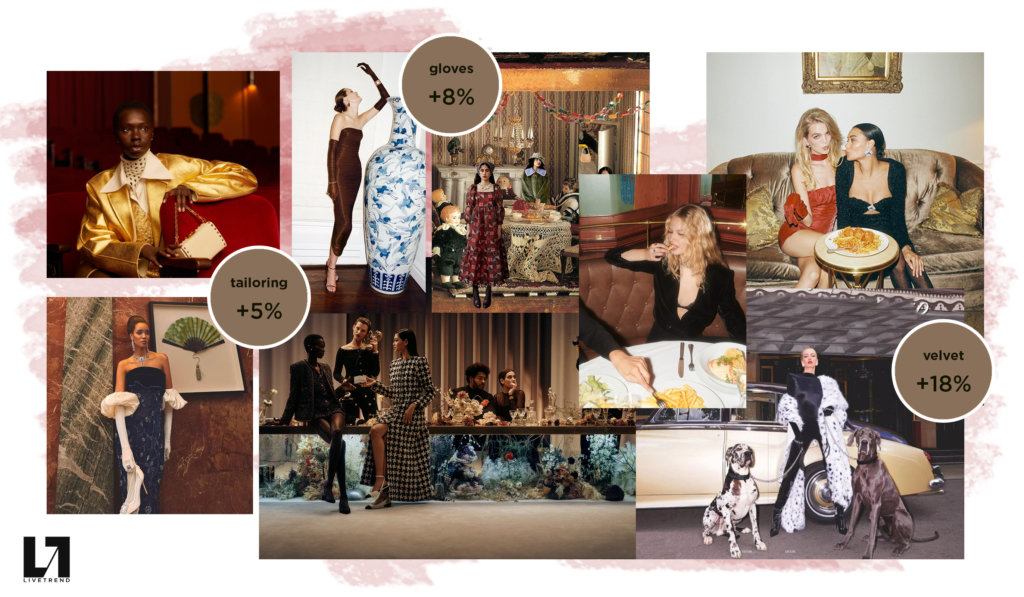 Party guests are invited to the most lavish dinners again. Reminiscent of aristocrat gatherings, a luxurious feel is added to collections. Consumers are seeking to bring the red carpet to their own lives and this elegant Christmas concept is the way to go. With indulgent colors of jewels and crystals and materials that talk occasion like no other, the slightly over-the-top aesthetic resonates with a ready-to-impress audience. long gloves are essential, especially combined with off-the shoulder dresses, longer and fitted lines, tailoring elements and muted color-palettes are creating an invites-only dress code for 2022.