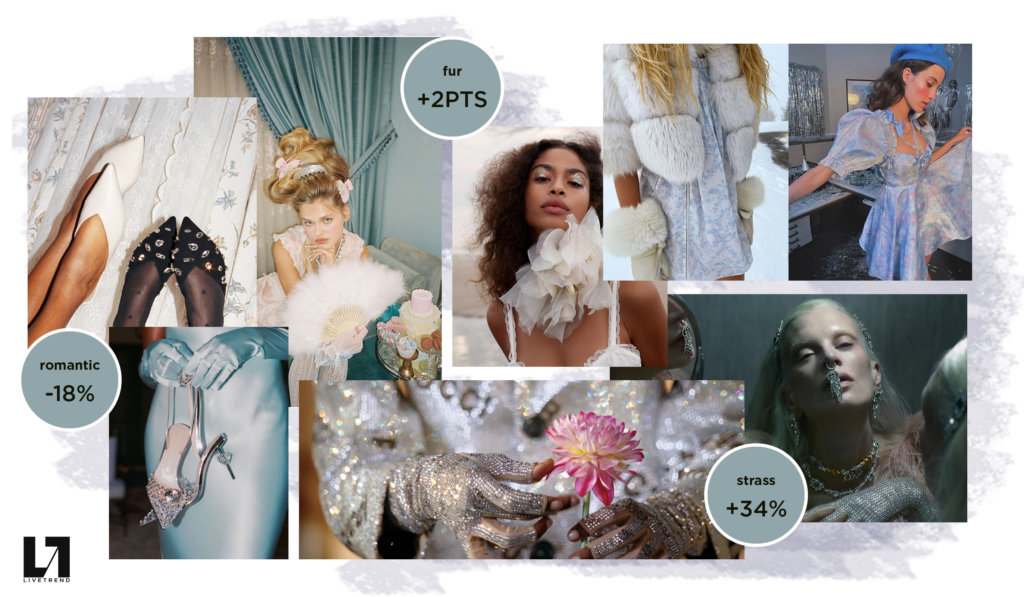 It is the tale of estranged beauty from the north-pole. Midwinter tales tell poetic and feminine stories of a nordic fairytales and ignite our capacity to dream and phantasize. For this trend, the cottage and regency movements are fusing together and merge into a beautifully phantasmagoric design concept. Icey color palettes are supported by crystals and shimmers, yet balanced with a sense for softness. Such softness is created by light and fluid fabrics and fluffy full-volume silhouettes including pouffy sleeve. The tendency for textures in form of brushed yarns and soft (fake) furs enhances the lightness and plush even further.