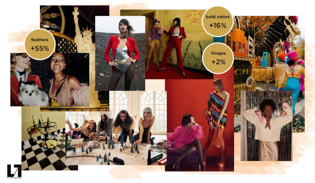 It's time for a Christmas parade again and everyone is invited. As the aesthetic universe of consumers is broadening and more maximalist and individualistic styles are more widely celebrated, classy parade styles feel more fitting than ever. The traditional celebration is reimagined and translates into a mix of enchanting-colors, sparkles and joyful trims. The trend projects the feeling of spontaneity, celebration and joy. As all of those elements strongly resonate with current consumers, the concept of quirky parades is able to unleash the retained holiday spark of the previous season, therefore doubling up on fun and glam. This design direction for the holidays grasps onto important value changes concerning inclusivity and the appreciation of diversity. Feathers, sequins and creative accessoires are key for a gender-blender look.