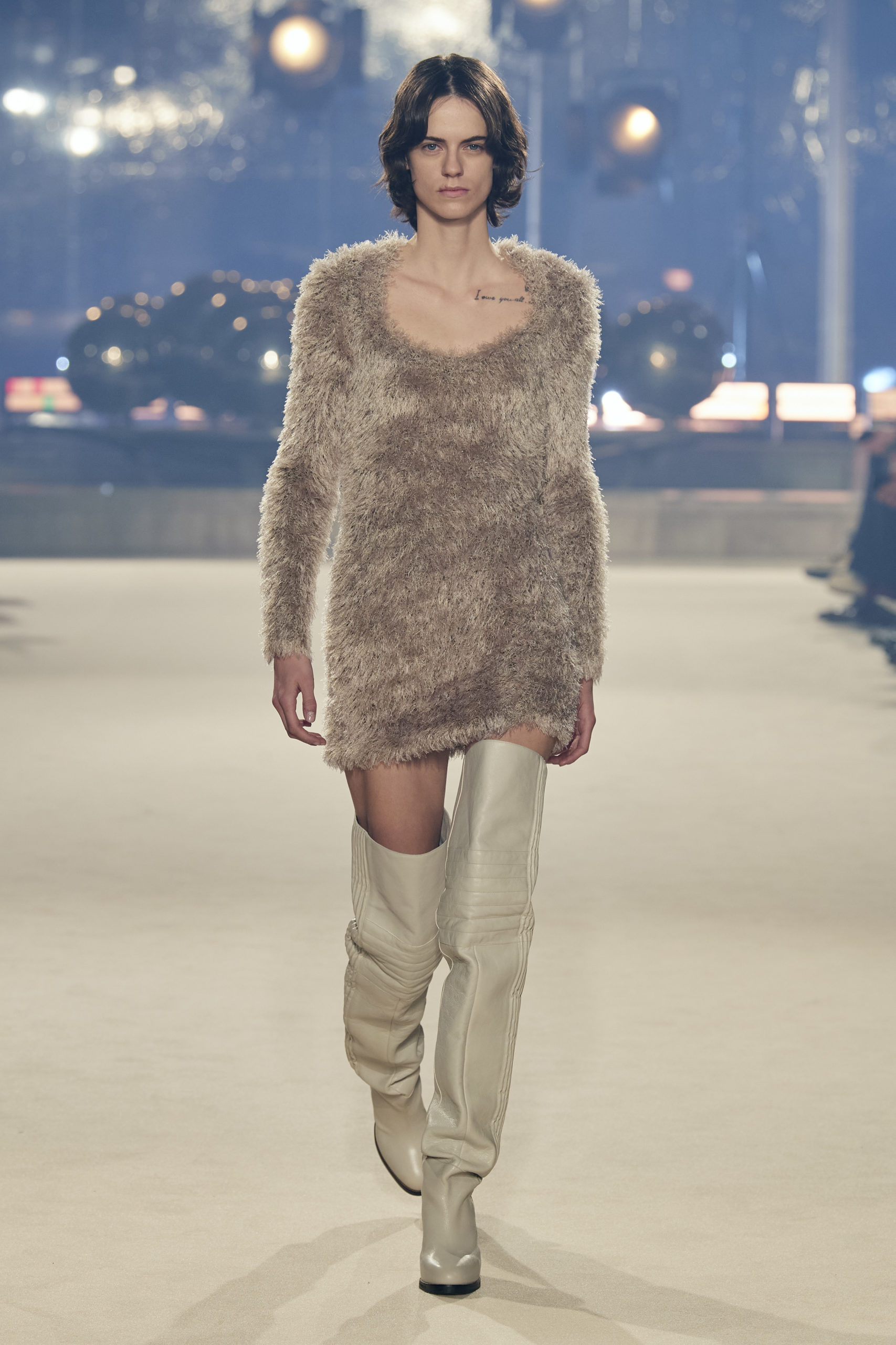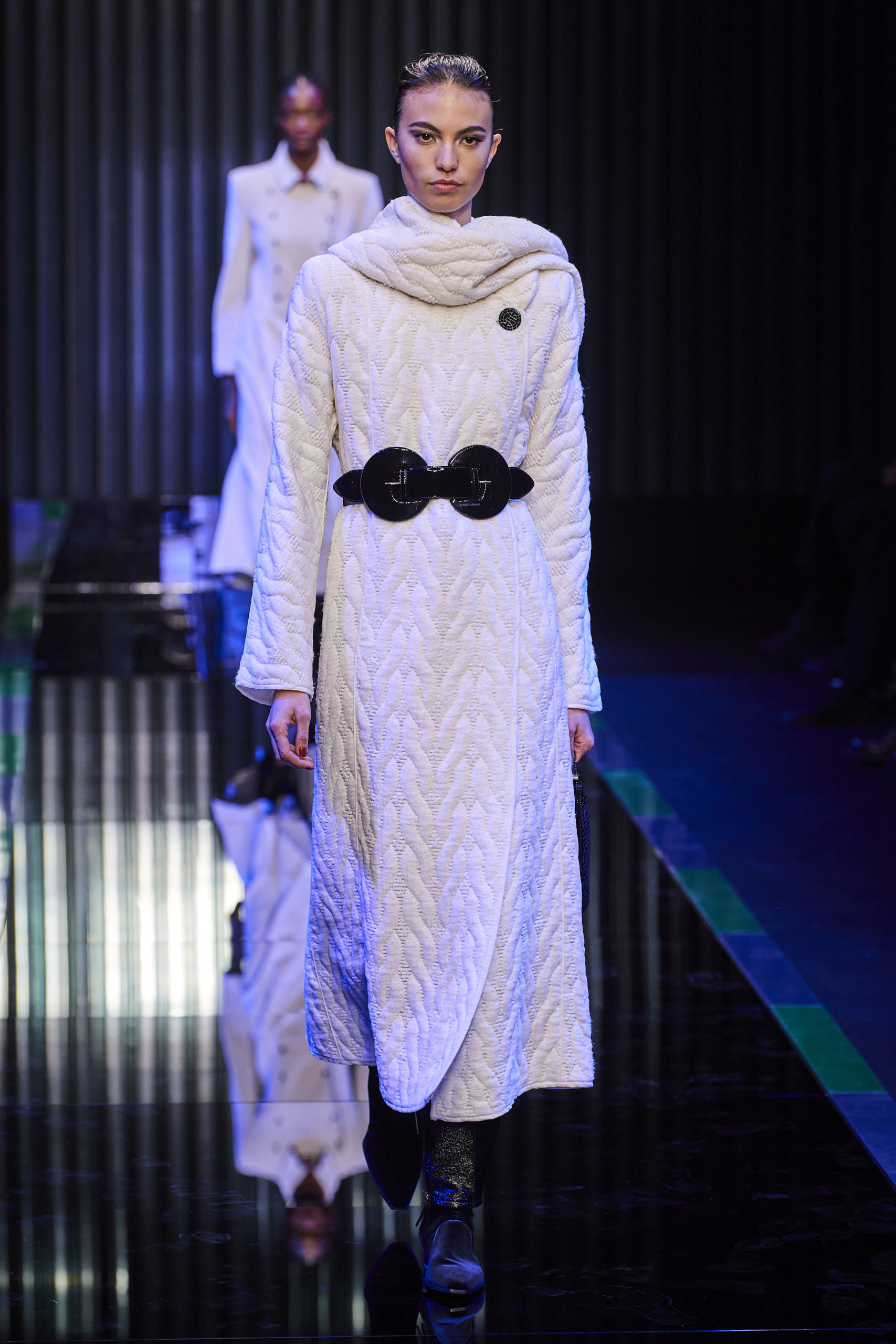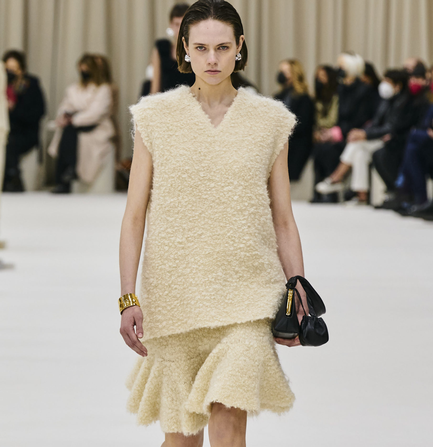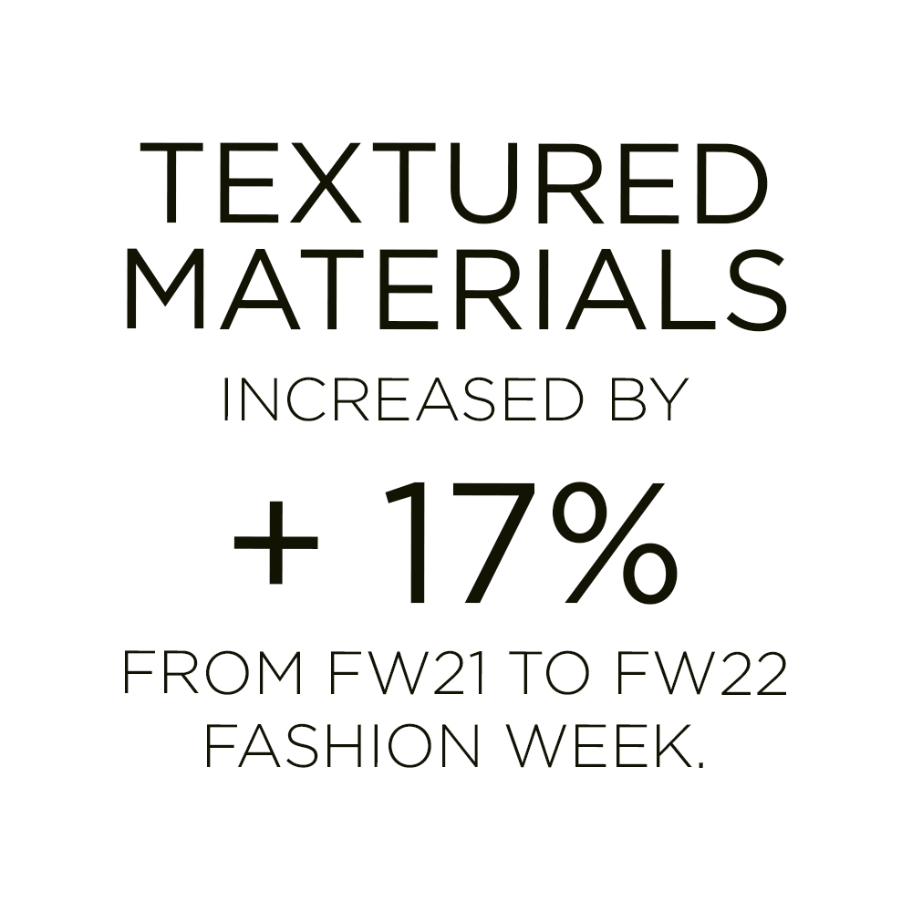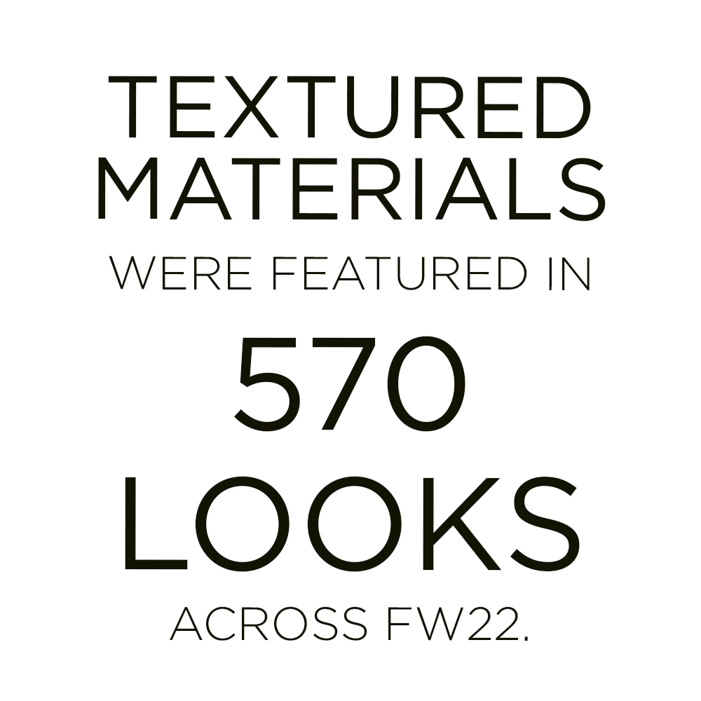In fact, knitwear is getting a luxe upgrade for FW22. with sheer effects and delicate openworks exploring the idea of revealing skin and brushed yarns and subtle textures affecting the skin through their literal touch, a new idea of luxe textures is sweeping across the runways. From accessoires to knit sets and jumpers, products that seem dipped in pure and neutral palettes are resonating a distinct sense of softness. Textured textiles grew by +17% and were featured in more than 570 looks. Their impact is undoubtable and proposes a safe trend for FW22 and the seasons ahead. Elevating basics or proposing a new luxe leisure wardrobe, calm, yet crafted knits feel more mindful and connected to human essentials than they did before.