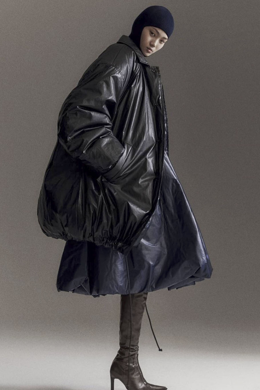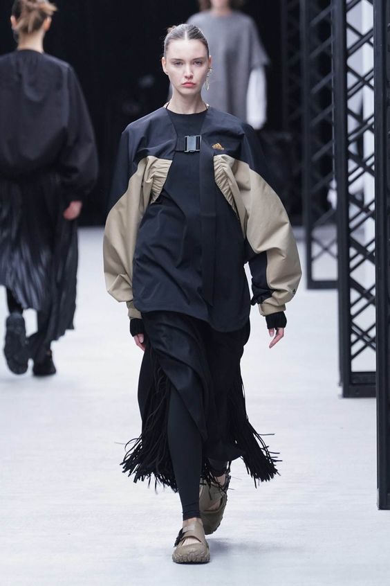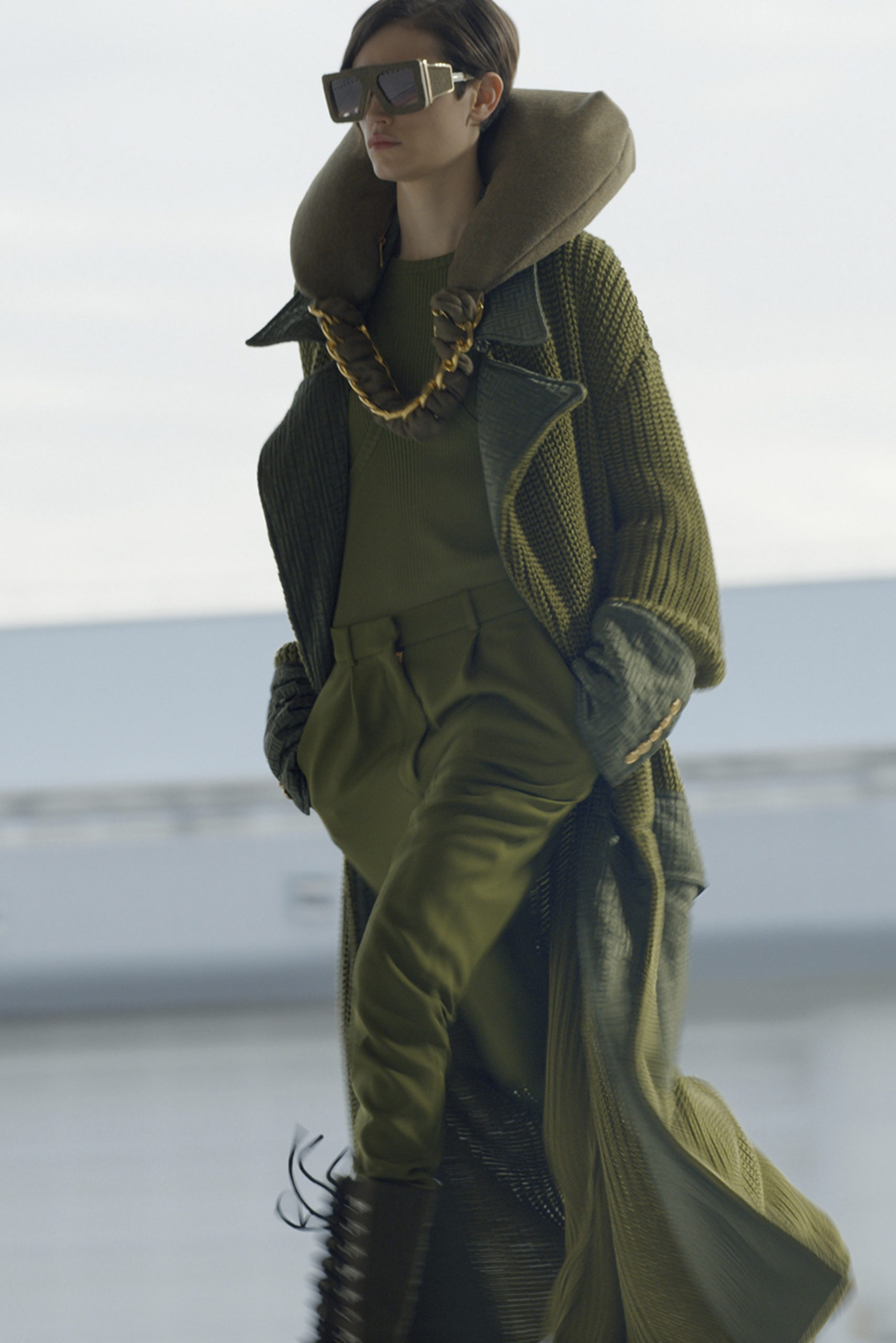Translated in core looks, the disruptor trend signals a taste for strong silhouettes. New and bold outlines, which certainly leave an impression. Bold shoulders, sharp-cuts and powerful textile qualities result in strong and eye-catching designs. The palette shows a taste for neutrals, from beiges to whites. Another key color are currently emerging palettes of khaki and grays, which add to a militant, utilitarian feel. Not to gorget, the FW21 color-trend for all-black maintains its relevance. Material-wise, the rebellious feel is translated through leather, chunky knits, distressed surfaces and textile qualities that are able to generate volume. Staple Items are long skirts, coats, bomber-jackets, power-shoulders and chain embellishments. Key accessories like combat boots and face-coverings are updating current trends, while maintaining the safety-properties of the facemark. Their anonymous effect is completing the look. Other subversive details, showing skin or nodding to lingerie can add another element of provocation, all along the disruptor’s rebellious mindset.
