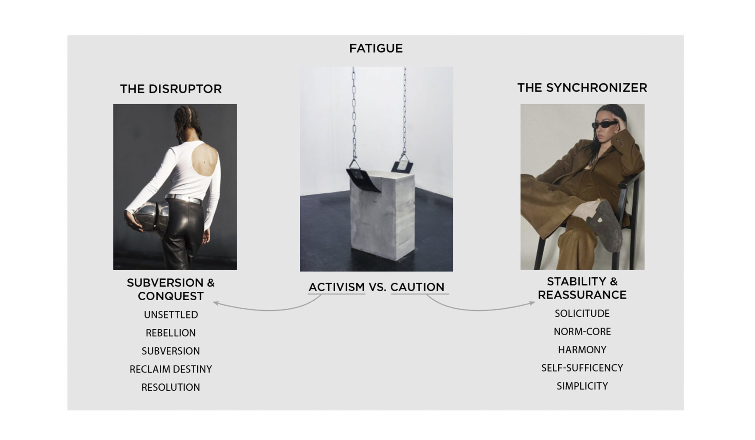 There are two different ways to react to such feelings of emotional and physical fatigue. Those two strategies are activism and caution. THE DISRUPTOR counteracts his fatigue through activism. He wants to escape a seemingly never-ending crisis through subversion and conquest and manifest his resentment towards the pandemic-period. This rather unsettled consumer reacts with rebellion to reclaim his own destiny. Not wanting to be fooled by politicians and society anymore, the disruptor might also tend to use more drastic means and get involved in aggressive revolt. On the contrary, THE SYNCHRONIZER is accepting his destiny and tries to conform to prevent any more changes. This cautious attitude reflects his desire for stability and reassurance. He is afraid of a continuous downward spiral henceforth seeks security. Whether this security is related to product, data or services, it provides soothing to numbed sentiments. Characterized by solicitude, self-sufficient and simplicity, the Synchronizer represents the new norm-core consumer, who seeks a harmonious world with minimal effort and minimal change.