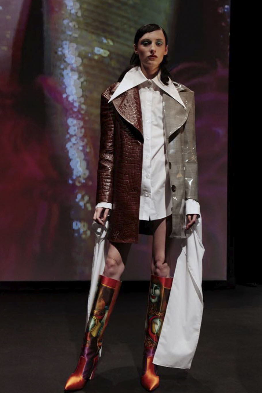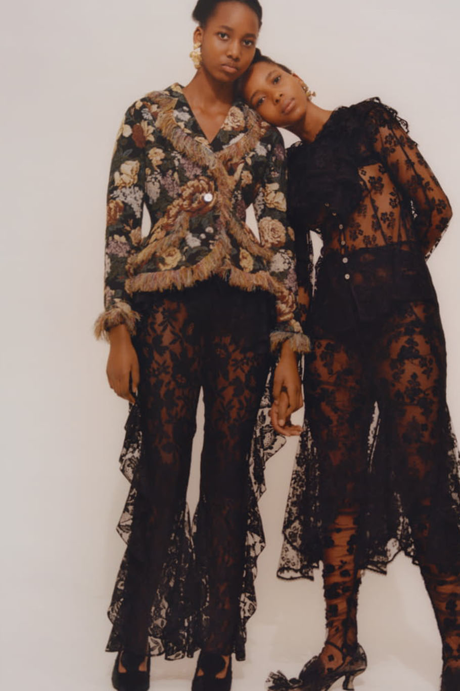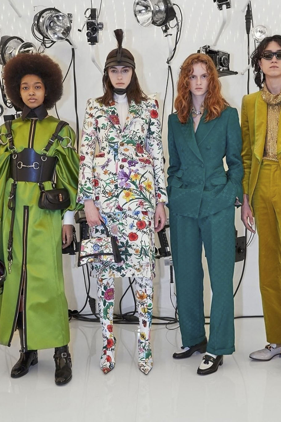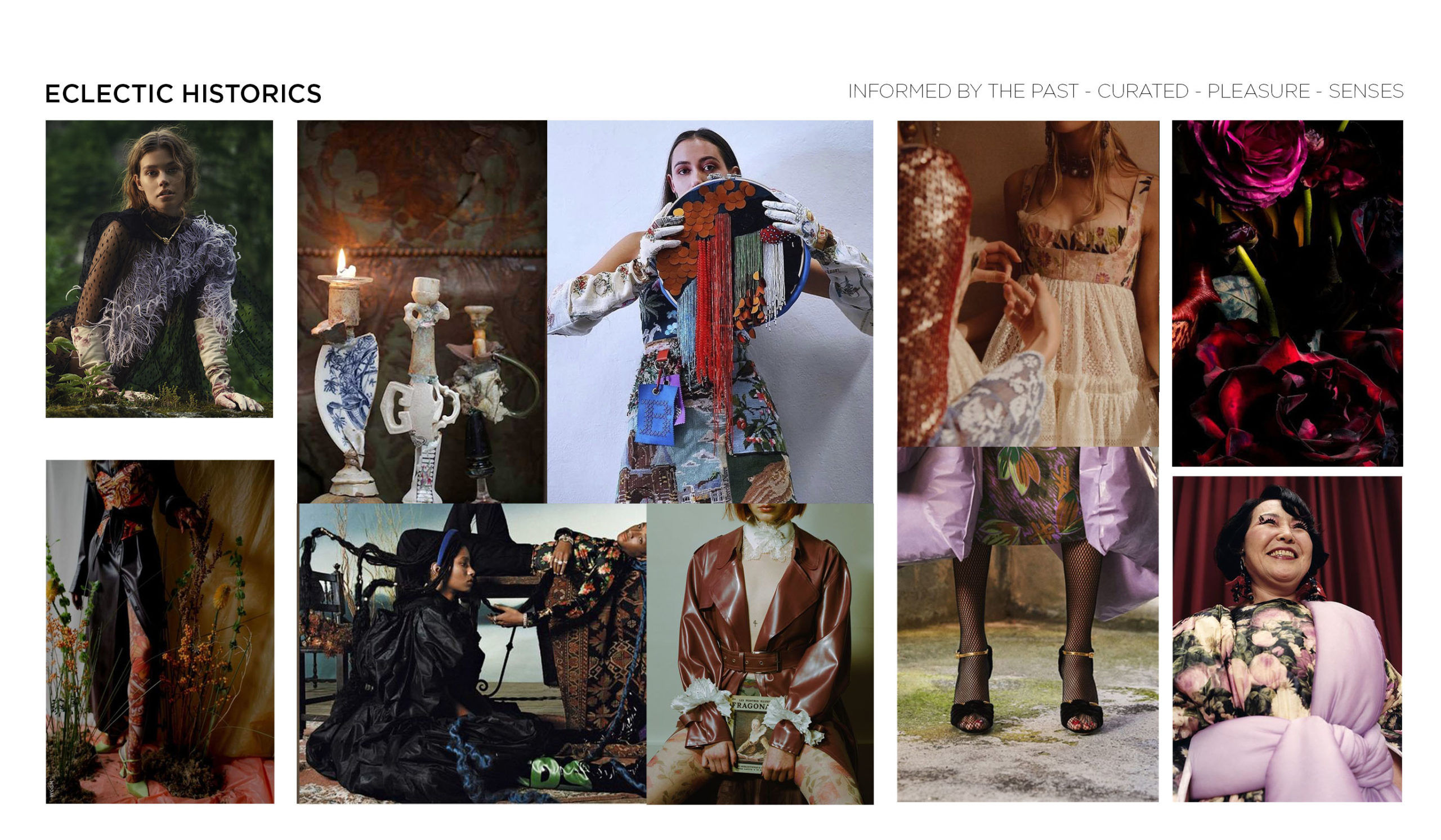 As mentioned above, historic dreamscapes inspire rather extravagant designs within this story. Due to the plurality of influences it is difficult to define the style that is collecting memories of the past. The fusion of anything inspiring and meaningful creates a hybrid-aesthetic within the final looks. The eccentric character of certain styles incorporates the exaggeration of volumes or shapes, ranging from enlarged sleeves and extra-pointy collars. Materials like florals, lace and brocade add a distinctly feminine nod to the story. The more historic elements include embellishments, collars, flamboyant trims for corset details. While the color palette grounds on gloomy and indulgent darker tones, hyper-bold hues are added to enhance the mystical and outlandish feel of this trend. Mix-and-Match aesthetics are key here. Finding novelty within a magical fountain of youth should push exciting and fantastical styles for FW22, especially relevant for festive and evening styles.