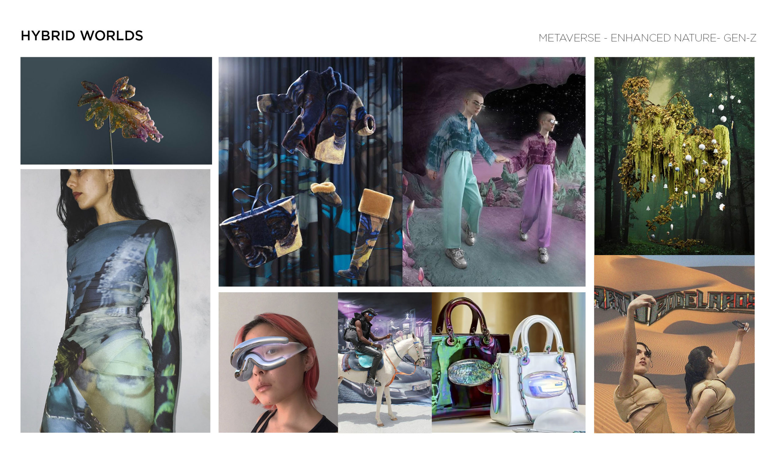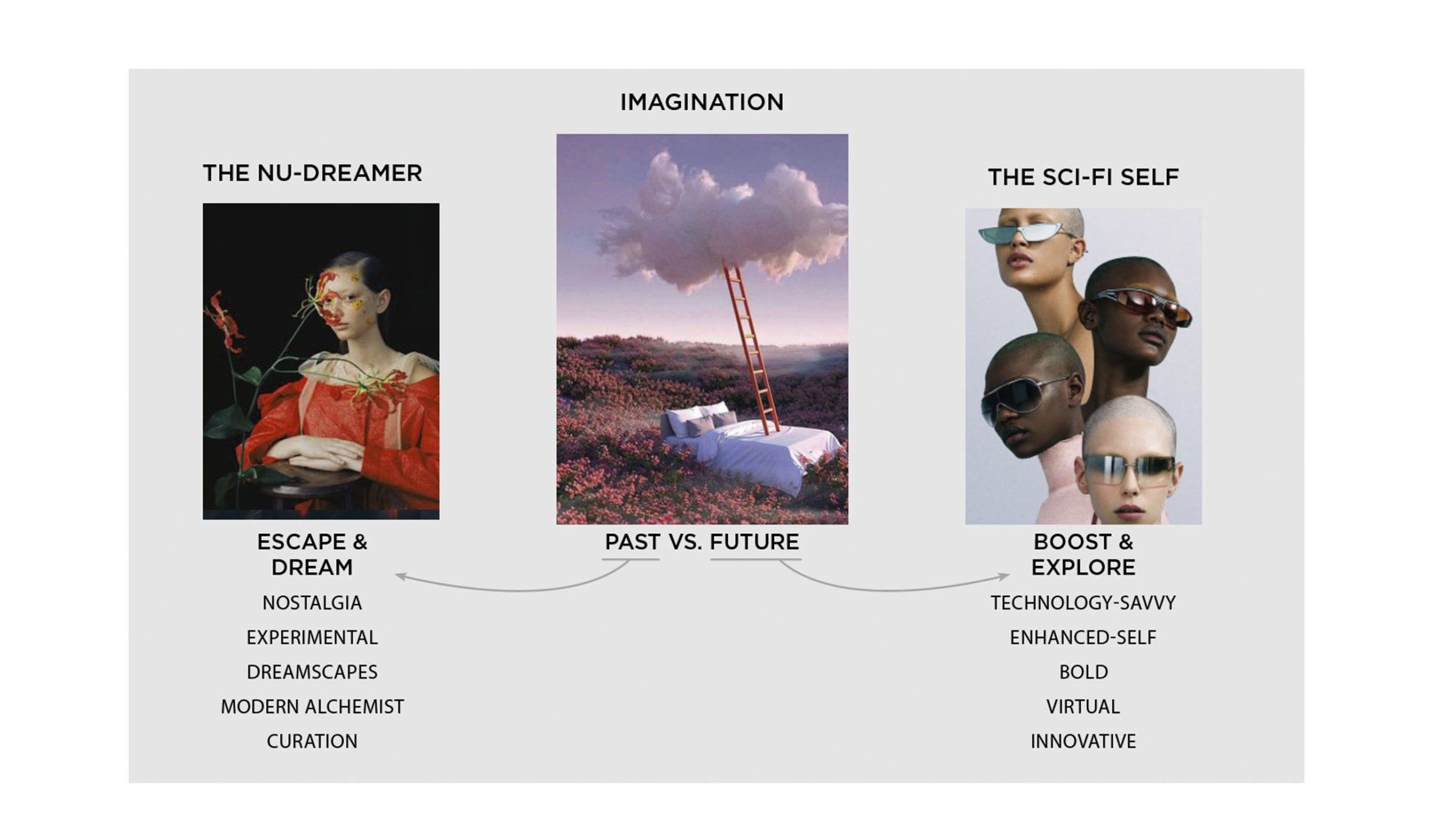Looking at the different reactions to the consumer driver of imagination, it might either wanders towards the past or seeking out the future. Regardless, the efforts to find sources of inspiration remain at the base of both directions. THE NU-DREAMER is looking for his creative escape in in the past and follows a path of dreaming and escaping. Driven by an appreciation for plural senses and a desire for the past, the outlander can be defined as an eclectic romantic. Guided by his need to innovate, he collages anything that seems meaningful into a phantasmagoric new landscape and style. THE SCI-FI SELF, on the other hand, explores the capacities of the future to embark on imaginative journeys. Following a path of exploration, the boosted consumer begins to point to new directions and new spaces for living. Appreciating the power of progress, this consumer is driven by his search to enhance the world. By merging nature and reality, the Sci-Fi Self is beginning to construct alternative meta-verses and propose outlooks on the long-term development of life. This consumer has developed a new virtual self in the online world. This new self further erodes the separation between the real and virtual world, which underlines an increasingly growing interest in cyborn and digital characters as well.