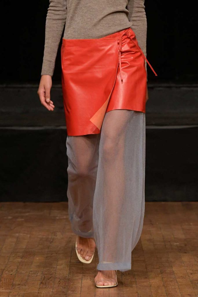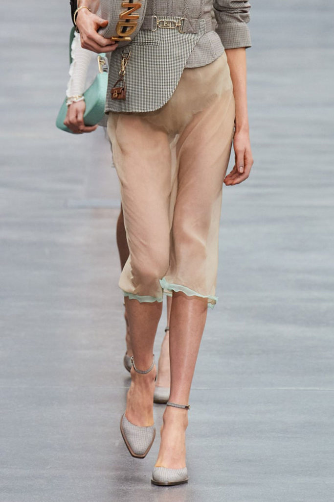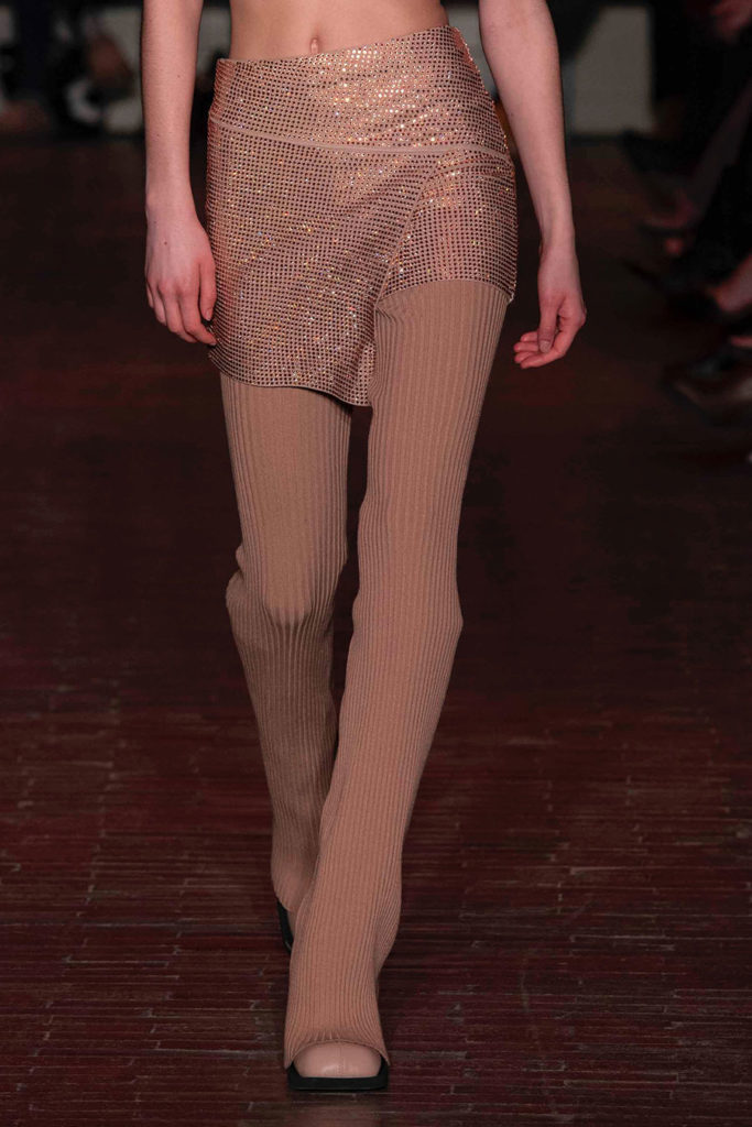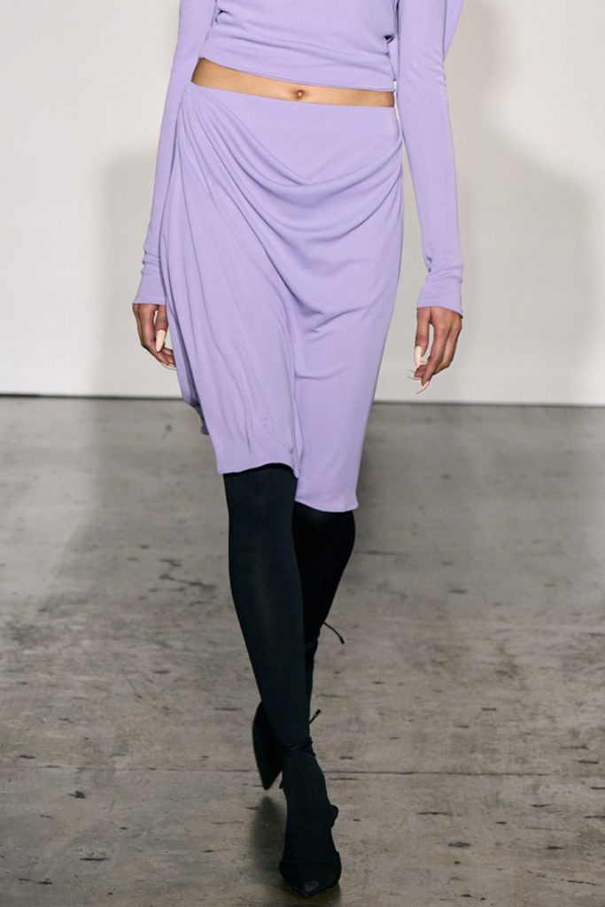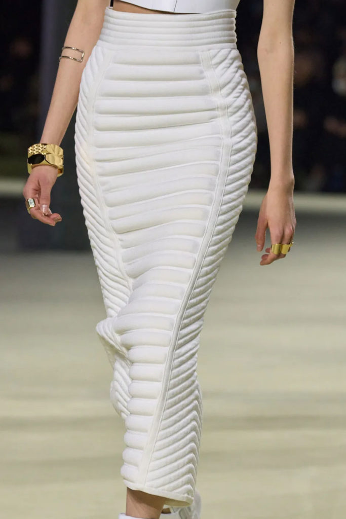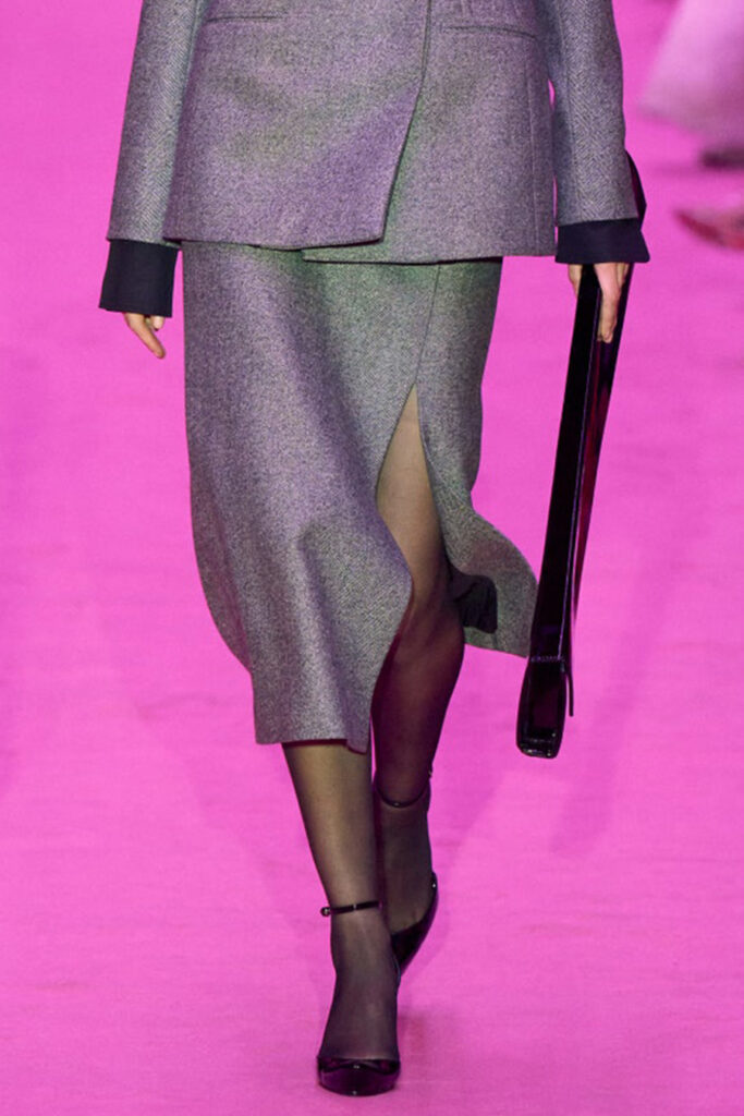 For FW22, mini skirts represent the vast majority of the category assortment, with 536 looks and a growth of +34%, this piece offers multiple possibilities for experimentation: from the preppy minis in tweed to rebellious raw edges and low wait-lines. Clean, fitted lines in the form of pencil skirts or even longer column silhouettes are enhanced with daring slits or feminine drapes and find appreciation amongst designers and audiences. Slightly decreasing but still making a statement, pleats are a piece to invest in: with designs ranging from elegant plissee skirts to academic sporty interpretations for the tennis club.