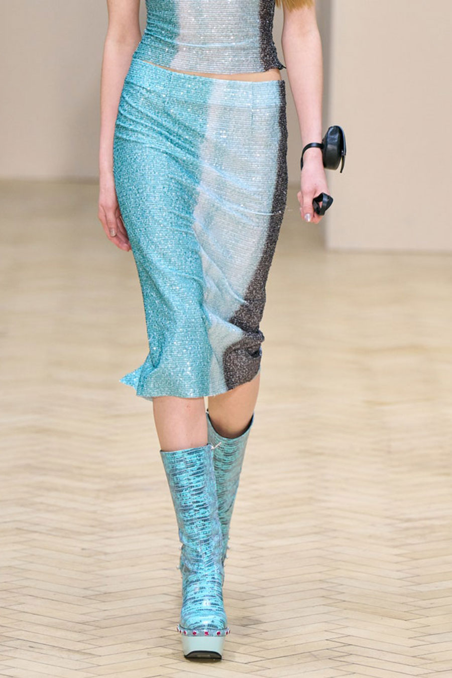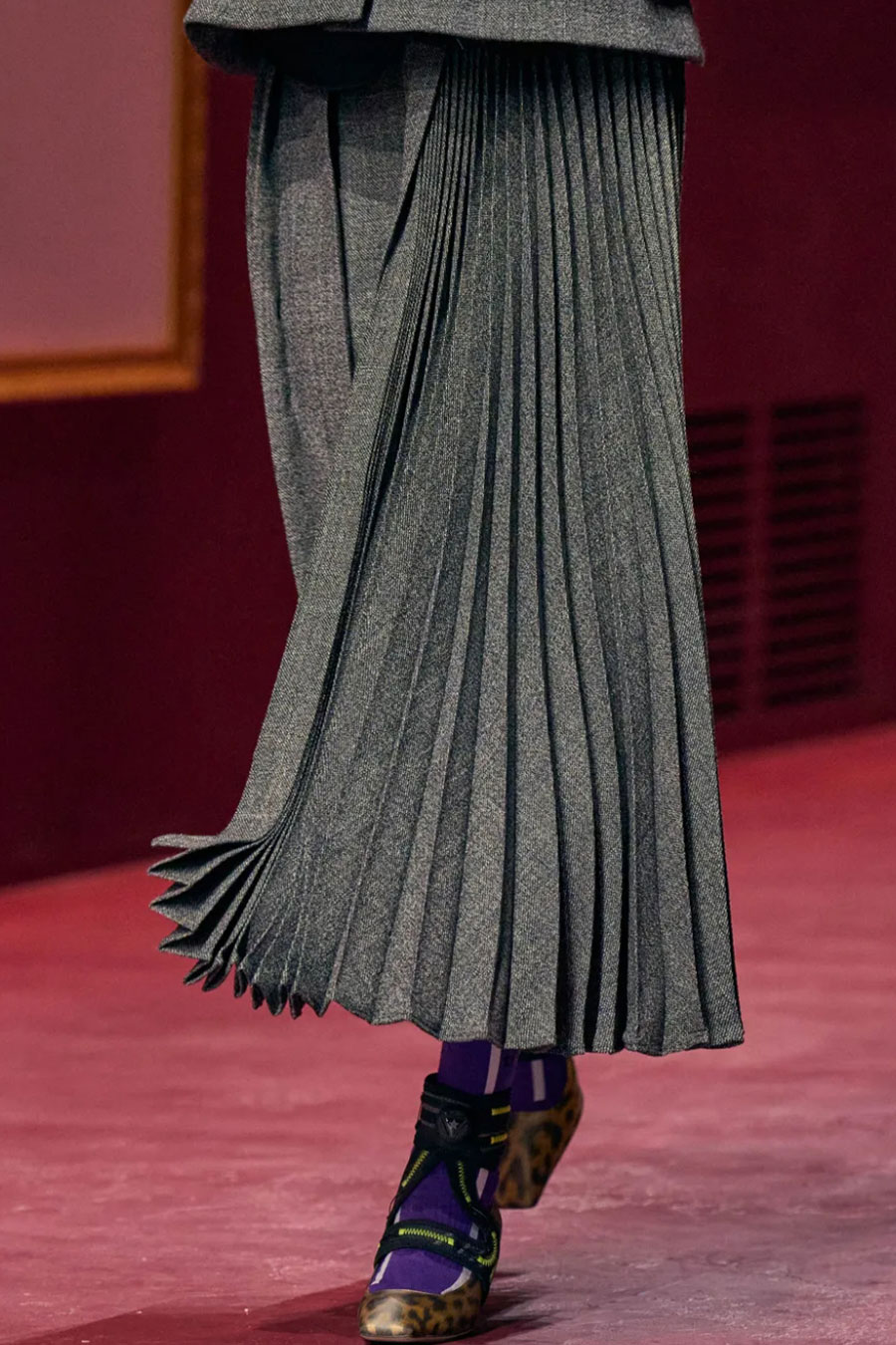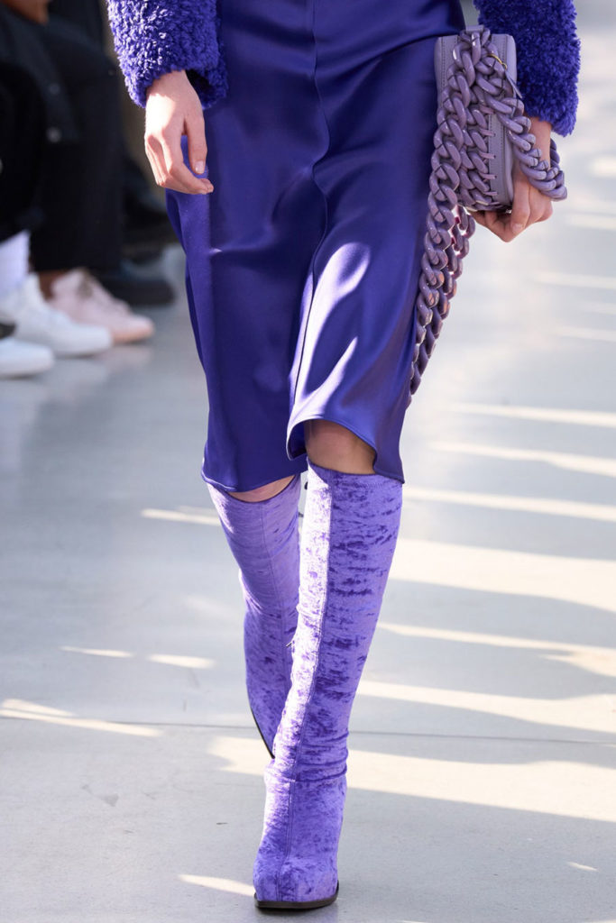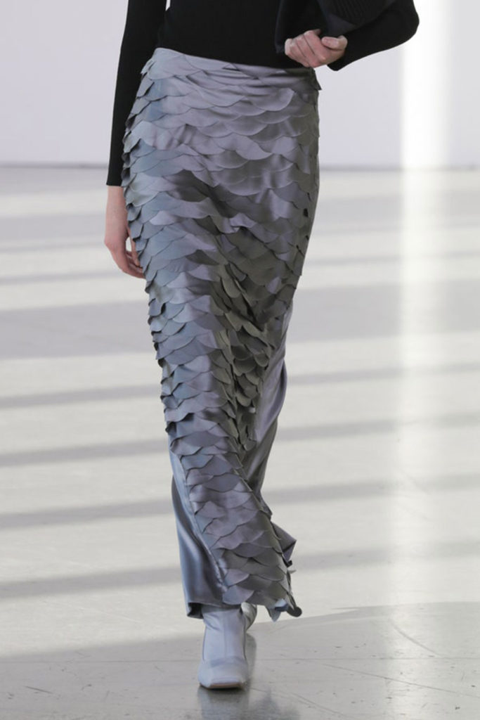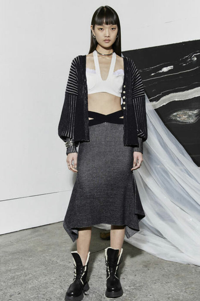 For FW22, mini skirts represent the vast majority of the category assortment, with 536 looks and a growth of +34%, this piece offers multiple possibilities for experimentation: from the preppy minis in tweed to rebellious raw edges and low wait-lines. Clean, fitted lines in the form of pencil skirts or even longer column silhouettes are enhanced with daring slits or feminine drapes and find appreciation amongst designers and audiences. Slightly decreasing but still making a statement, pleats are a piece to invest in: with designs ranging from elegant plissee skirts to academic sporty interpretations for the tennis club.