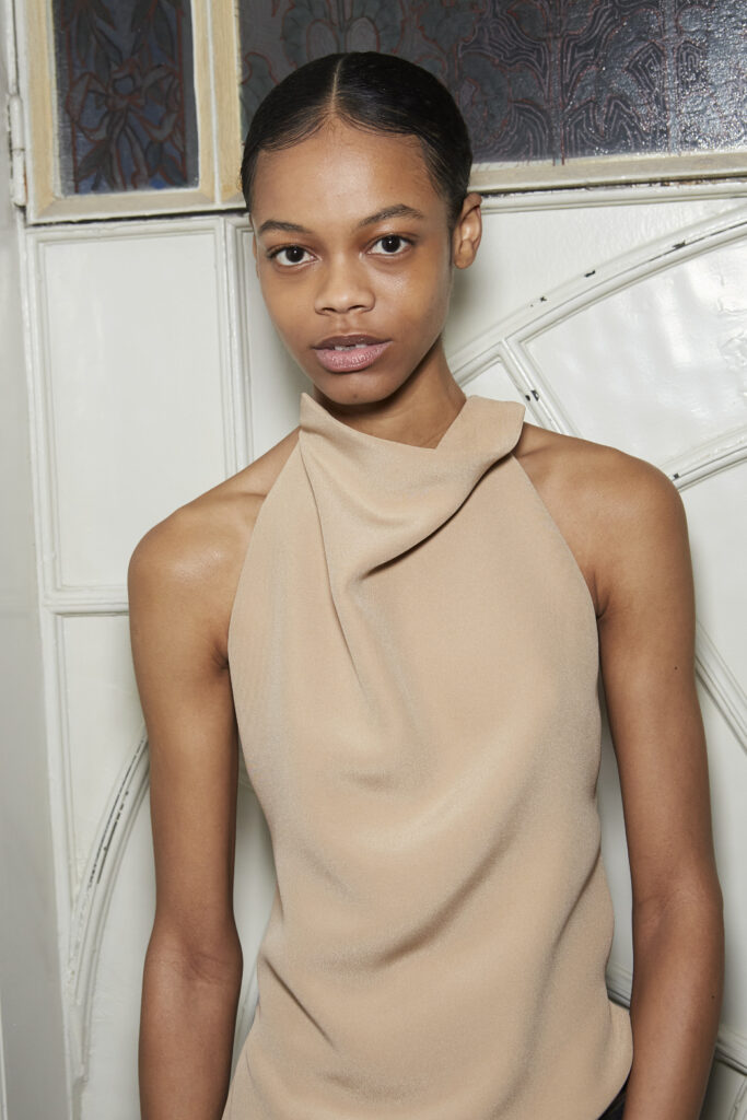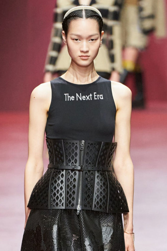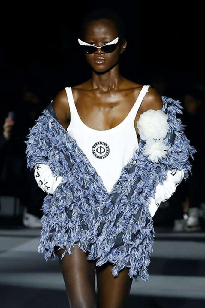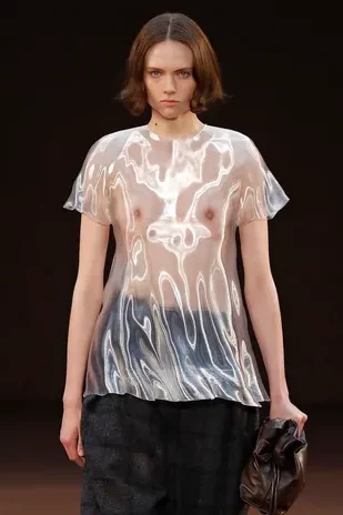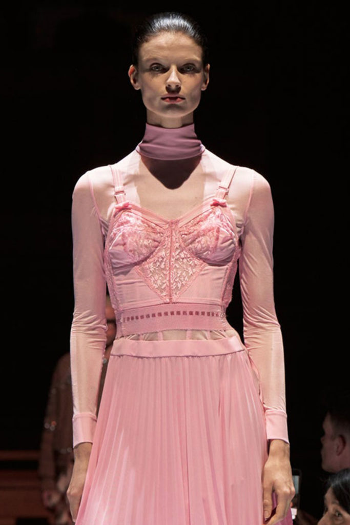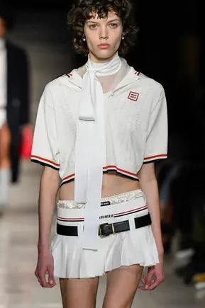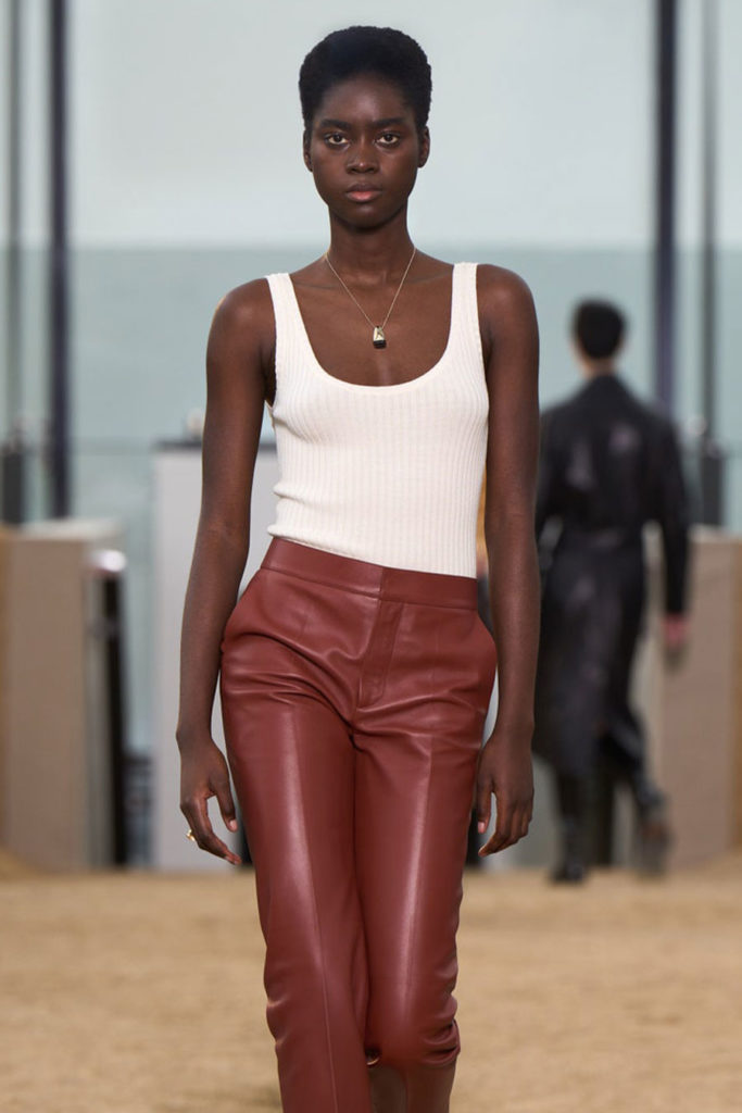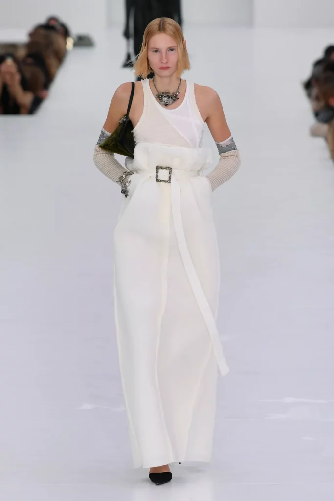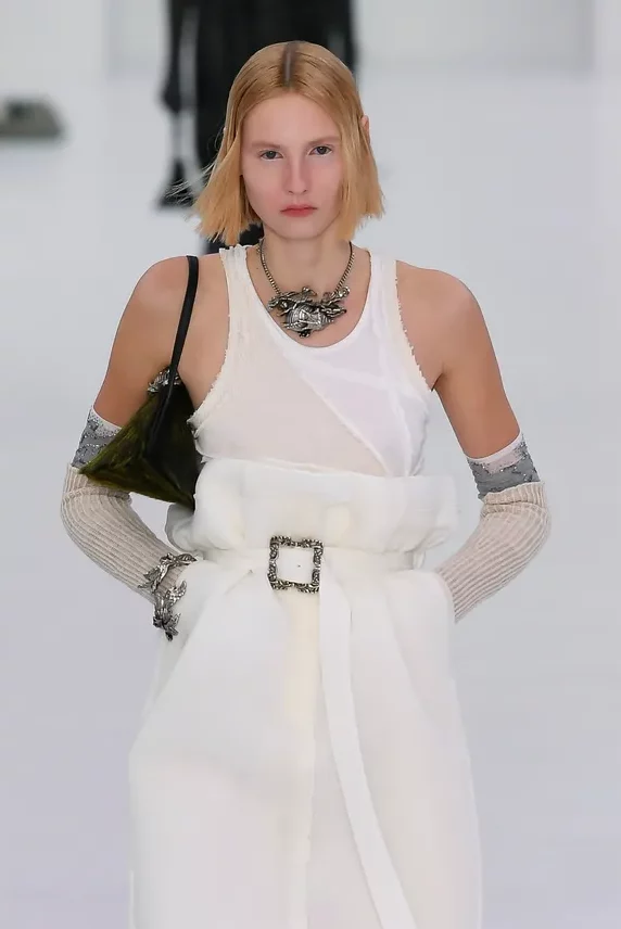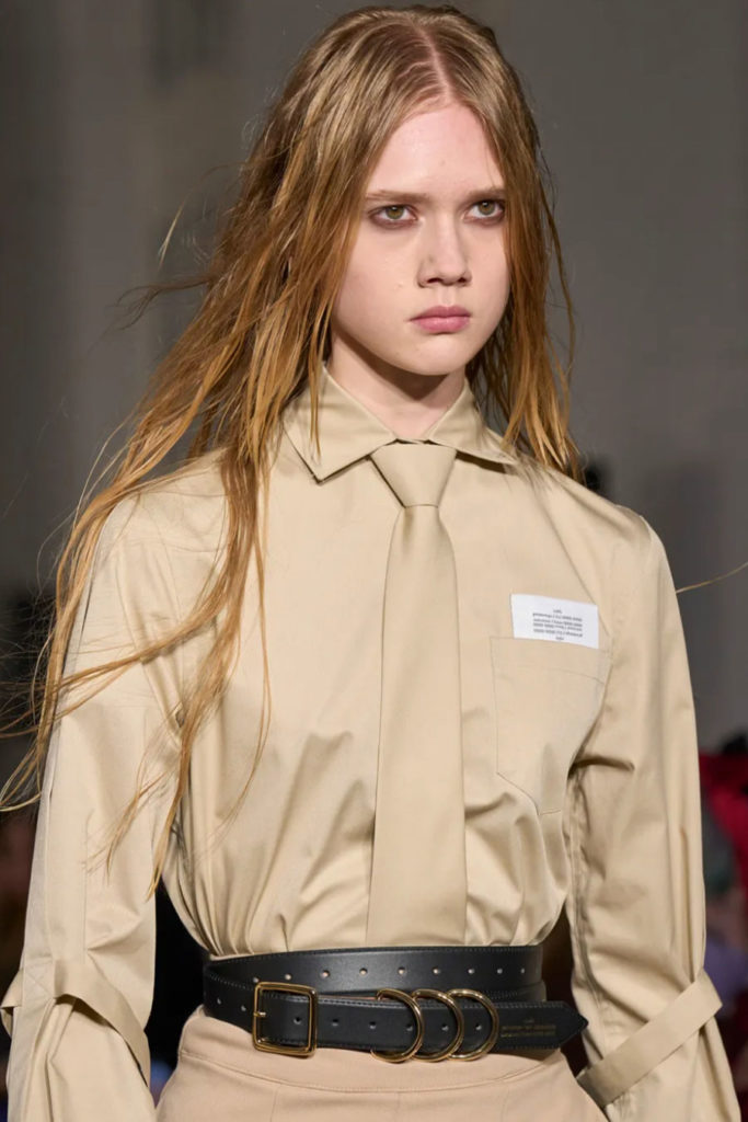 Fashion is the medium through which people can express their personality and affirm their identity. It is about adding a layer to our naked body with a cover that can speak for us non-verbally. Maximalist strategies can be a communicative vehicle, yet sometimes the simplest element can also embed strong meanings inside them. This season, the stand-alone tank top, a piece that is as neutral, minimal and almost anonymous as possible in its simplicity. It has been the protagonist of the main shows and particularly discussed on the Prada runway. The tank stands out as a symbol of pragmatism, but appears to turn into a reflection of vain luxury now. At the same time, for tops, the dominant Y2K aesthetic maintains the bralette as one of the highlights, next to newer corset interpretations. This showcase of the undressing trend enhances femininity in a more dominant, self-assured manner. Next to that, feminine blouses with frivolous details show historic collars next to puffy sleeves. In this deep ocean of detailed pieces, the tank, high turtleneck and shirt, represent a genderless moment, a blank canvas from which to start again.