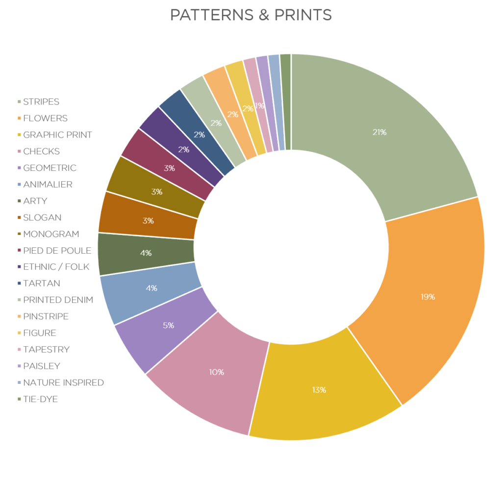 Animal remains a staple print, gaining +14% YOY and representing 4% of the overall range. Arty prints are adding painted or digital effects to the shows and gained +6,5% in visibility.