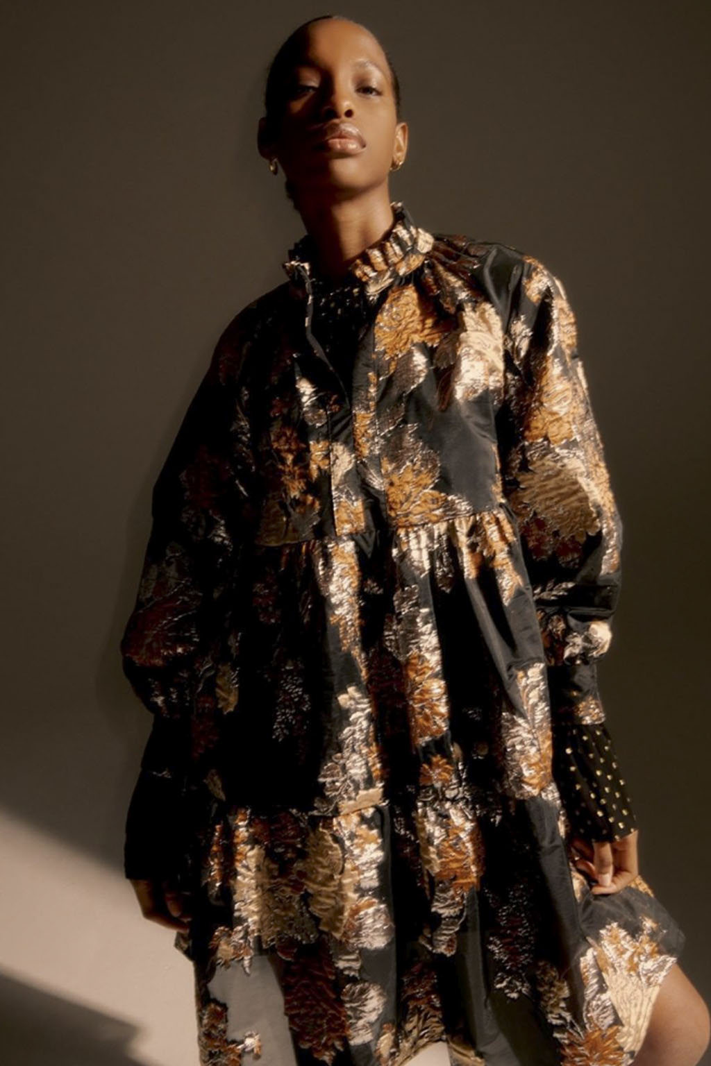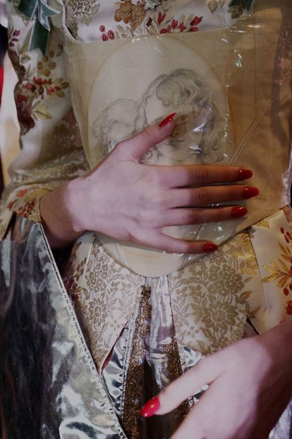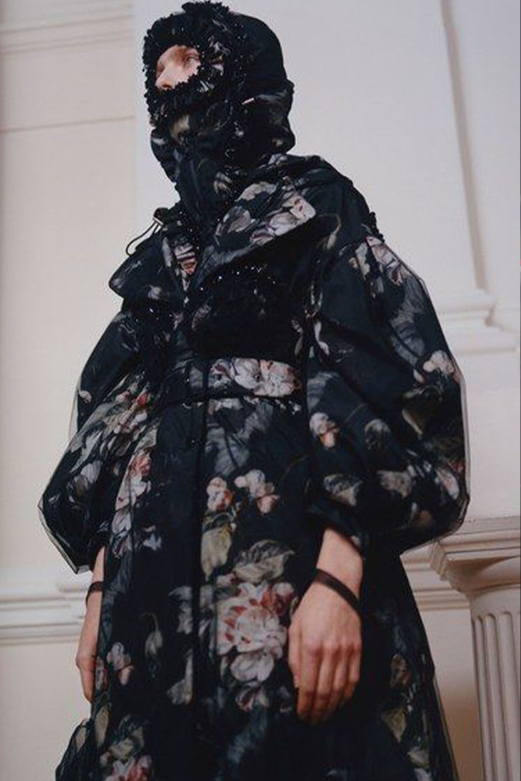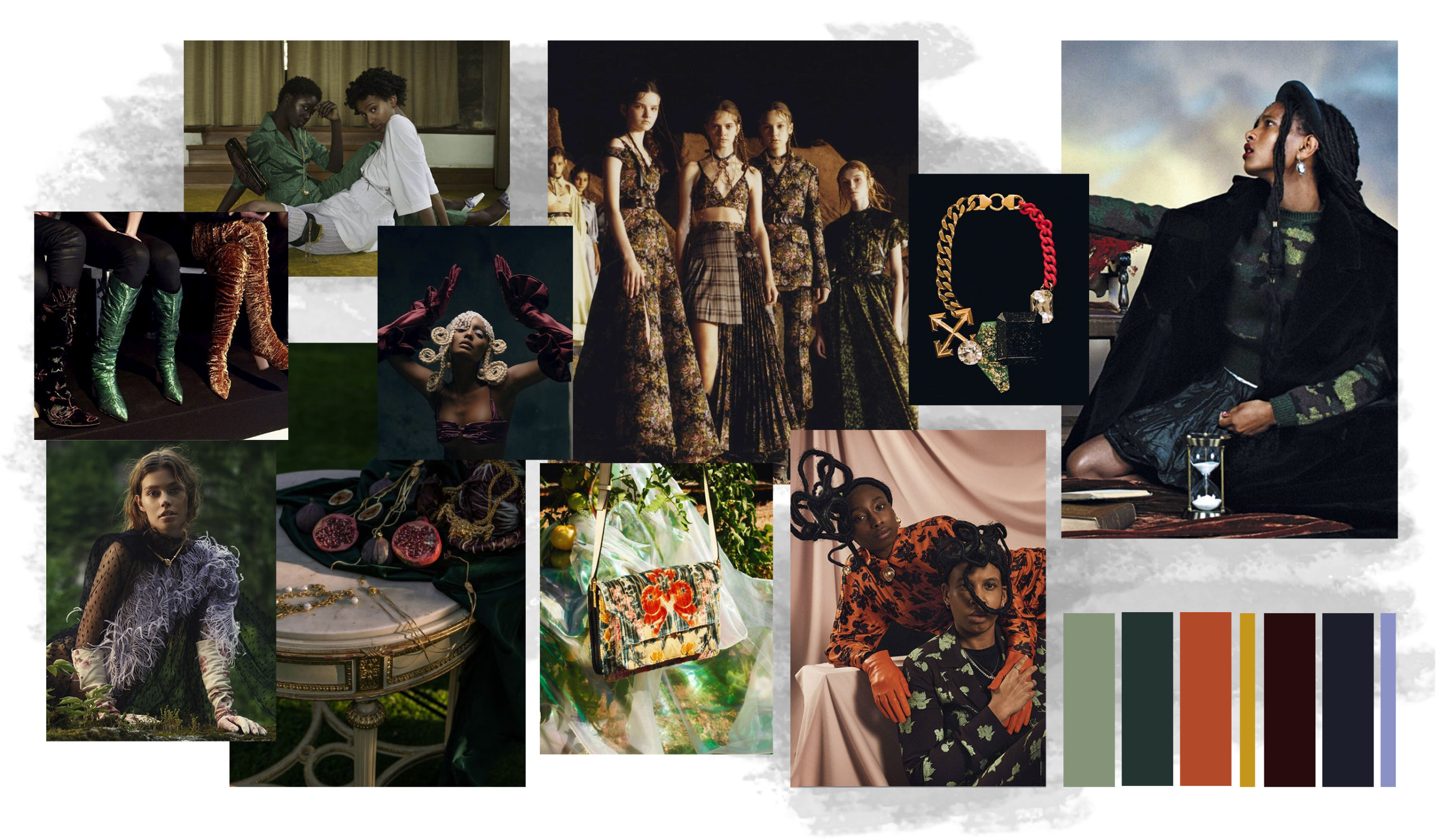This concept is not only sparking exuberant creativity for prints and trims to enrich classic outerwear and knitwear, that are essential for FW seasons – at the same time it offers great potential for festive collections due to the pronounced elegance and focus on dress and tailoring styles. Regarding the collection’s palette, Hybrid Historics is exploiting the extensive range of archive references. The color scheme is harmoniously balancing deep and indulgent darks with expressive color pops. The array of new darks extends the classical, evening-attire black to burgundy, dark botanical greens and deep purples. The brighter tones include digital lilac, new green sages, and pigmented orange and red. They are highly effective in patterns on dark surfaces with roses, florals, interior prints or spacey camouflage as graphical designs. Other prints are seeking to reference historic art and seek out for paintings, poems and etchings, as well as tapestry or brocade, as inspiration. For novelty, those nostalgic motifs can be merged with futuristically blurry effects or digitally enriched palettes. In terms of fabric, the trend similarly includes a symbiosis of textile qualities, reflecting the hybrid approach. Heavy interior fabrics, velvet and jacquards offer more sturdy options for outerwear, while satins, silks and sheers ( also with lace or embroidery finish) add a sense of lightness and lucidity. Traditional materials, such as prince of whales or pinstripes might also be added to spark a twisted hue with rebellion and goth boldness.
