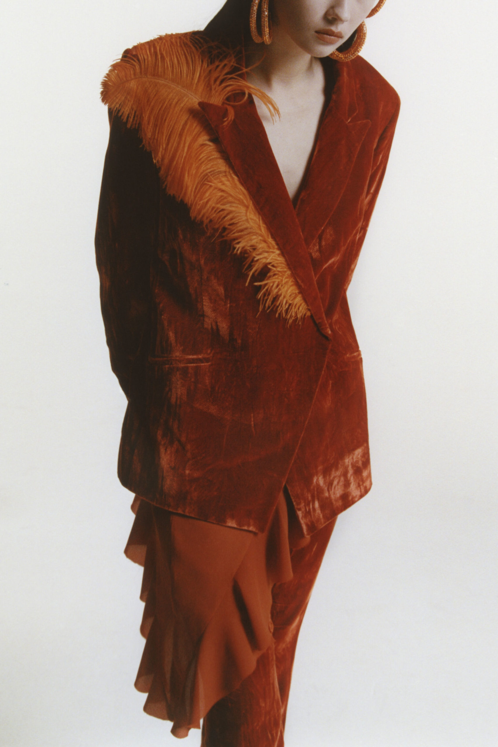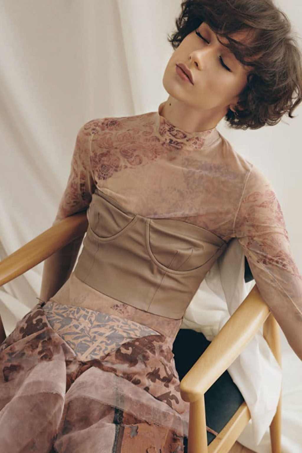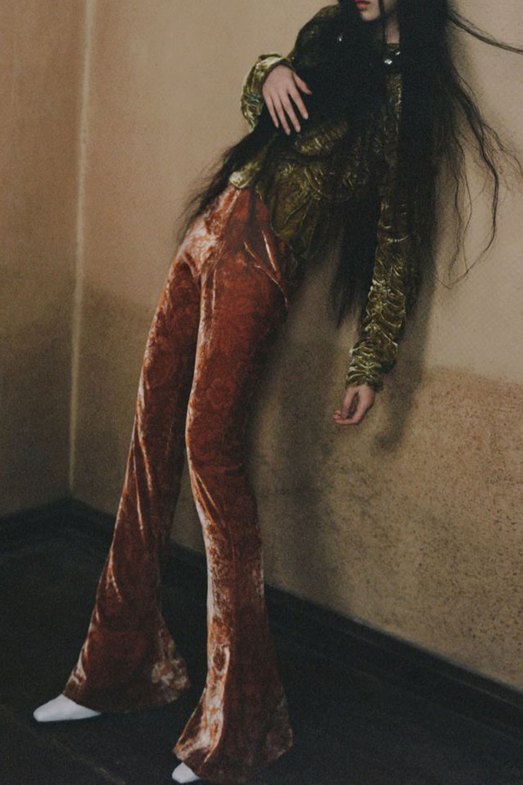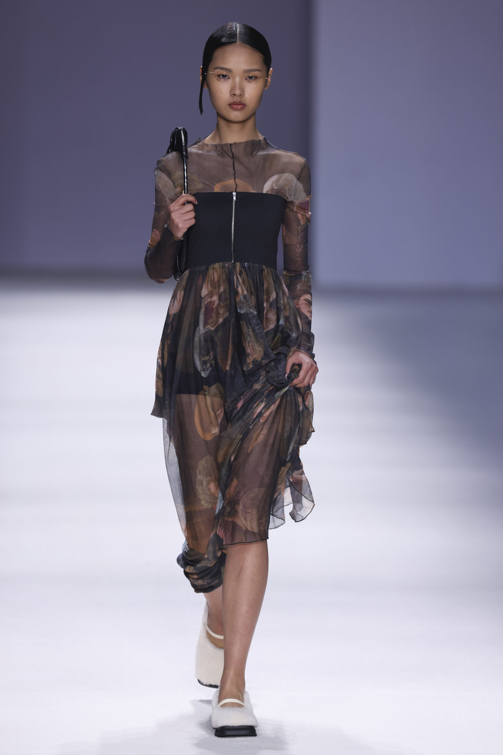This concept is not only sparking exuberant creativity for prints and trims to enrich classic outerwear and knitwear, that are essential for FW seasons – at the same time it offers great potential for festive collections due to the pronounced elegance and focus on dress and tailoring styles. Regarding the collection’s palette, Hybrid Historics is exploiting the extensive range of archive references. The color scheme is harmoniously balancing deep and indulgent darks with expressive color pops. The array of new darks extends the classical, evening-attire black to burgundy, dark botanical greens and deep purples. The brighter tones include digital lilac, new green sages, and pigmented orange and red. They are highly effective in patterns on dark surfaces with roses, florals, interior prints or spacey camouflage as graphical designs. Other prints are seeking to reference historic art and seek out for paintings, poems and etchings, as well as tapestry or brocade, as inspiration. For novelty, those nostalgic motifs can be merged with futuristically blurry effects or digitally enriched palettes. In terms of fabric, the trend similarly includes a symbiosis of textile qualities, reflecting the hybrid approach. Heavy interior fabrics, velvet and jacquards offer more sturdy options for outerwear, while satins, silks and sheers ( also with lace or embroidery finish) add a sense of lightness and lucidity. Traditional materials, such as prince of whales or pinstripes might also be added to spark a twisted hue with rebellion and goth boldness.