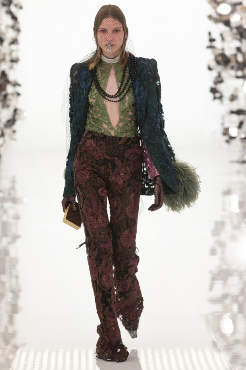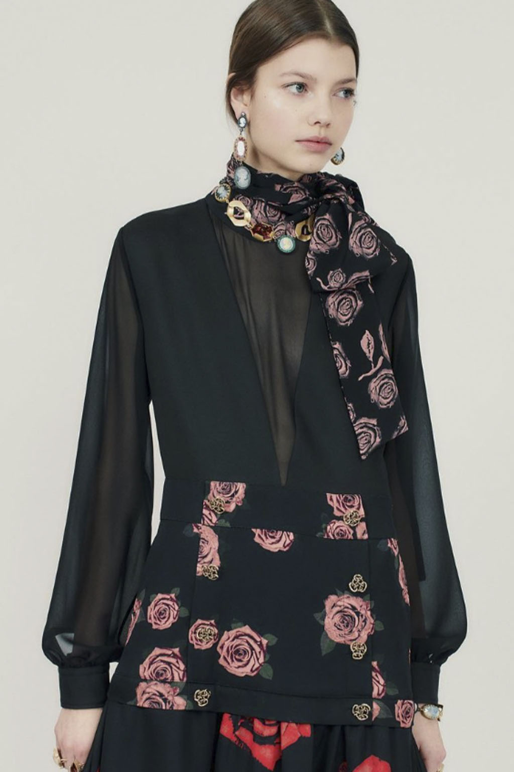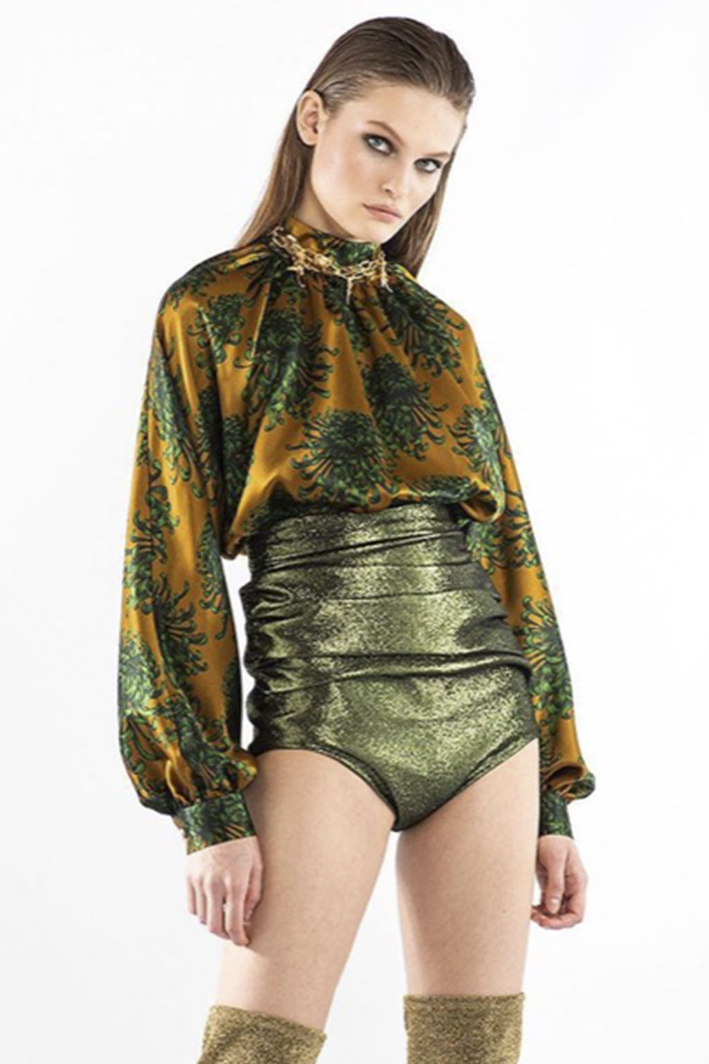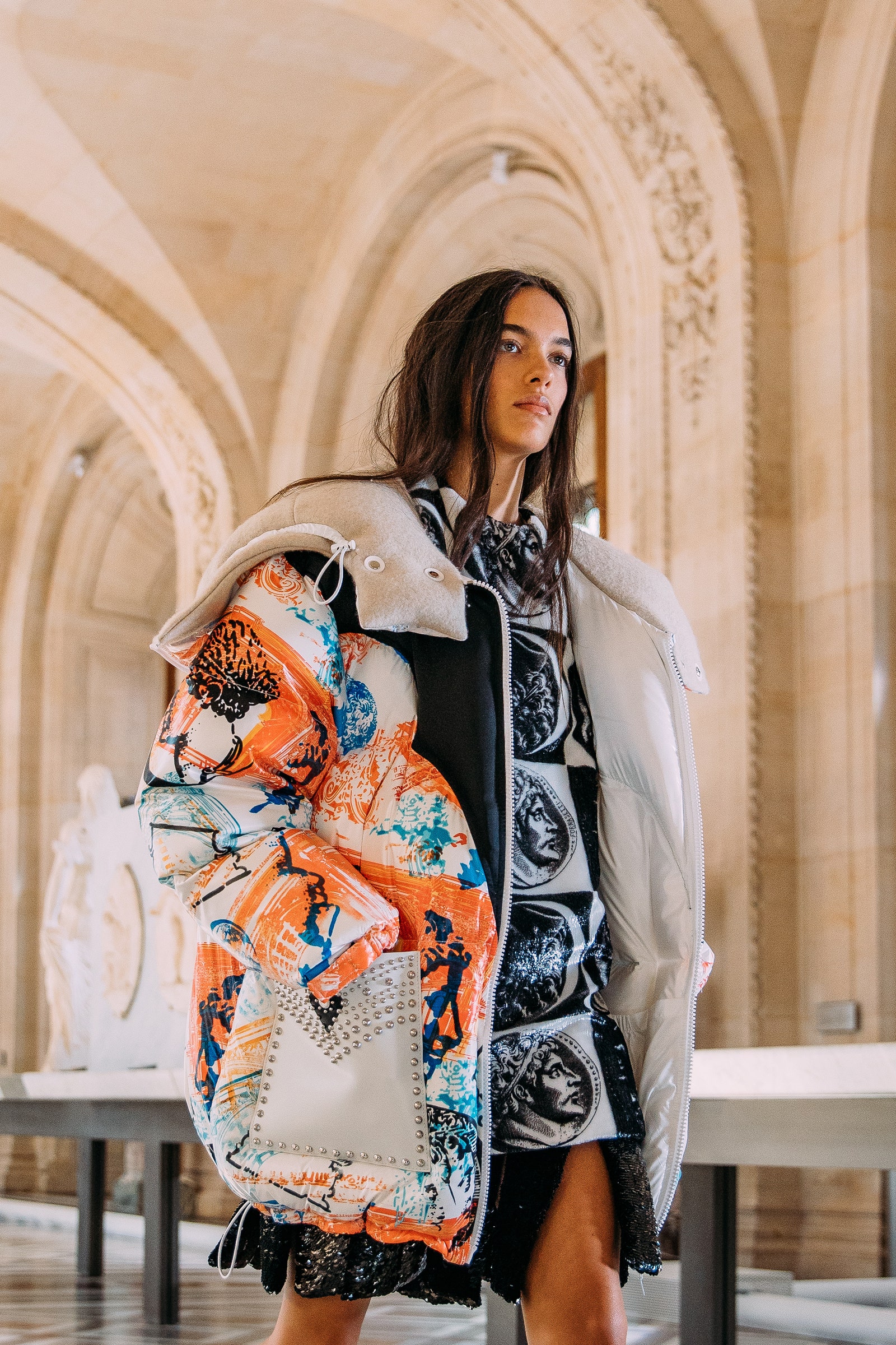 This concept is not only sparking exuberant creativity for prints and trims to enrich classic outerwear and knitwear, that are essential for FW seasons – at the same time it offers great potential for festive collections due to the pronounced elegance and focus on dress and tailoring styles. Regarding the collection’s palette, Hybrid Historics is exploiting the extensive range of archive references. The color scheme is harmoniously balancing deep and indulgent darks with expressive color pops. The array of new darks extends the classical, evening-attire black to burgundy, dark botanical greens and deep purples. The brighter tones include digital lilac, new green sages, and pigmented orange and red. They are highly effective in patterns on dark surfaces with roses, florals, interior prints or spacey camouflage as graphical designs. Other prints are seeking to reference historic art and seek out for paintings, poems and etchings, as well as tapestry or brocade, as inspiration. For novelty, those nostalgic motifs can be merged with futuristically blurry effects or digitally enriched palettes. In terms of fabric, the trend similarly includes a symbiosis of textile qualities, reflecting the hybrid approach. Heavy interior fabrics, velvet and jacquards offer more sturdy options for outerwear, while satins, silks and sheers ( also with lace or embroidery finish) add a sense of lightness and lucidity. Traditional materials, such as prince of whales or pinstripes might also be added to spark a twisted hue with rebellion and goth boldness.