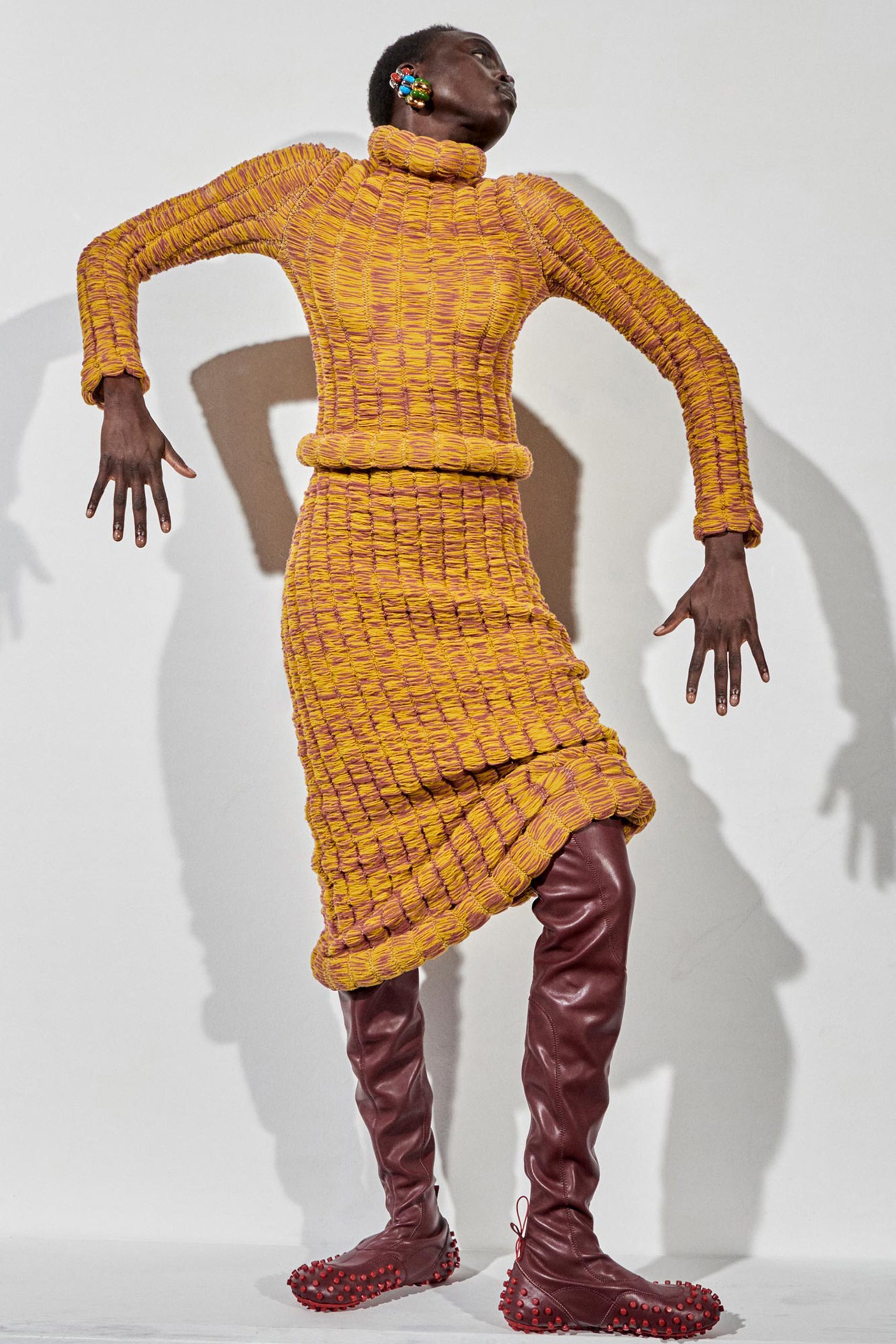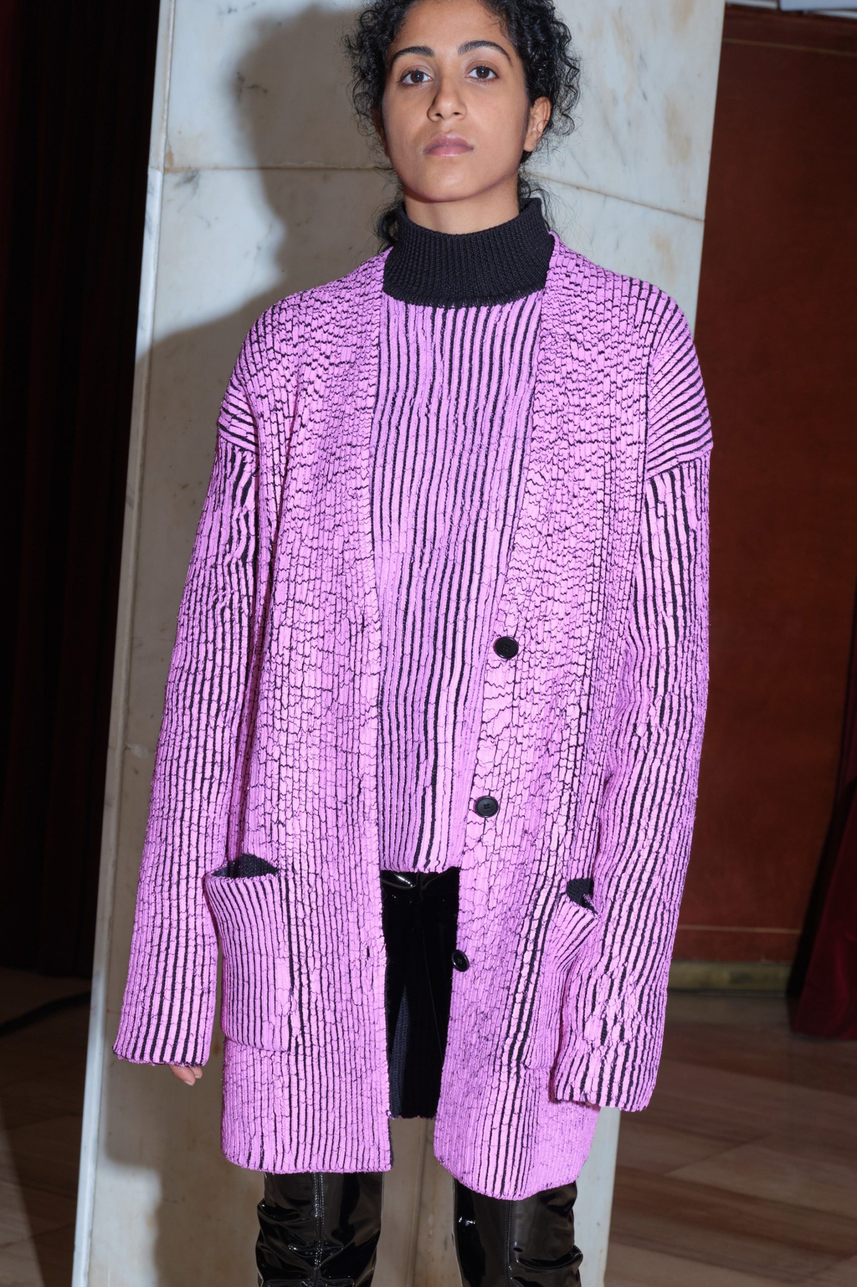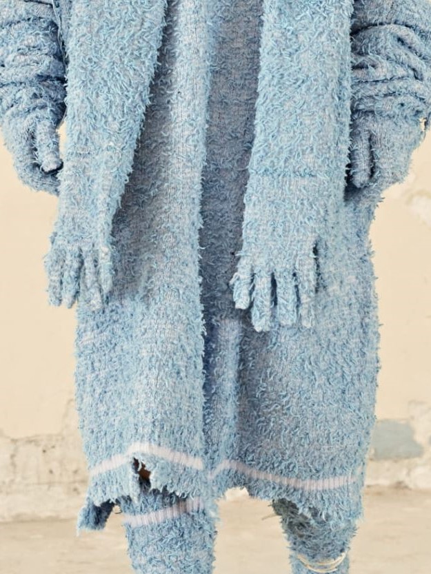 In second place is the trend of furry, carded, soft yarns that envelop the body in reassuring cuddles. Our Livetrend Tracker spotted new signs in terry stitches and more rustic aspects in soft, pastel colors, as per Acne Studio.