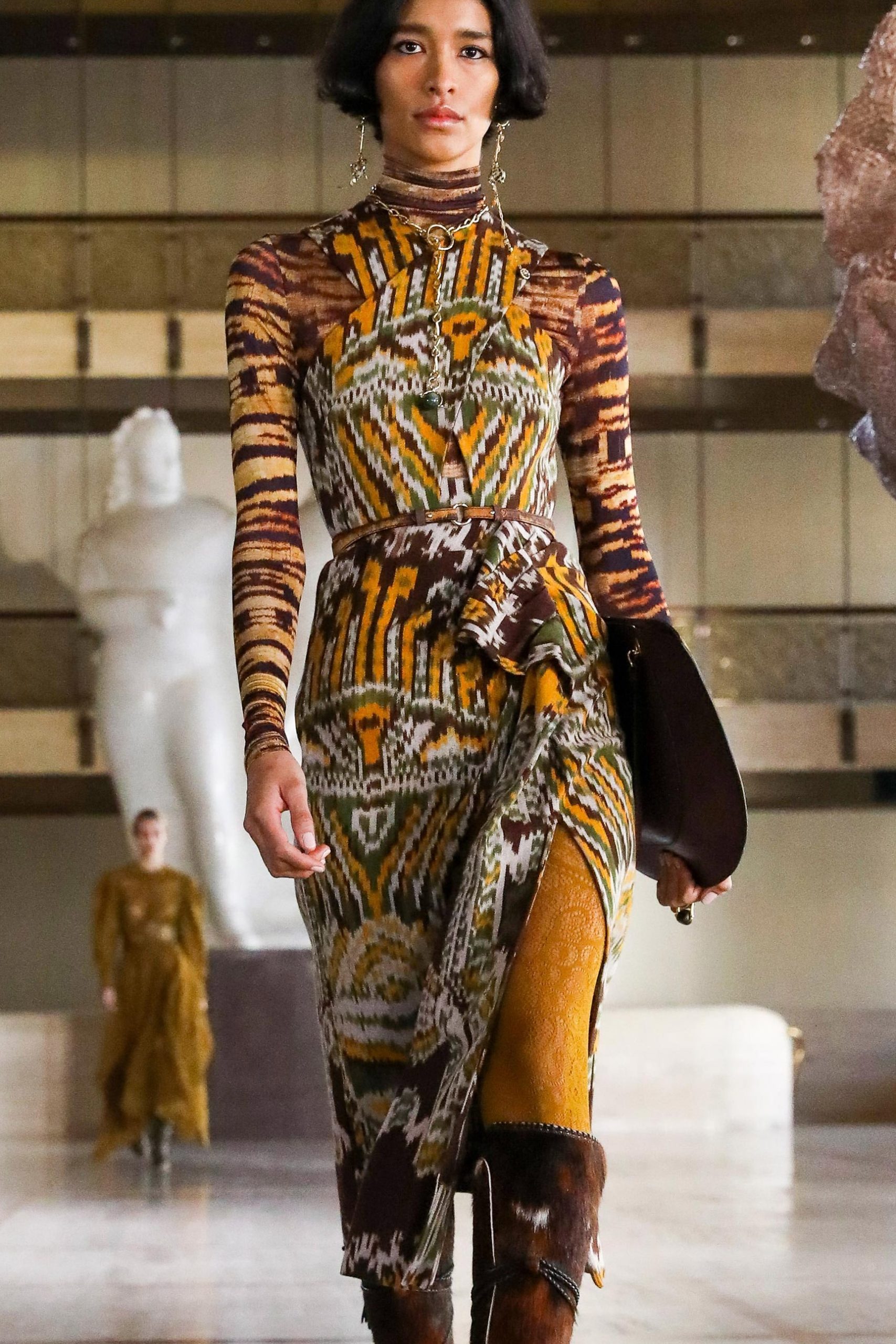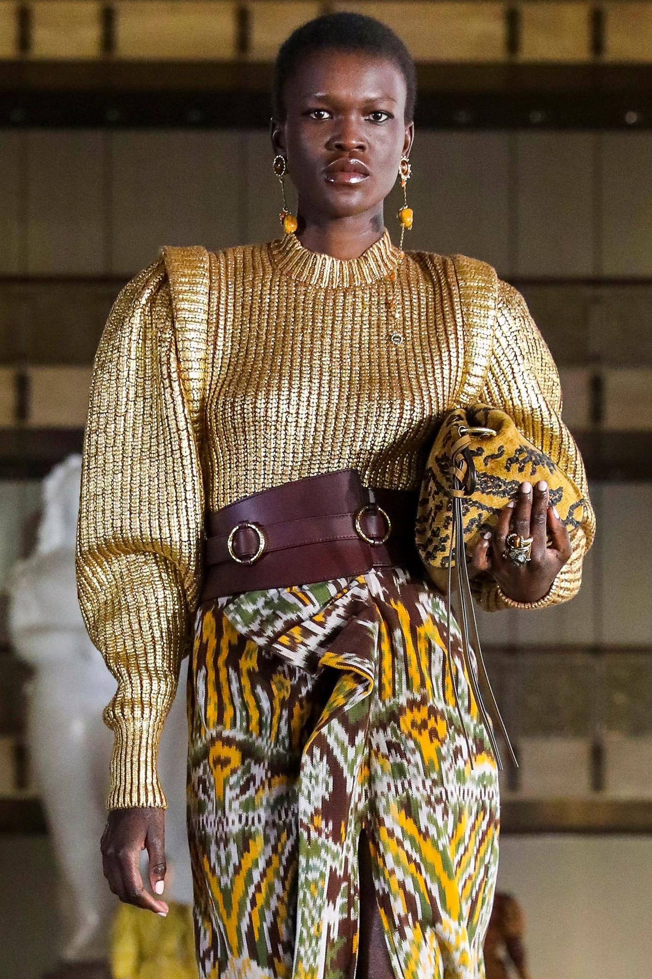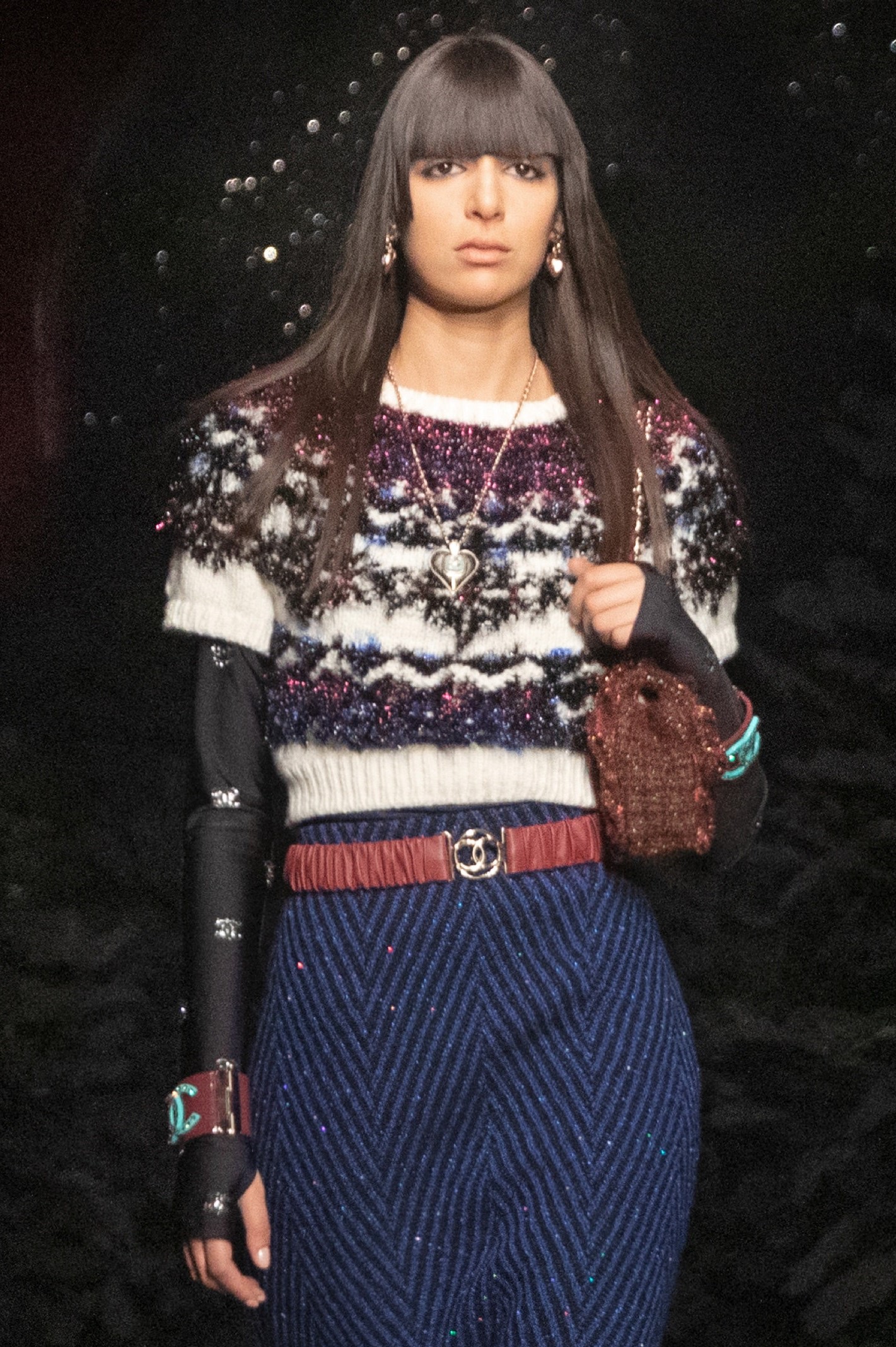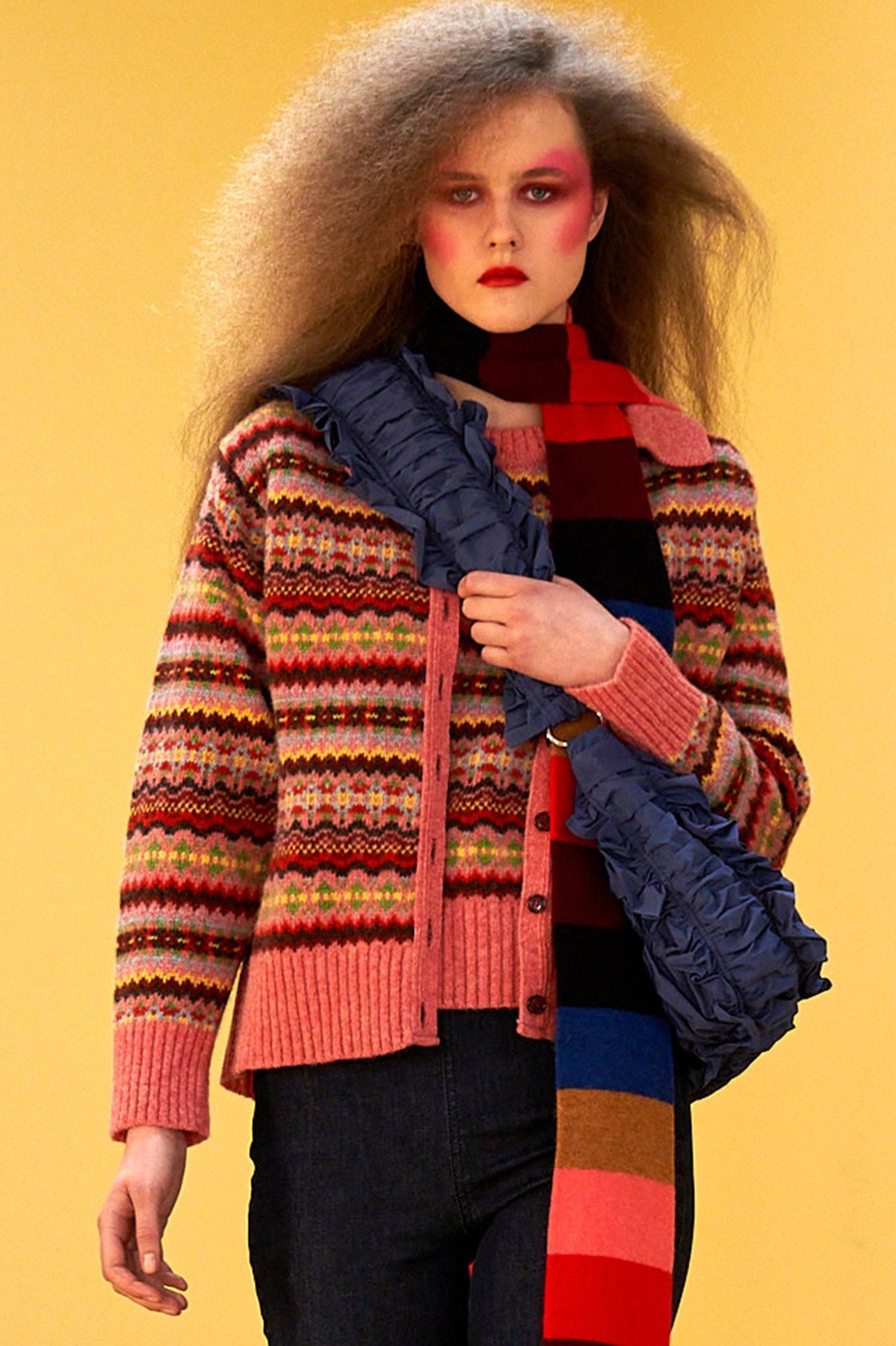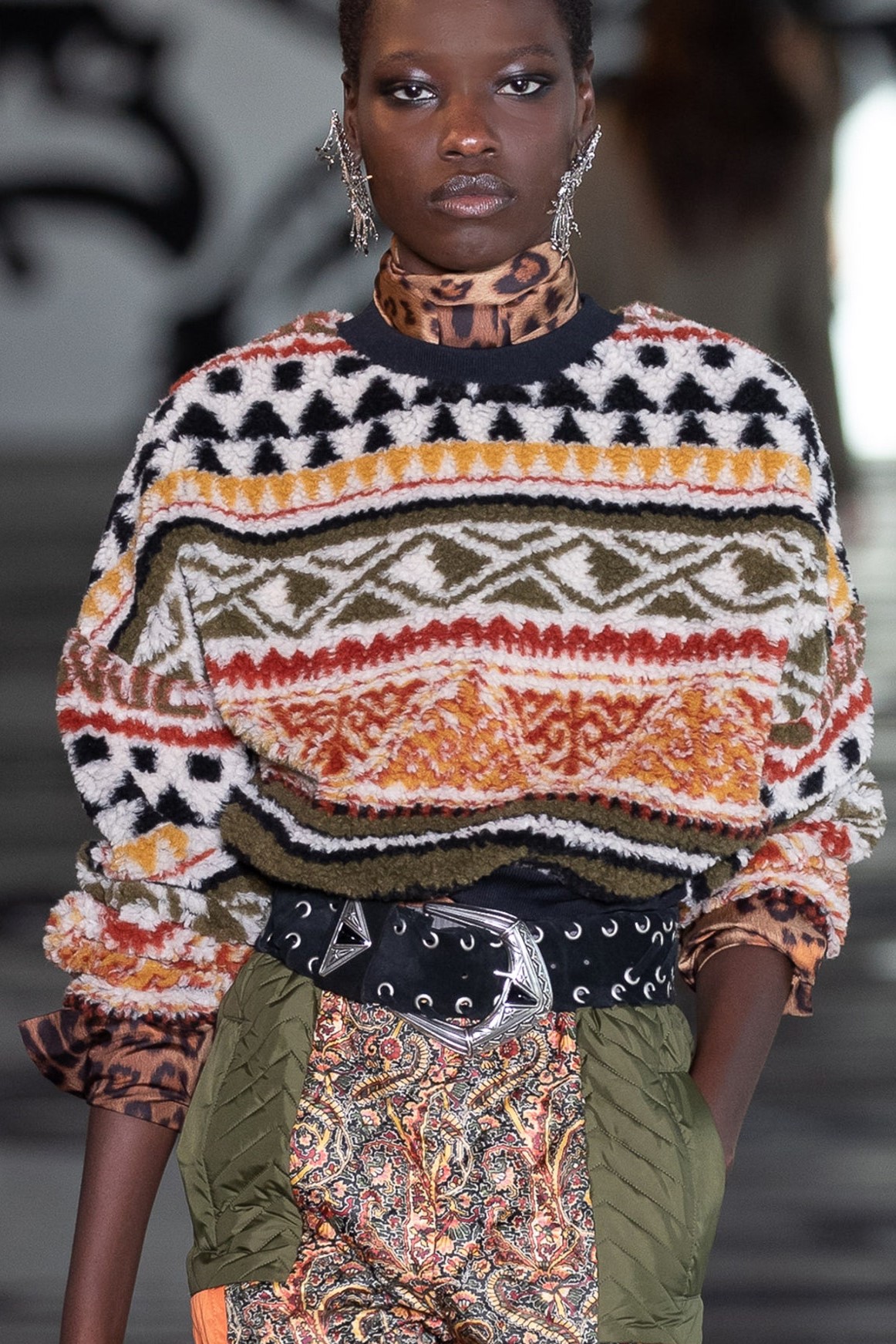 Geometric motifs and striped effects go as far as psychadelic distortions. The important thing is that the knit brings patterns and texture to the look. Fancy knitting is considered here as an artistic expression, of a craftsmanship, of an ancestral savoir faire of a native culture.