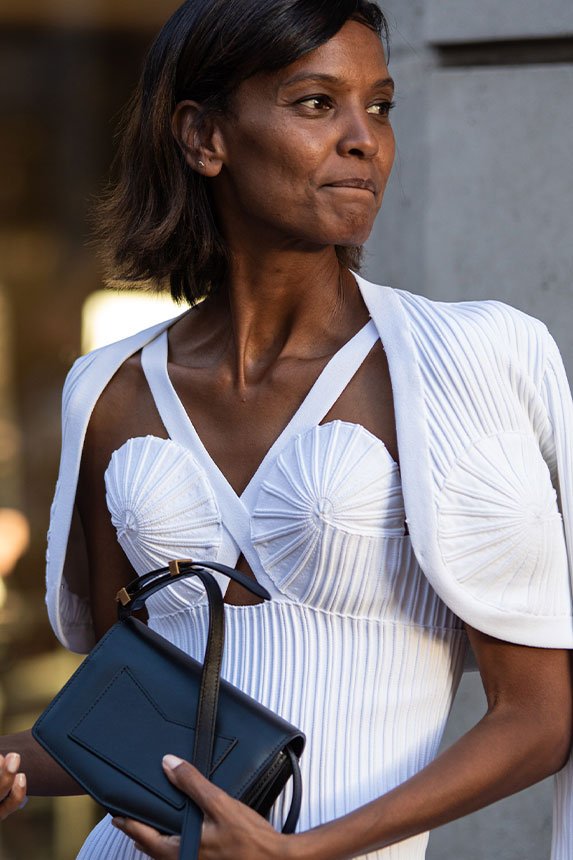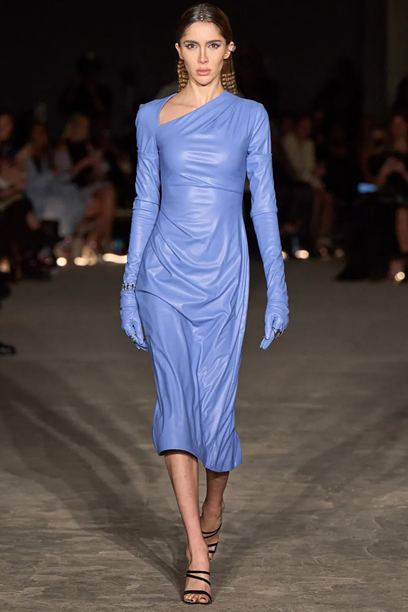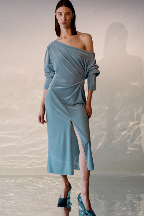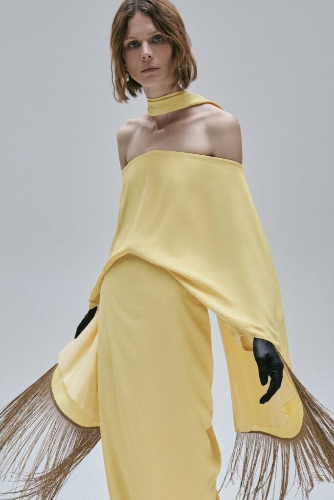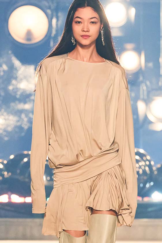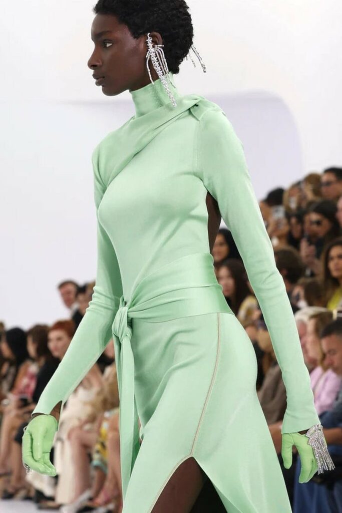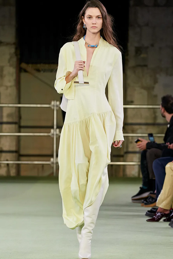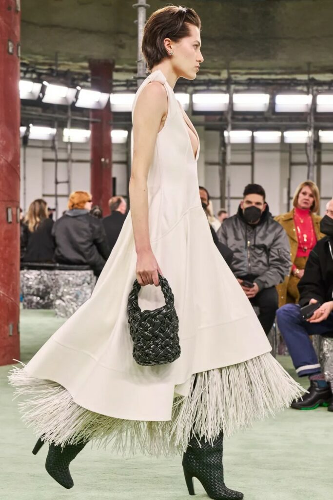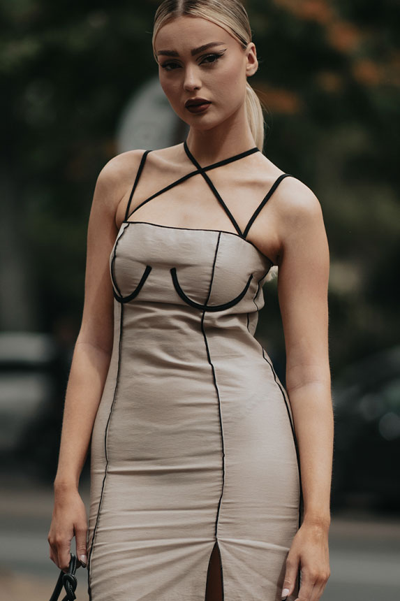 FW23 is full of beautiful new details. For the dress category, the next winter season is set to explore highly comfortable and versatile styles with elevating details on a larger scale. The fitted silhouette is still leading, though new drapes and twists are loosening up the silhouette and introduce more movement to the hyper-tight dresses of the recent post-pandemic momentum. Long sleeves are adding sophistication to mini and slip dresses. But the seduction of previous season remains. New lingerie looks embrace fuller skirts from volant and asymmetric lace drapes, while corsets are updated with more subtle chest-placed inserts. For women’s daily business, all-occasion dresses are moving in focus. From dressy slimline shapes with power shoulders that can move easily from business to evening to rather unfamiliar long jersey styles with lower waistlines, the minimal and flattering all-day dress is an intriguing novelty for FW23.