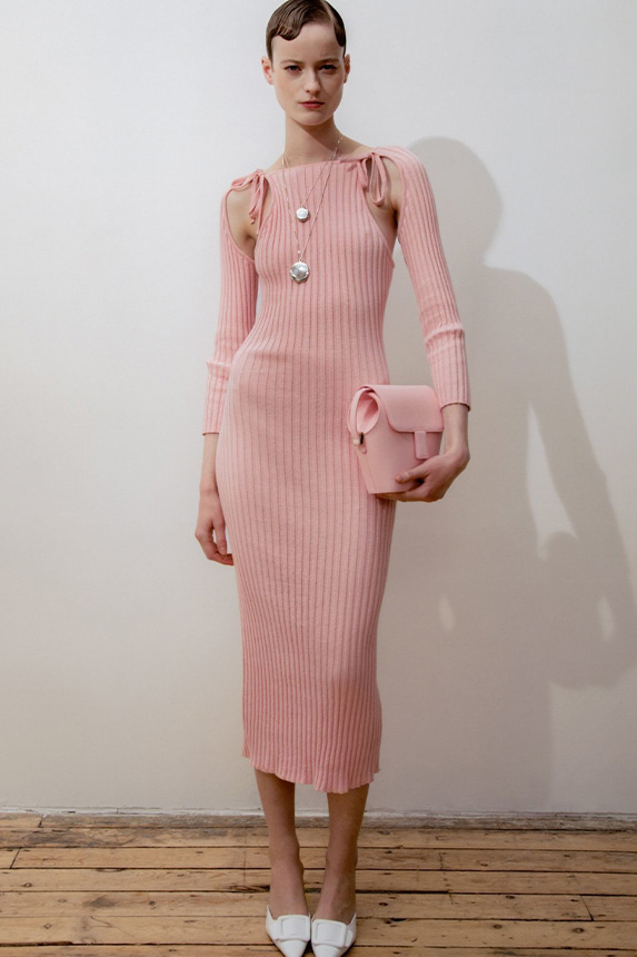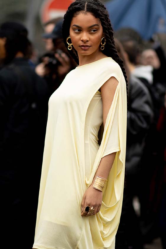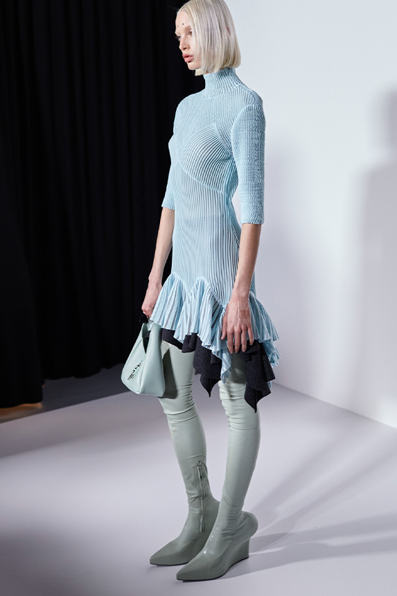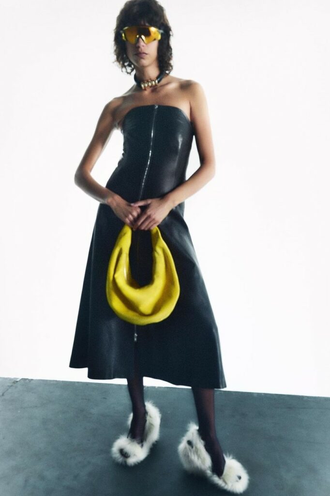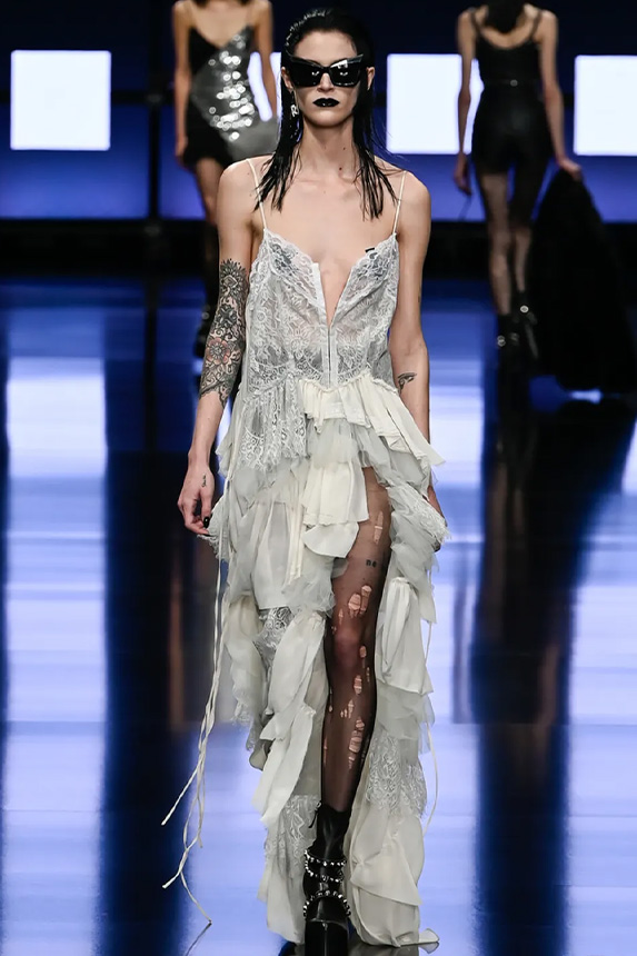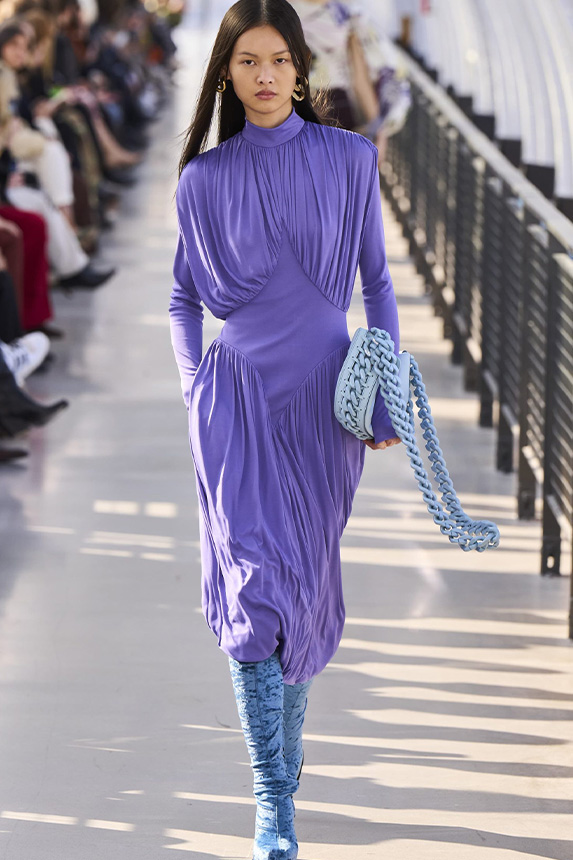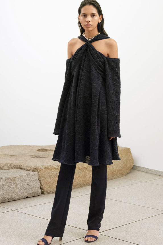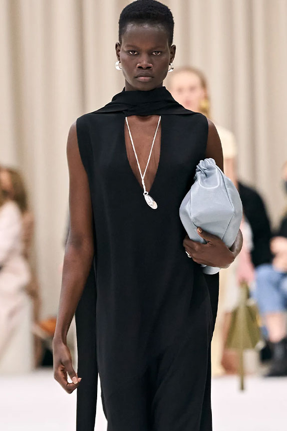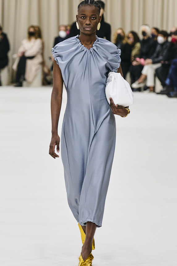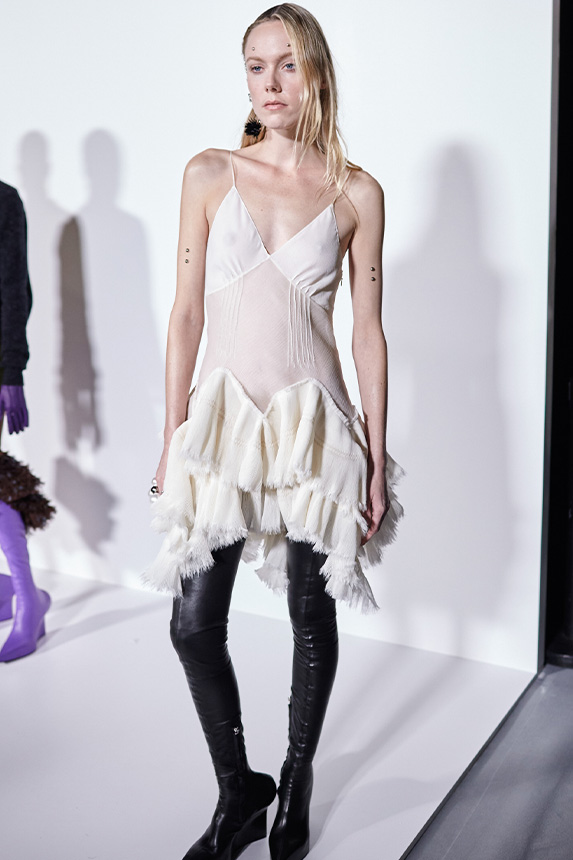 FW23 is full of beautiful new details. For the dress category, the next winter season is set to explore highly comfortable and versatile styles with elevating details on a larger scale. The fitted silhouette is still leading, though new drapes and twists are loosening up the silhouette and introduce more movement to the hyper-tight dresses of the recent post-pandemic momentum. Long sleeves are adding sophistication to mini and slip dresses. But the seduction of previous season remains. New lingerie looks embrace fuller skirts from volant and asymmetric lace drapes, while corsets are updated with more subtle chest-placed inserts. For women’s daily business, all-occasion dresses are moving in focus. From dressy slimline shapes with power shoulders that can move easily from business to evening to rather unfamiliar long jersey styles with lower waistlines, the minimal and flattering all-day dress is an intriguing novelty for FW23.
