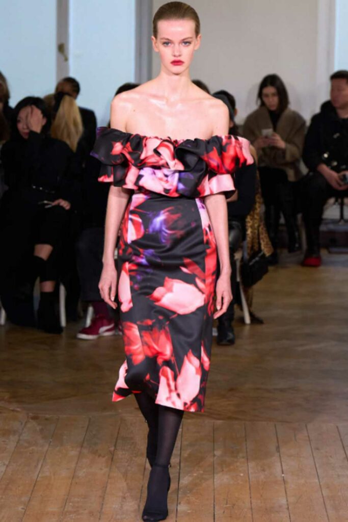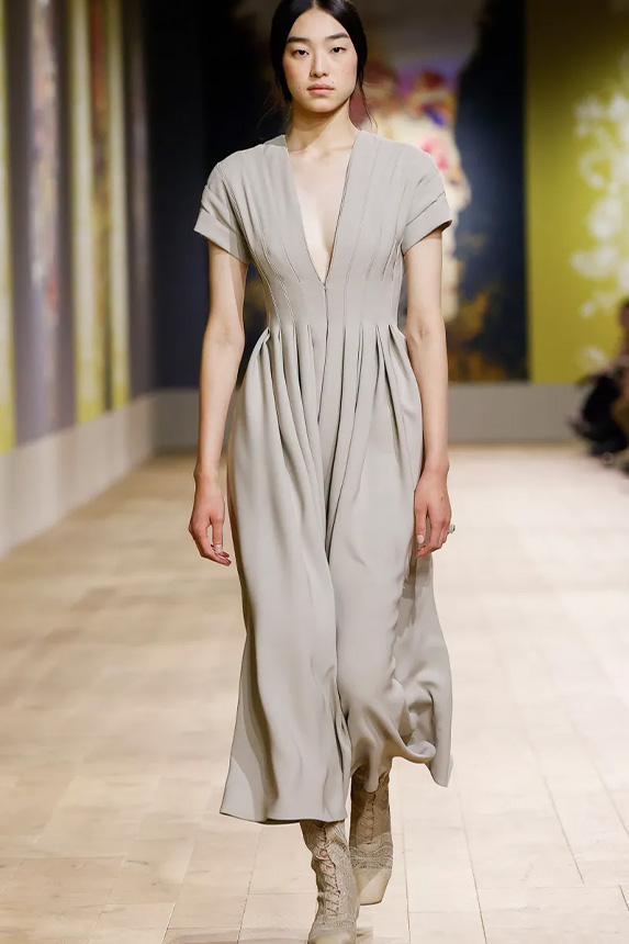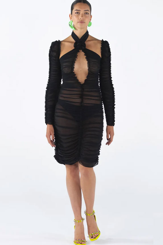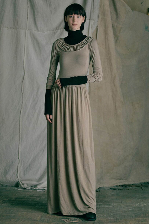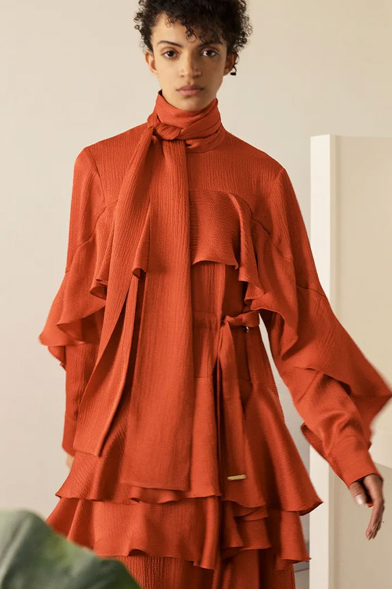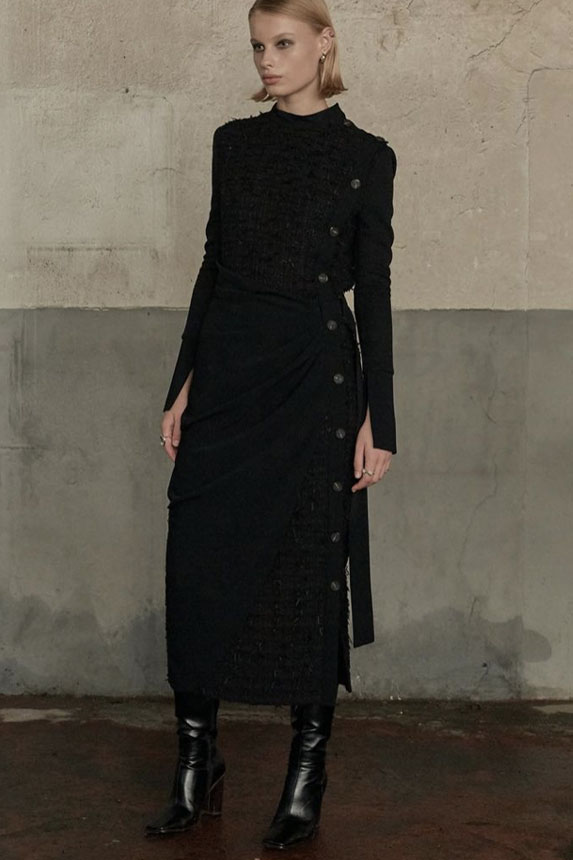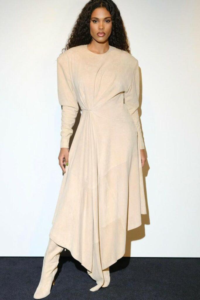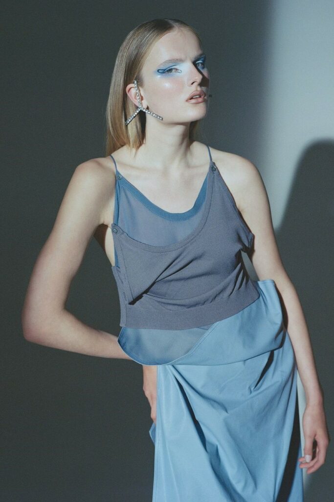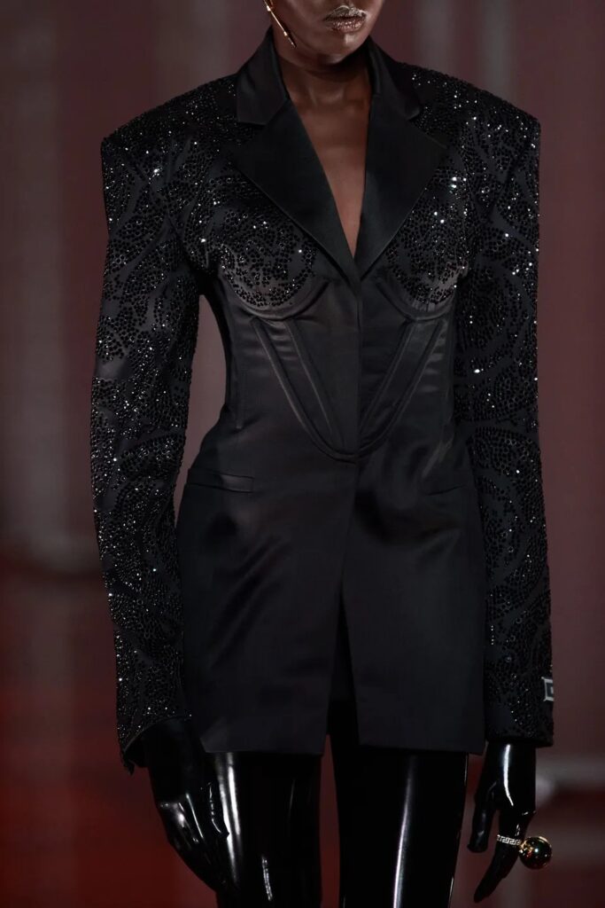 FW23 is full of beautiful new details. For the dress category, the next winter season is set to explore highly comfortable and versatile styles with elevating details on a larger scale. The fitted silhouette is still leading, though new drapes and twists are loosening up the silhouette and introduce more movement to the hyper-tight dresses of the recent post-pandemic momentum. Long sleeves are adding sophistication to mini and slip dresses. But the seduction of previous season remains. New lingerie looks embrace fuller skirts from volant and asymmetric lace drapes, while corsets are updated with more subtle chest-placed inserts. For women’s daily business, all-occasion dresses are moving in focus. From dressy slimline shapes with power shoulders that can move easily from business to evening to rather unfamiliar long jersey styles with lower waistlines, the minimal and flattering all-day dress is an intriguing novelty for FW23.