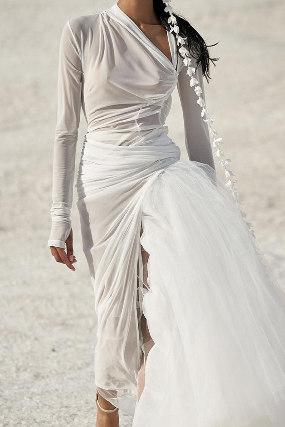 Details can be a powerful tool for the next season to spice up the iconic slimmer silhouette. Show-stopping trains, experimental twists from halters to the waistlines and animations for sleeves, like capes or 1-arm-asymmetries are just some of the season’s highlights. Check the Livetrend selection below for guidance and inspiration to create a winning FW23 assortment: