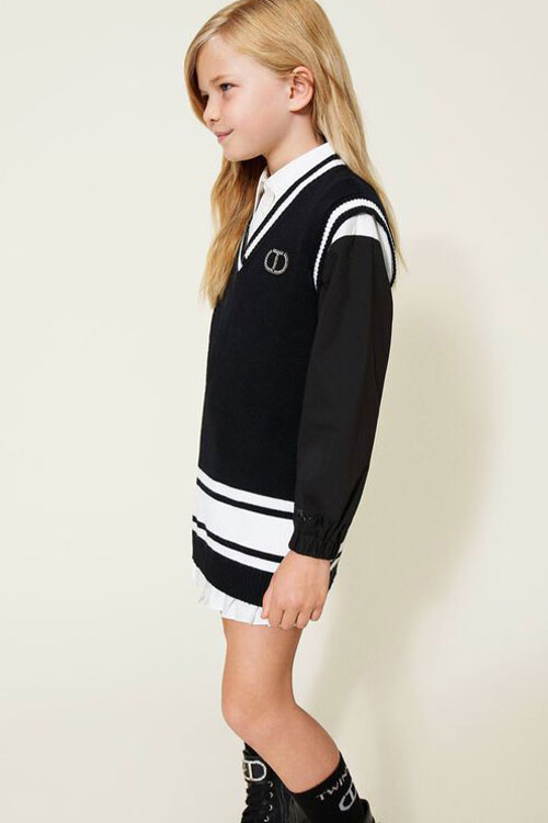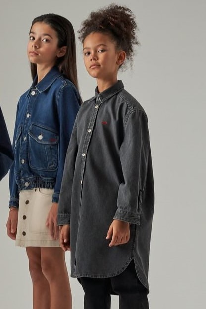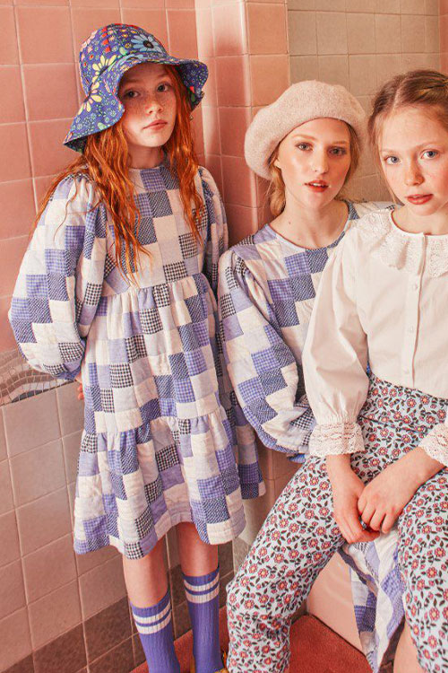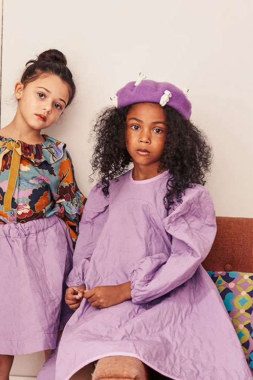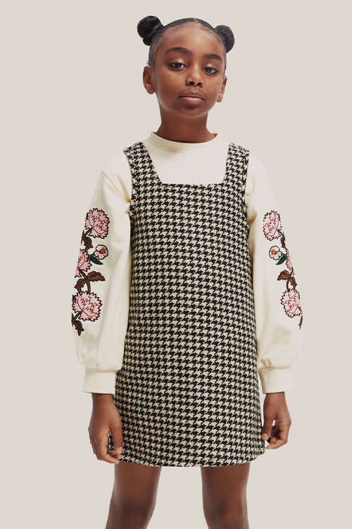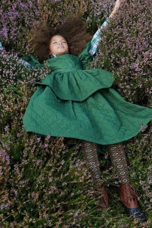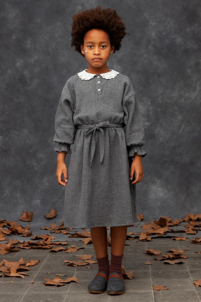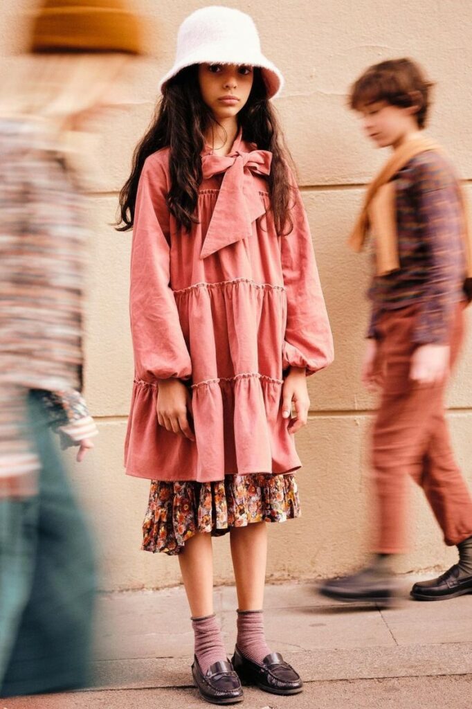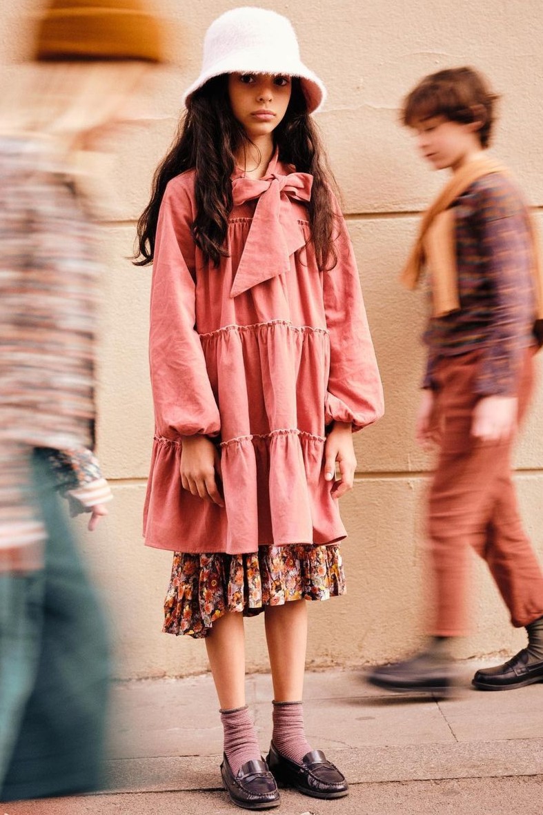 Cottage Tales & Urban Games. Girls embracing a duality within dress assortments for FW23. From romantic, rural vibes with ruffles and artisanal details the winter season offers a new take on the classic doll-collar cottage dress. The babushka dress has a more nostalgic feel due to its poetic embroideries and victorian ruffles. But more simple silhouettes in trending quilted materials or simple vest styles are proposing more stylish tiny-adult products. Considering a more urban style, oversizes shirts and sporty polo and skater dresses are enriching the range with a more practical and genderless note.