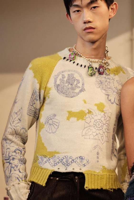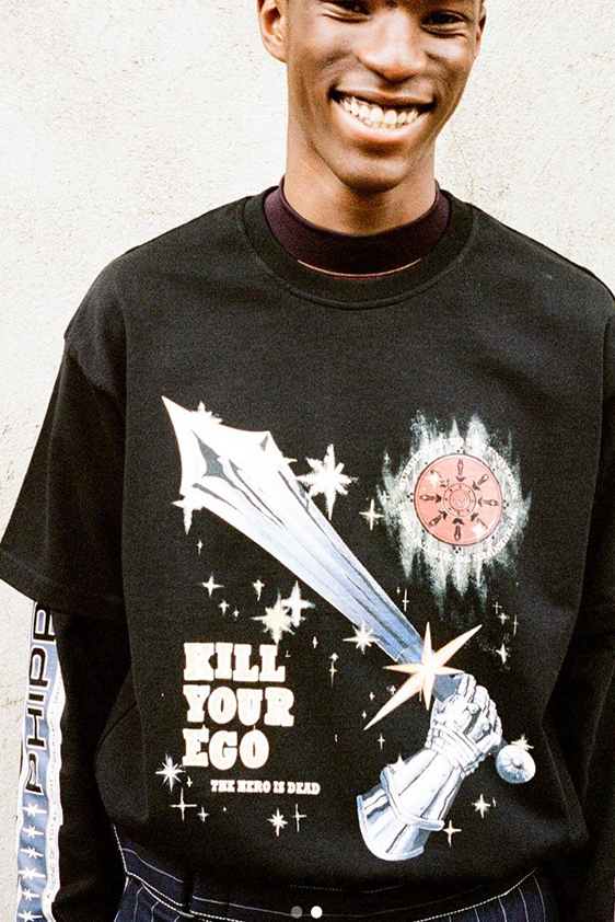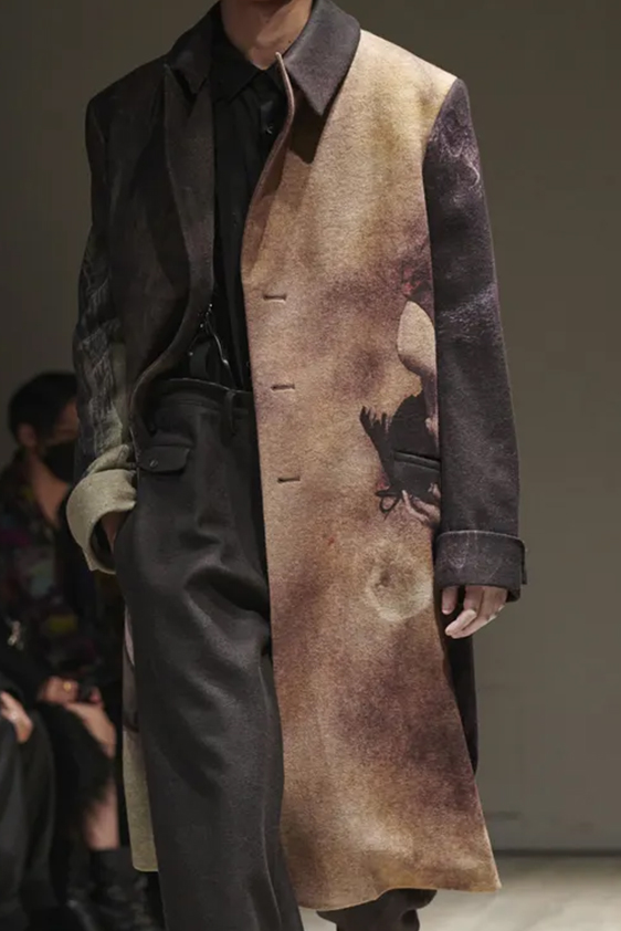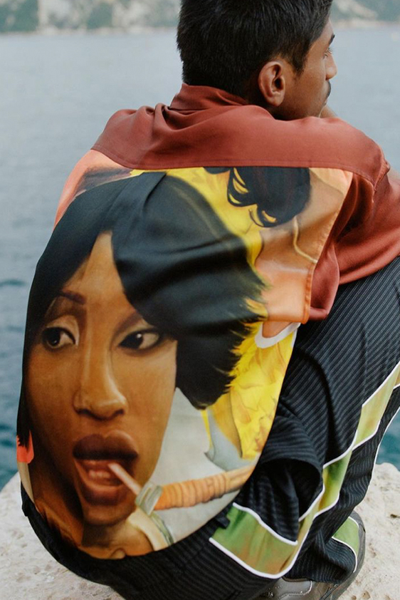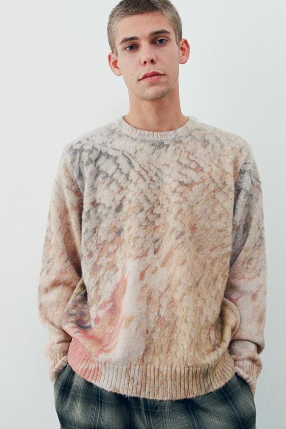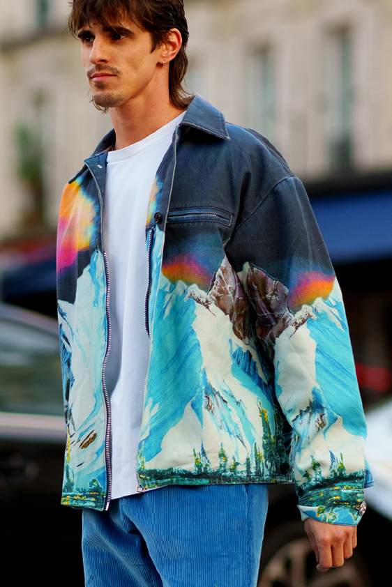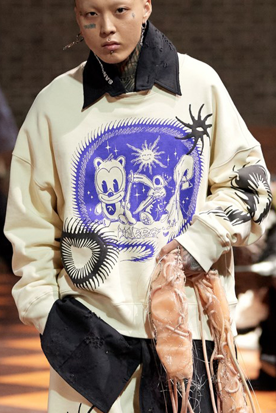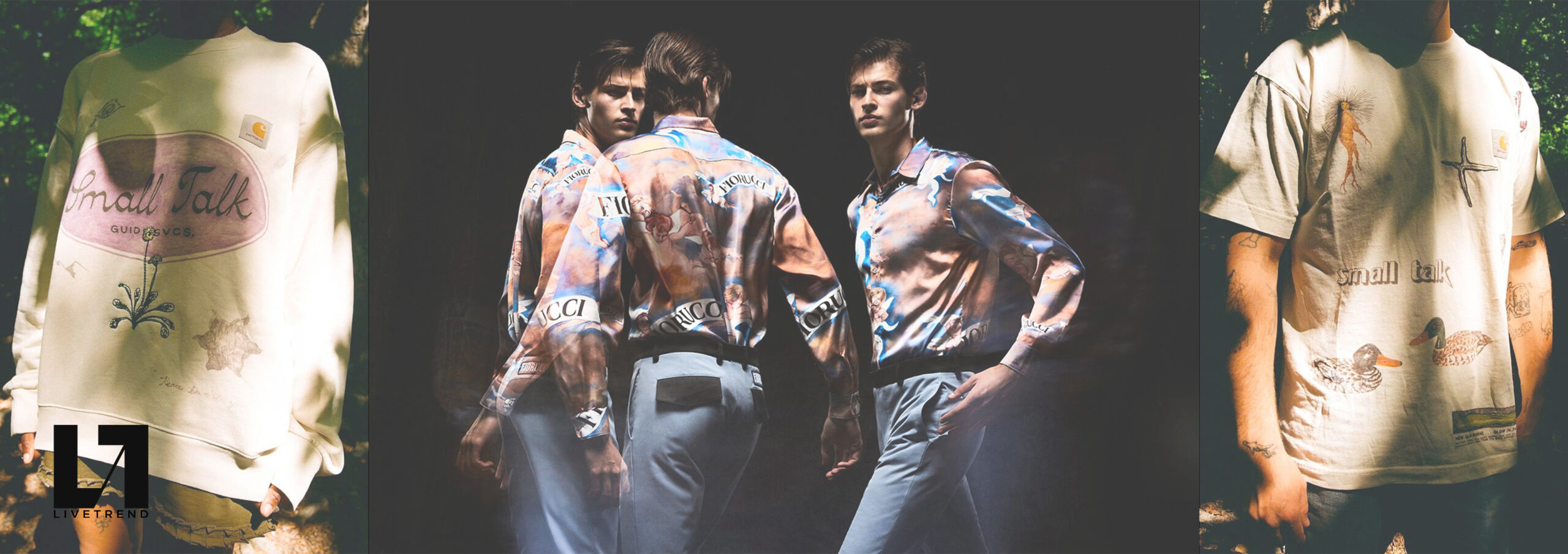Serene & Hardcore – Graphics & Prints for FW23 Menswear are exploring several trends that are beginning to manifest currently, yet explore new and unexpected ways. While some core looks, such as artful prints or animal, become more abstract and vague others become even more realistic and precise, displaying a very dualistic state of mind. The biggest influences are most certainly a somber and dystopic moment, in contrast to another inspirational stream of effortless joy and childish ease. The individual in relation to its community or in relation to the planet are becoming predominant themes. Messages and statements, doodles and full-face representations of humankind capture such a new understanding of a more humanistic society.