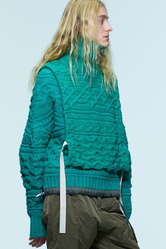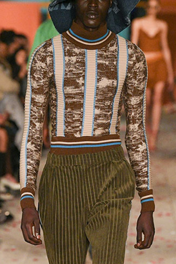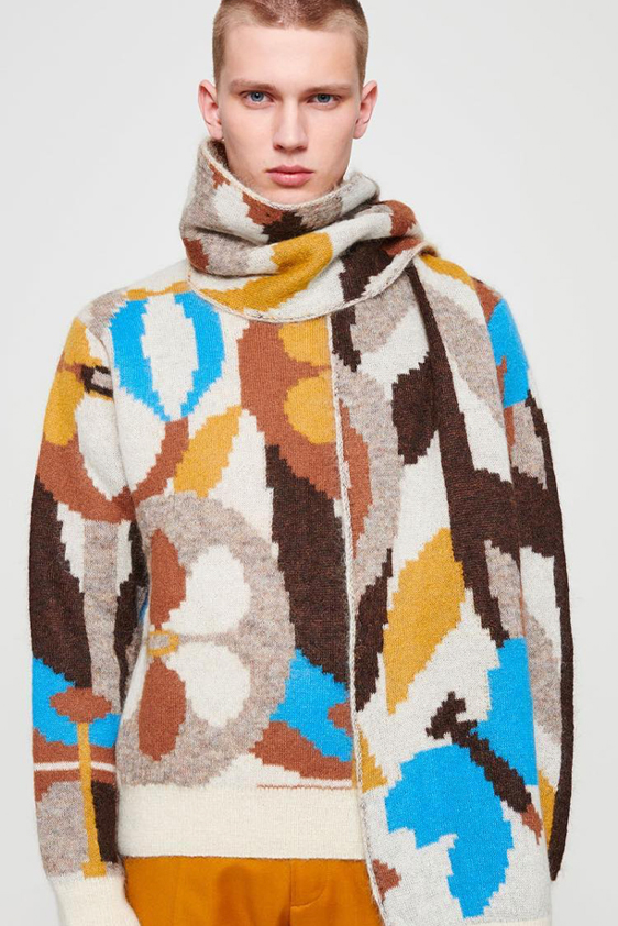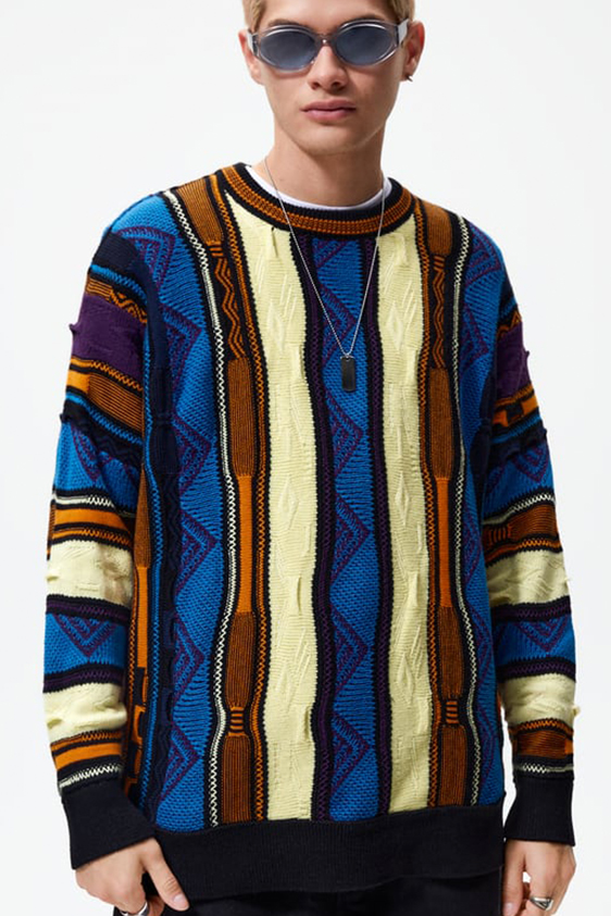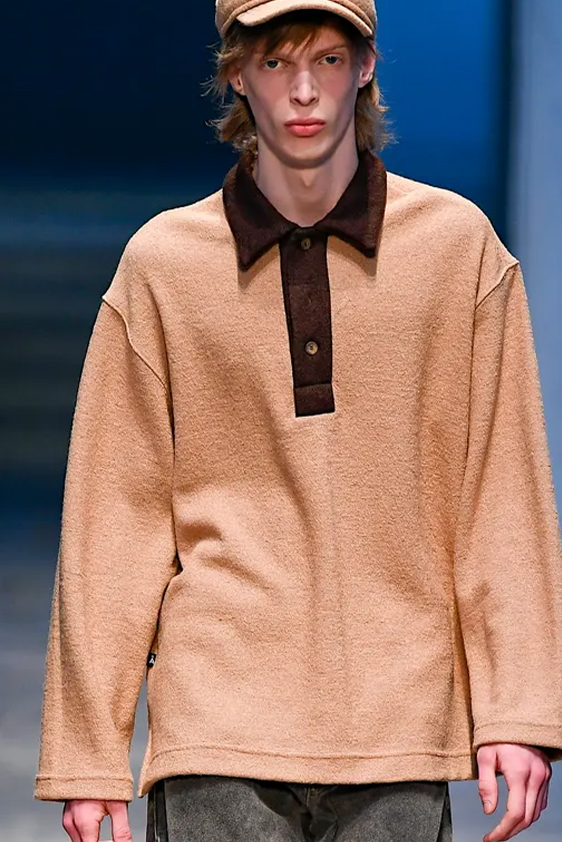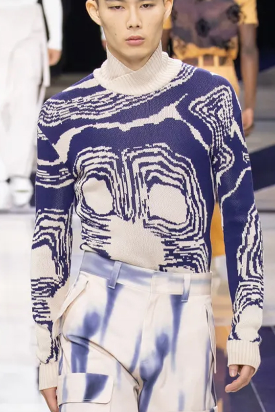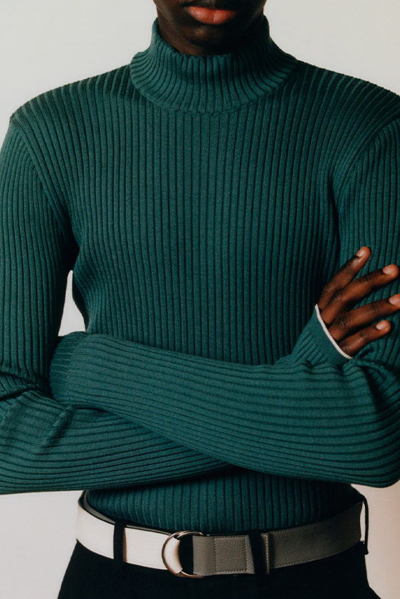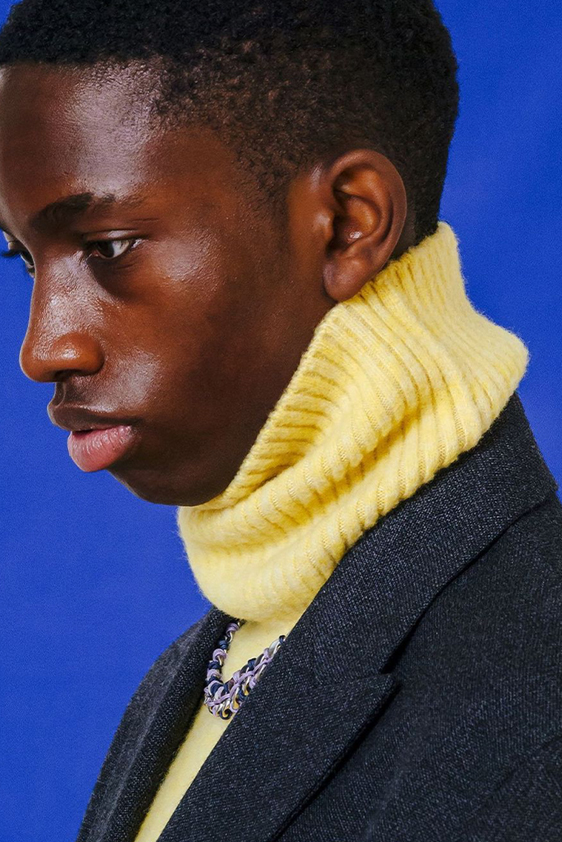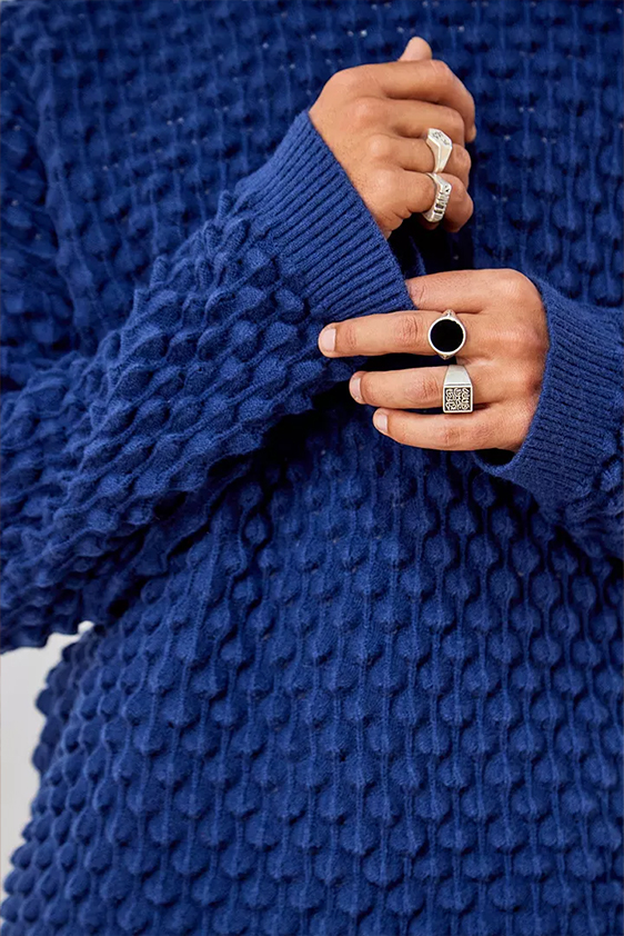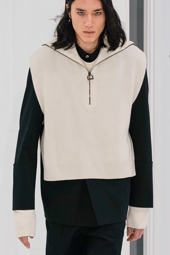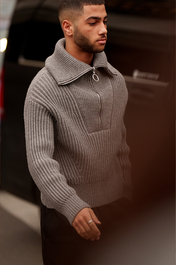 For shapes, the influence of new masculinity is adding slim fit silhouettes, dapper Polos and Deep-V shapes for a more fashionable client. Slouchier looks are ideal formal of those new grunge looks and build on elongated sleeves, dropped shoulders and crew or slashed necklines. From a modernist influence, technical zip-ups and half-zip-up products are explored and add an innovative sensibility. Zipped knitwear has increased by +60% in searches over the last year, showing a consumer taste for more engineered styles.  The futuristic look can be enhanced by plastron elements and new textures. Dive deeper into the new knitwear pieces and aesthetics below: