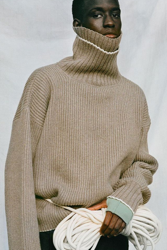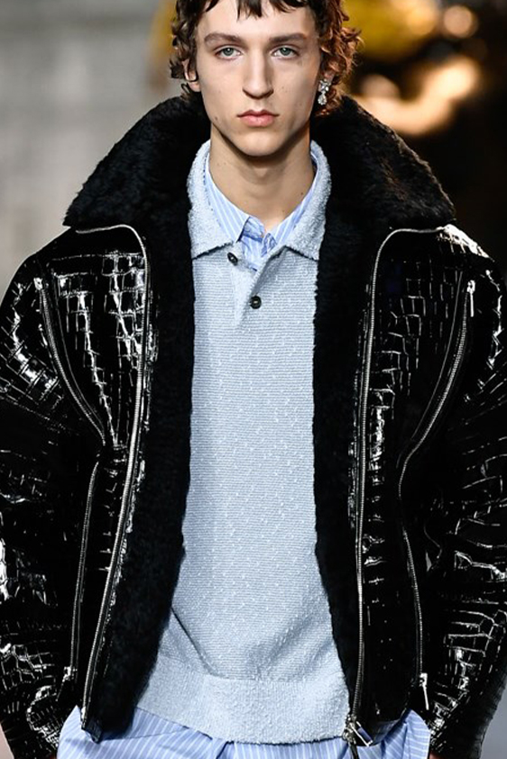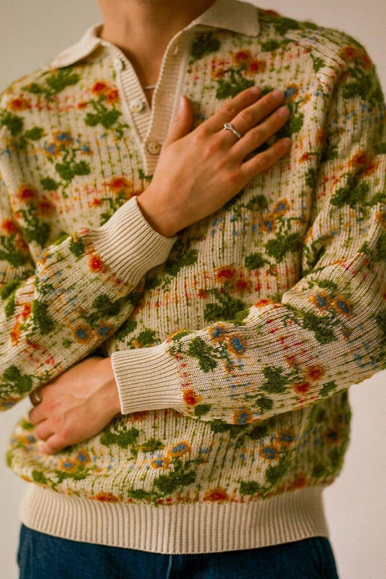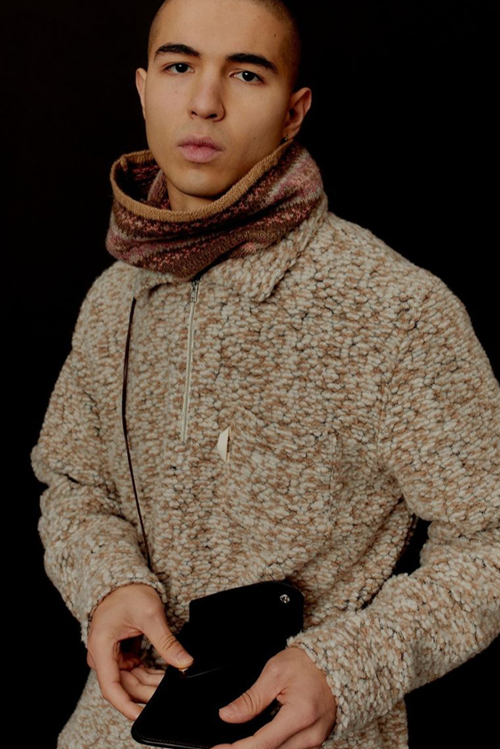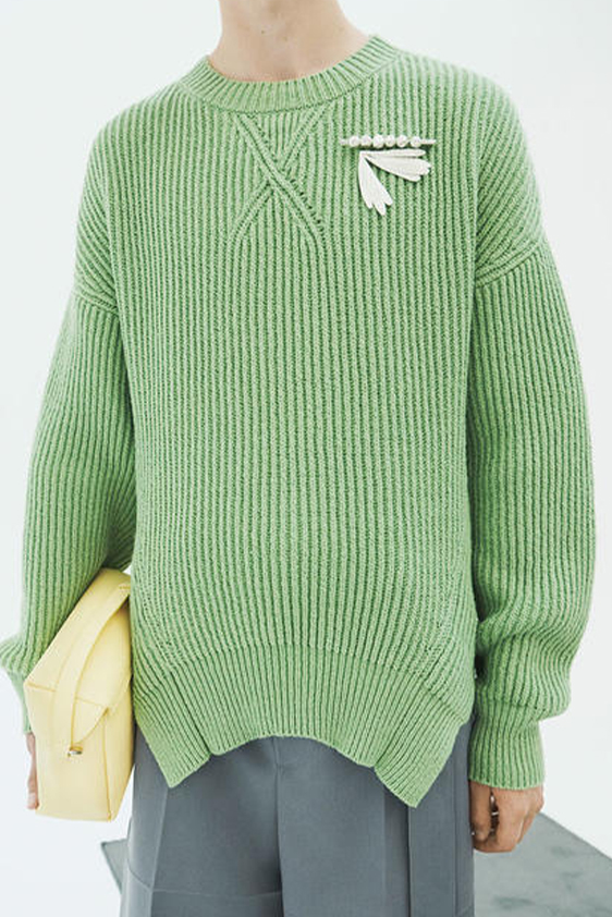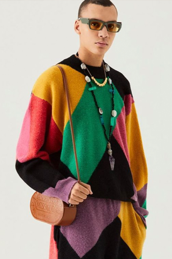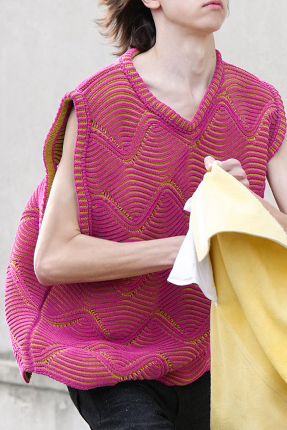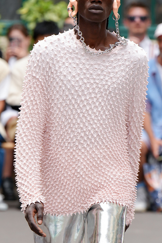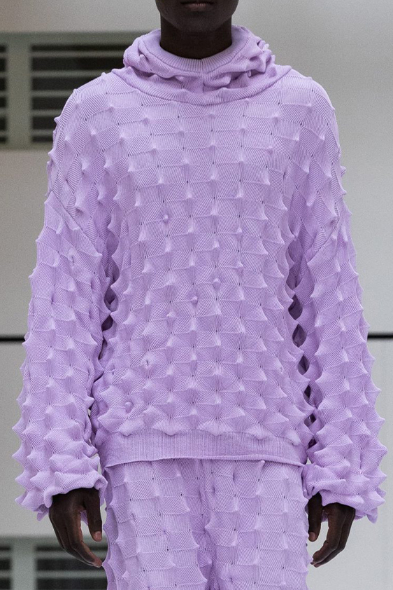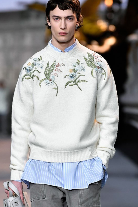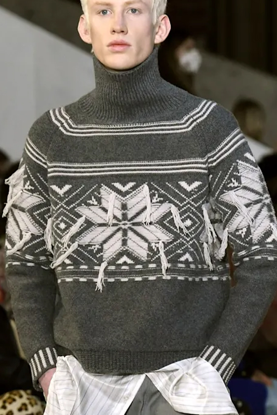 For shapes, the influence of new masculinity is adding slim fit silhouettes, dapper Polos and Deep-V shapes for a more fashionable client. Slouchier looks are ideal formal of those new grunge looks and build on elongated sleeves, dropped shoulders and crew or slashed necklines. From a modernist influence, technical zip-ups and half-zip-up products are explored and add an innovative sensibility. Zipped knitwear has increased by +60% in searches over the last year, showing a consumer taste for more engineered styles.  The futuristic look can be enhanced by plastron elements and new textures. Dive deeper into the new knitwear pieces and aesthetics below: