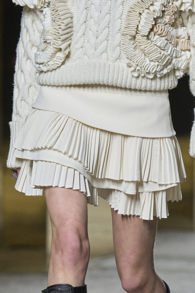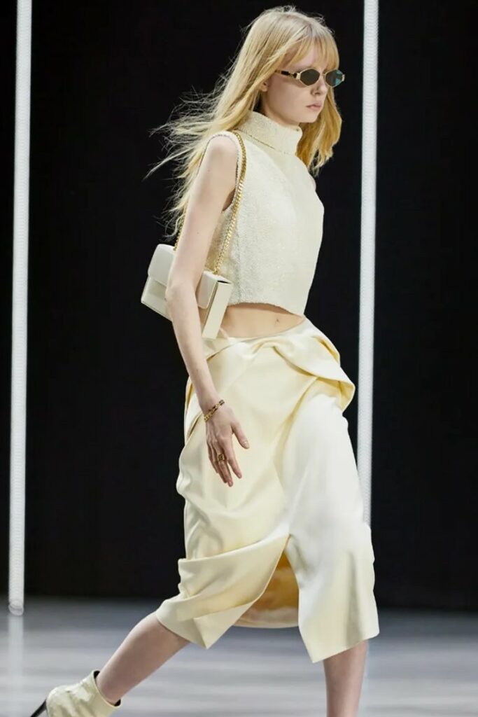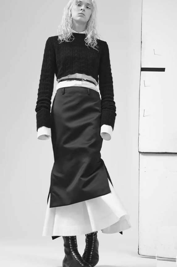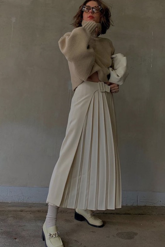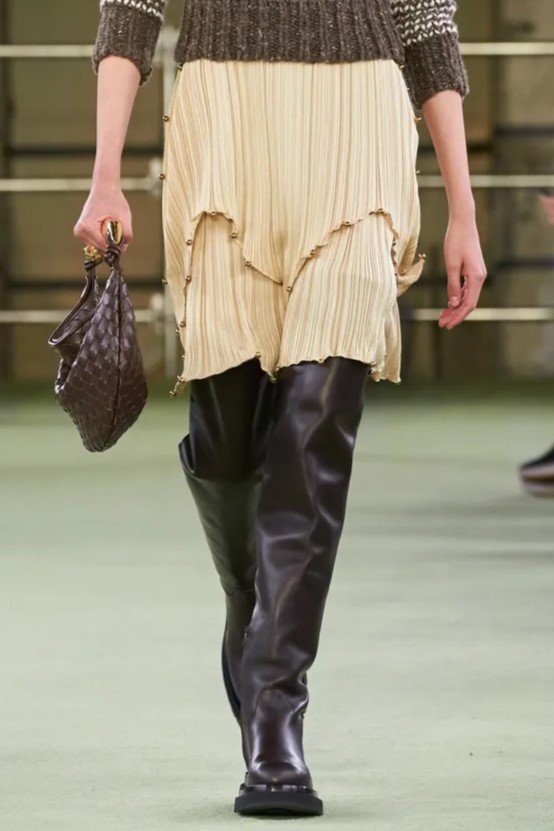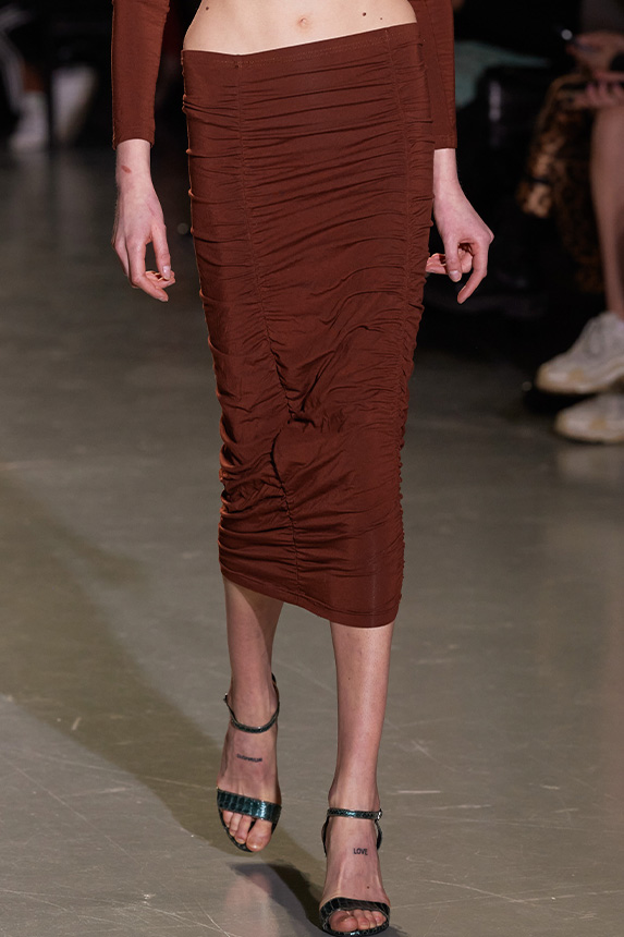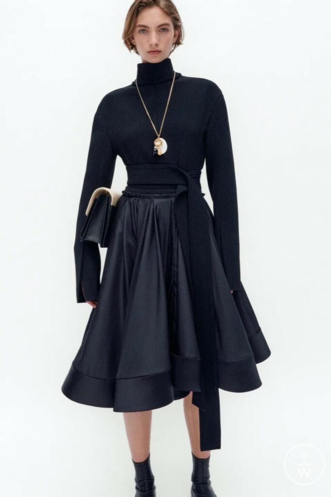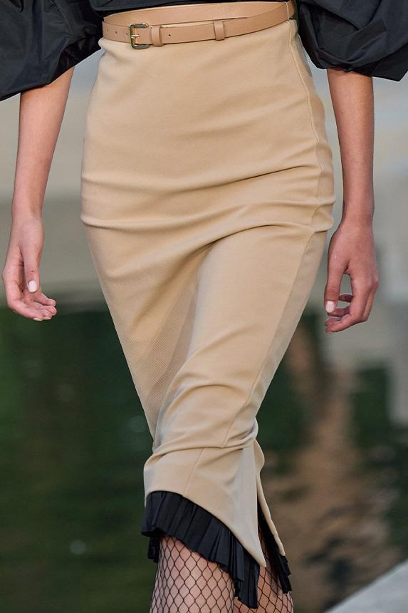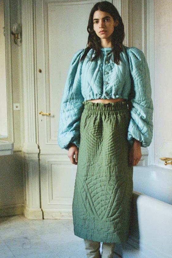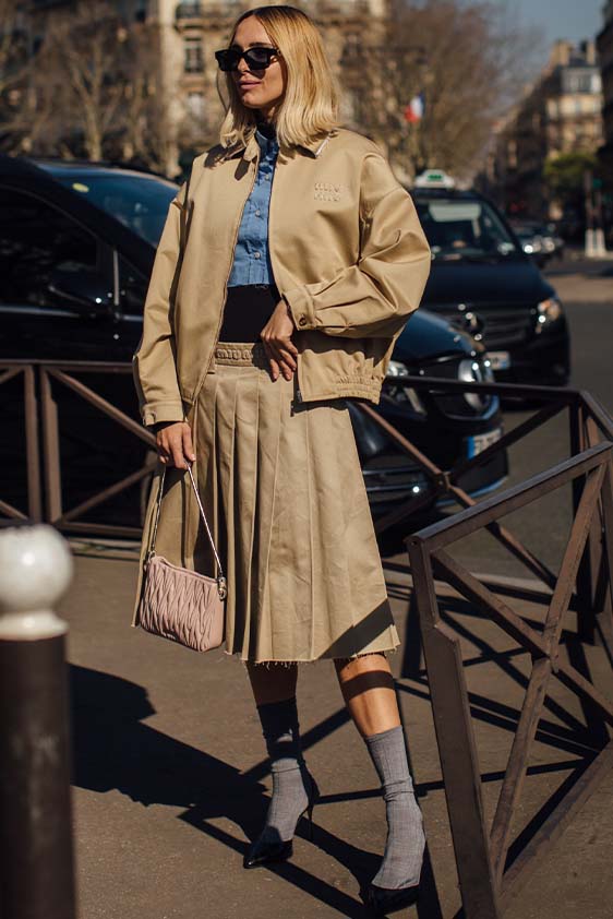 Bohemian Academia. FW23 skirts are exploring heritage and a newfound freedom equally. The essential range will build on column midi skirts and handkerchief silhouettes, which resonate those ides of something still and something dynamic. The category begins to open up to returning classics like the trumpet shape or A-Line, which add a sophisticated allure and feel very fashionable with trending low-waists. Due to the big success of the academic pleat style. Consumers still show interest in the style after the big social media boom during FW22 fashion week and maintain a growth of +50% YOY in search rates. Now, new quilt skirt emerge from the highlands by mixing layers or interpreting shorter lengths. Next to that, a deliberately minimal pleated skirts is feeling fresh again as it can explore a new focus on construction and detail.