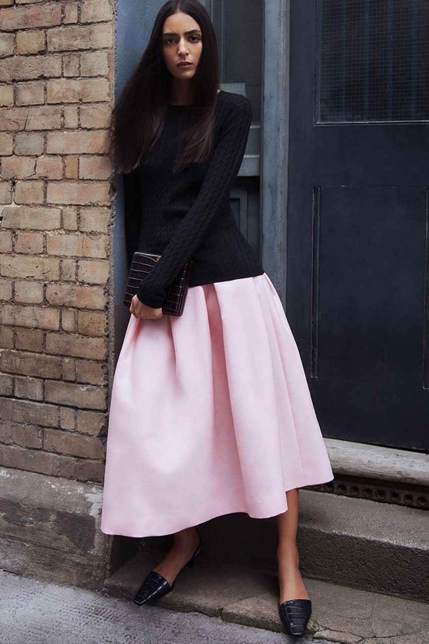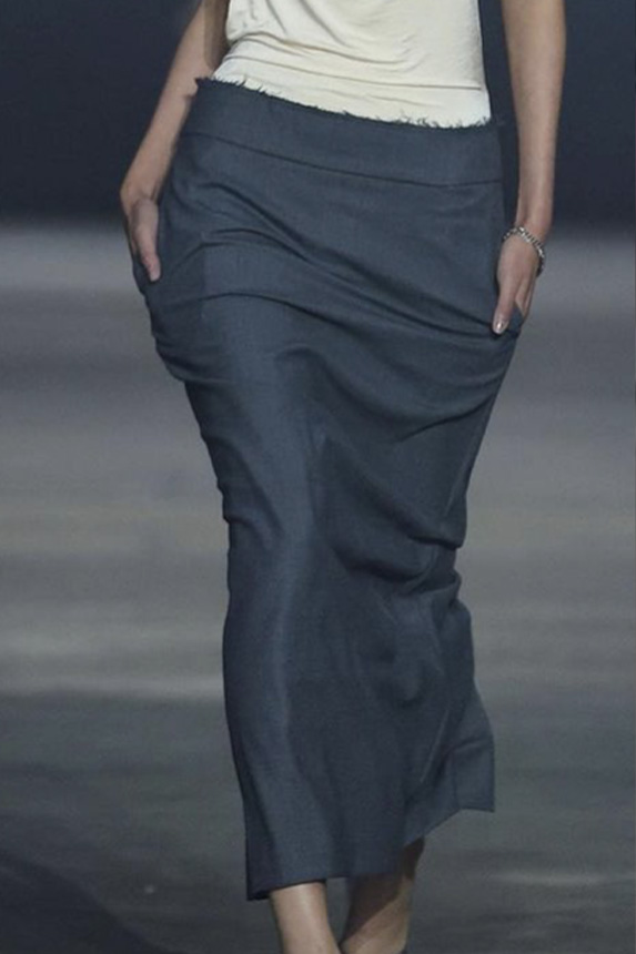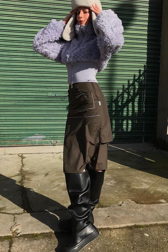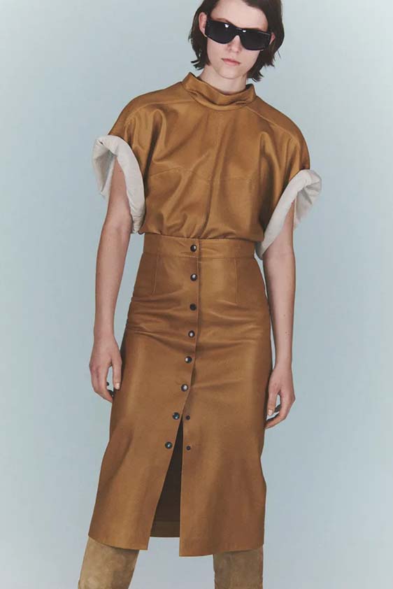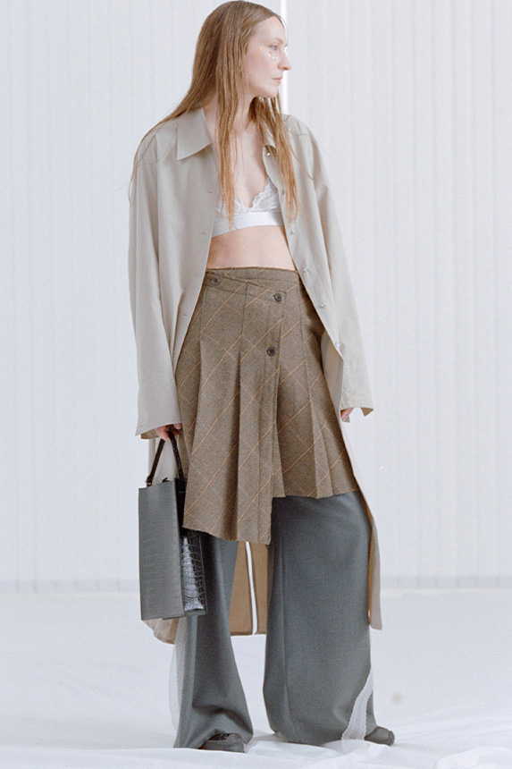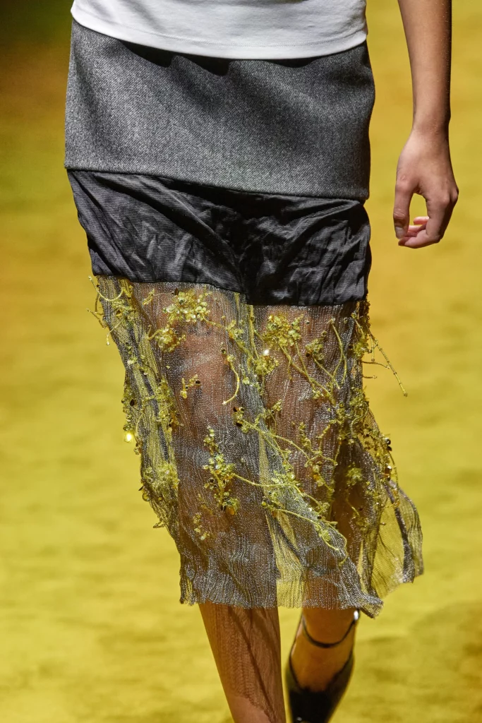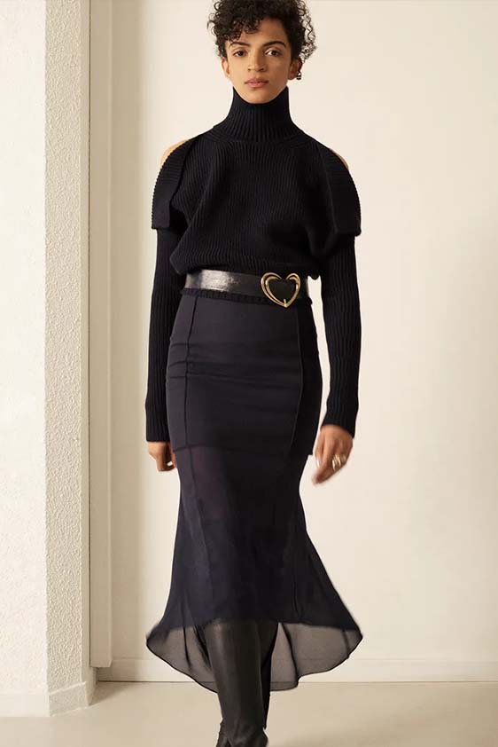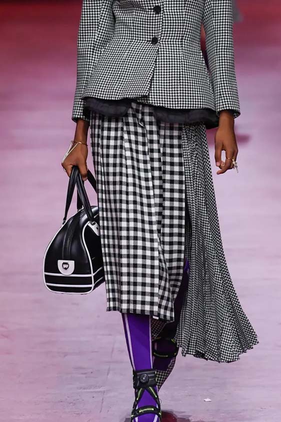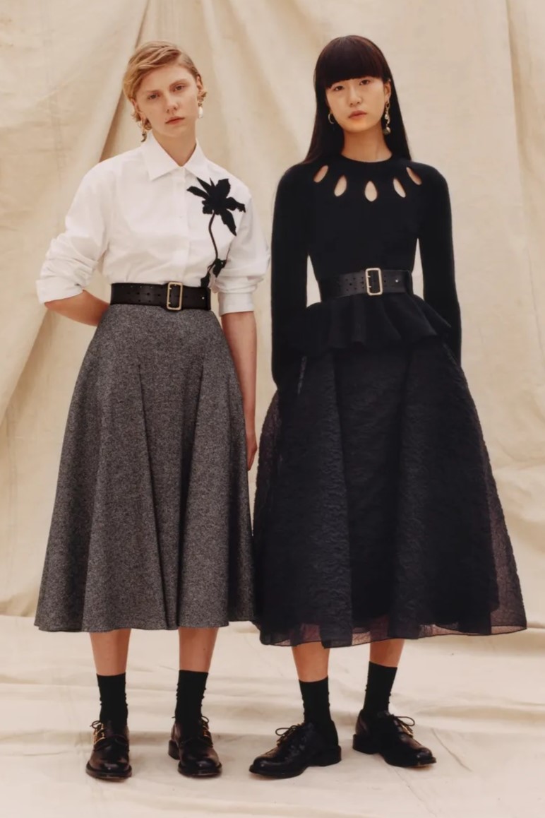Bohemian Academia. FW23 skirts are exploring heritage and a newfound freedom equally. The essential range will build on column midi skirts and handkerchief silhouettes, which resonate those ides of something still and something dynamic. The category begins to open up to returning classics like the trumpet shape or A-Line, which add a sophisticated allure and feel very fashionable with trending low-waists. Due to the big success of the academic pleat style. Consumers still show interest in the style after the big social media boom during FW22 fashion week and maintain a growth of +50% YOY in search rates. Now, new quilt skirt emerge from the highlands by mixing layers or interpreting shorter lengths. Next to that, a deliberately minimal pleated skirts is feeling fresh again as it can explore a new focus on construction and detail.