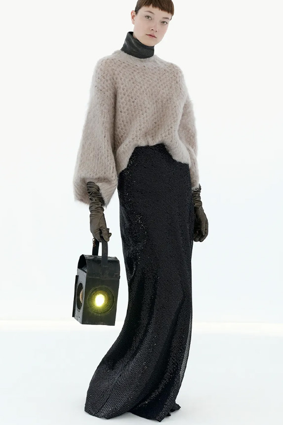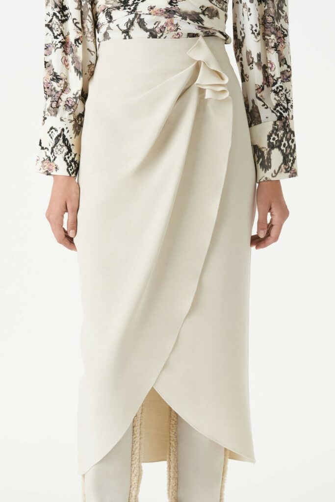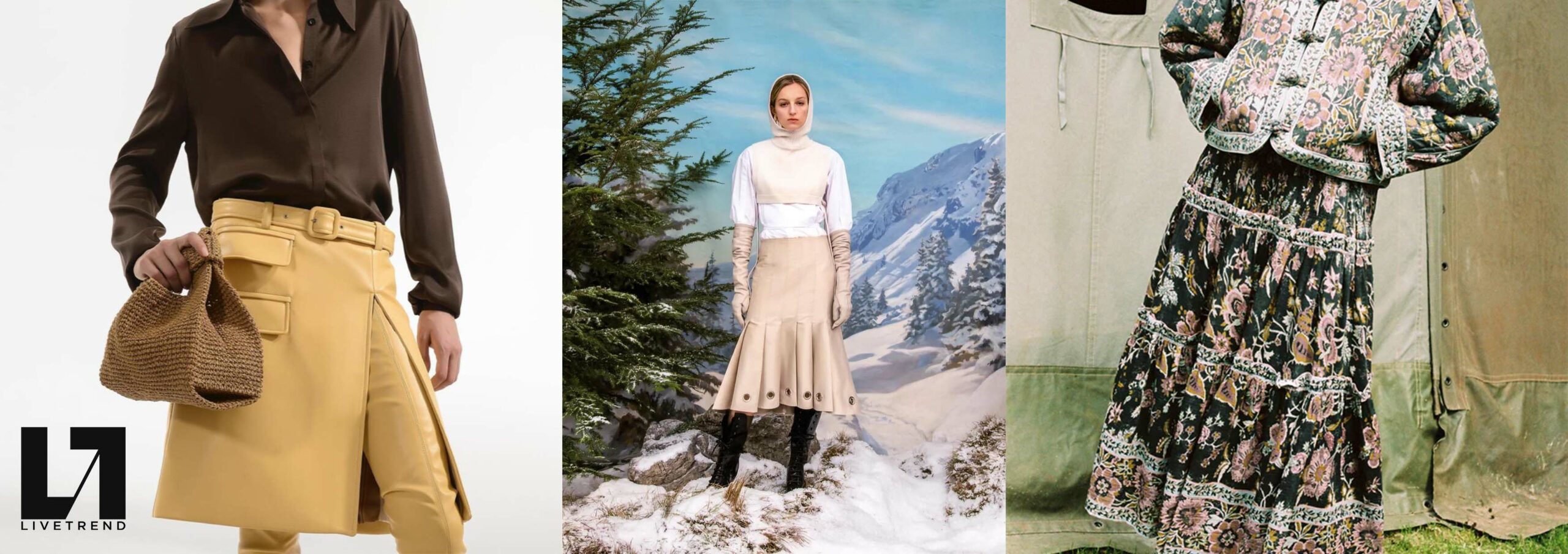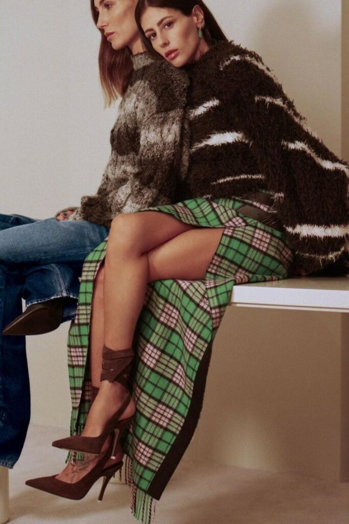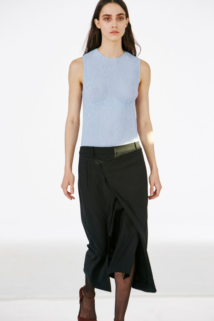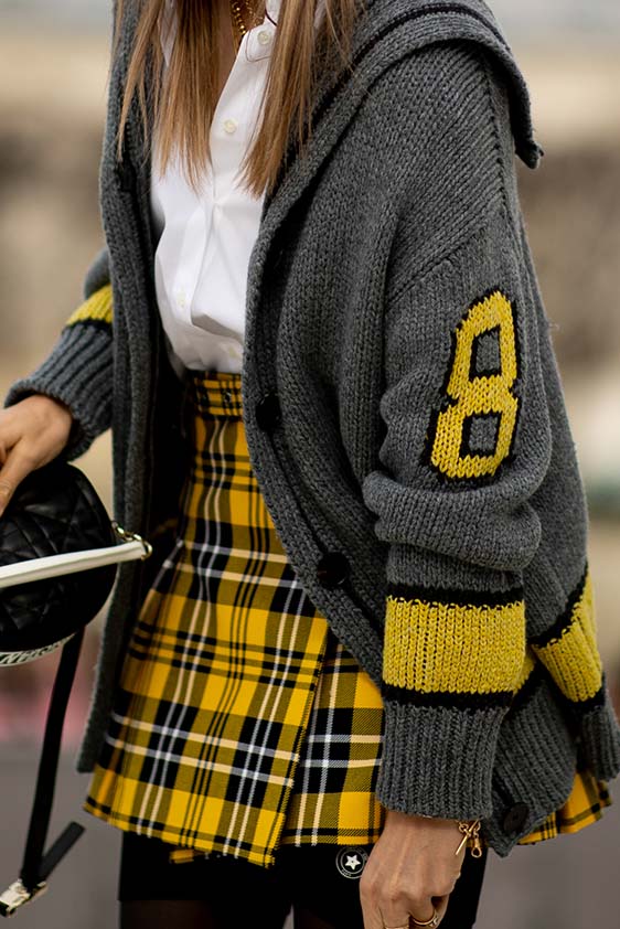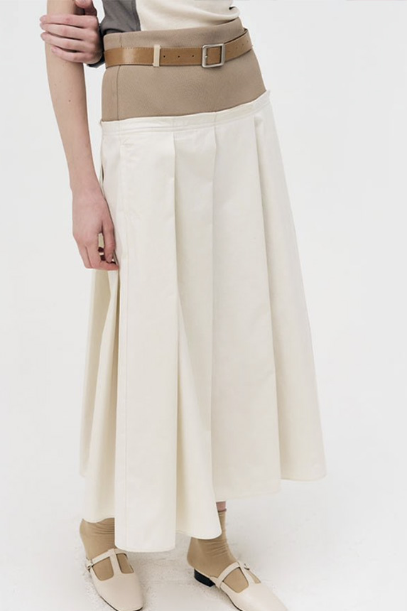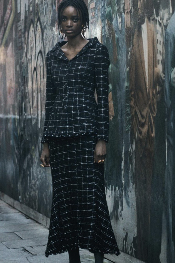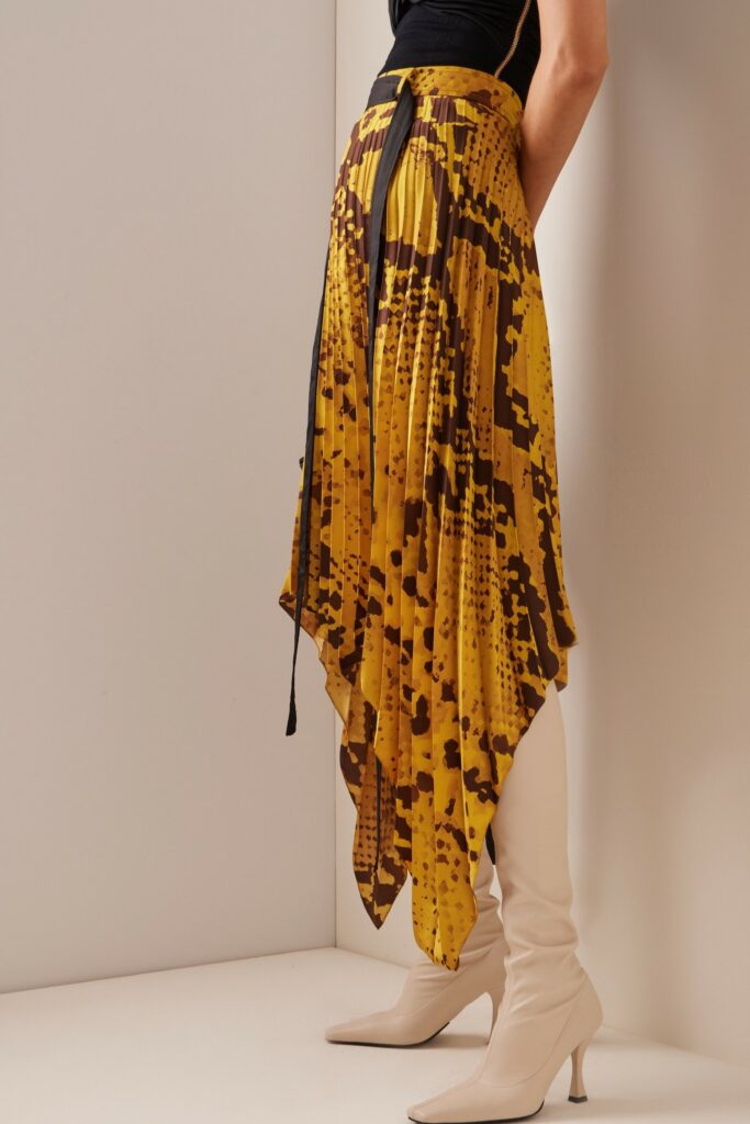 Bohemian Academia. FW23 skirts are exploring heritage and a newfound freedom equally. The essential range will build on column midi skirts and handkerchief silhouettes, which resonate those ides of something still and something dynamic. The category begins to open up to returning classics like the trumpet shape or A-Line, which add a sophisticated allure and feel very fashionable with trending low-waists. Due to the big success of the academic pleat style. Consumers still show interest in the style after the big social media boom during FW22 fashion week and maintain a growth of +50% YOY in search rates. Now, new quilt skirt emerge from the highlands by mixing layers or interpreting shorter lengths. Next to that, a deliberately minimal pleated skirts is feeling fresh again as it can explore a new focus on construction and detail.