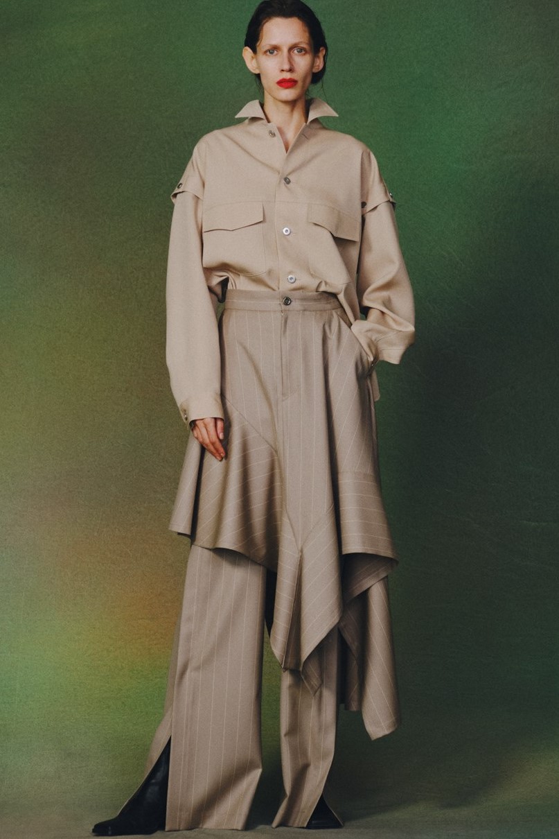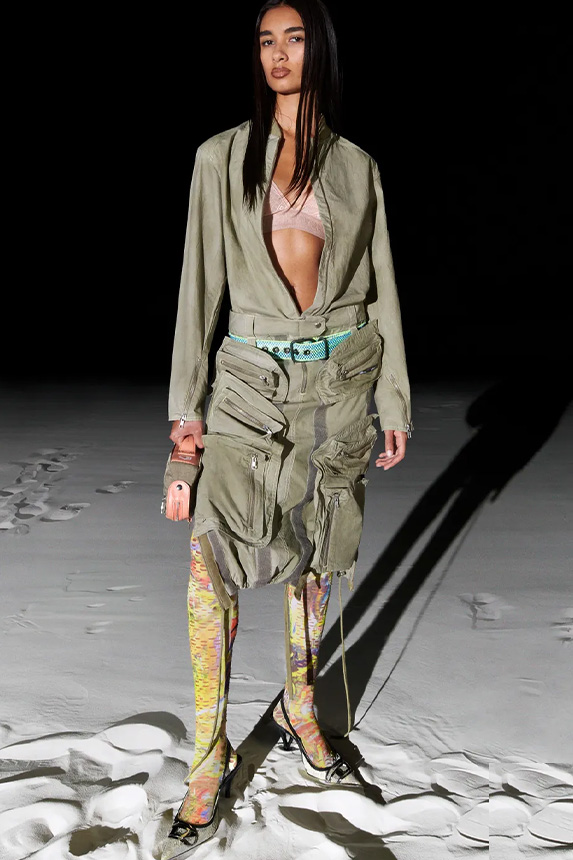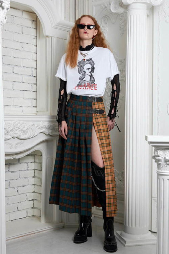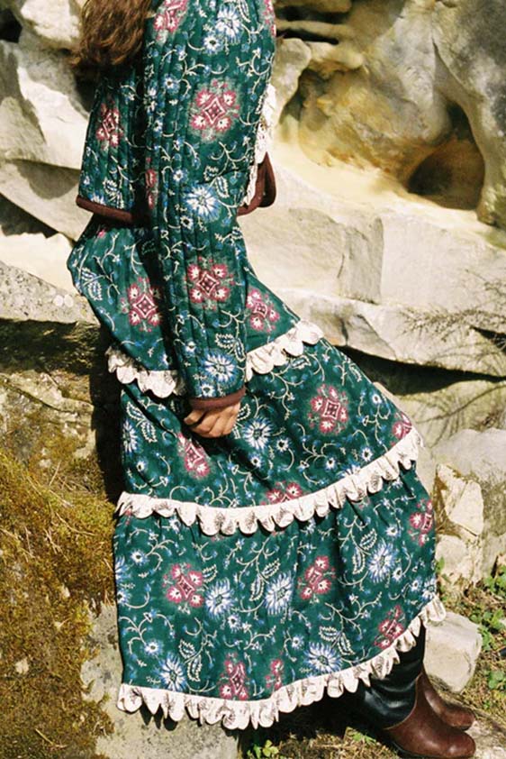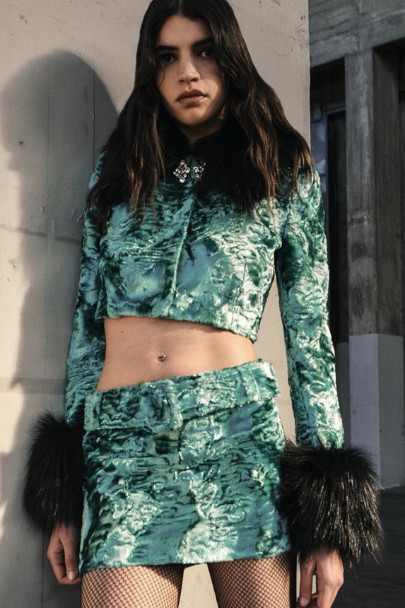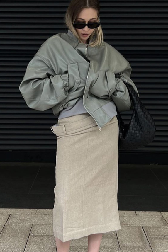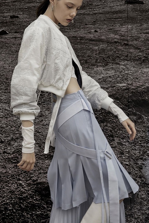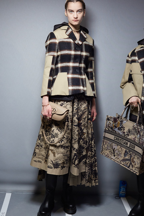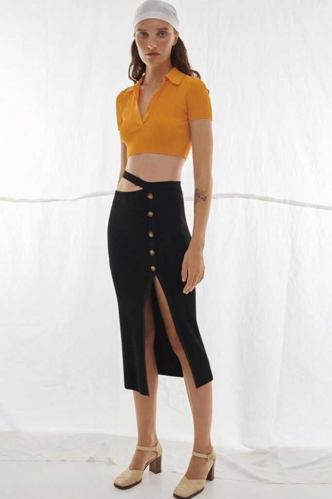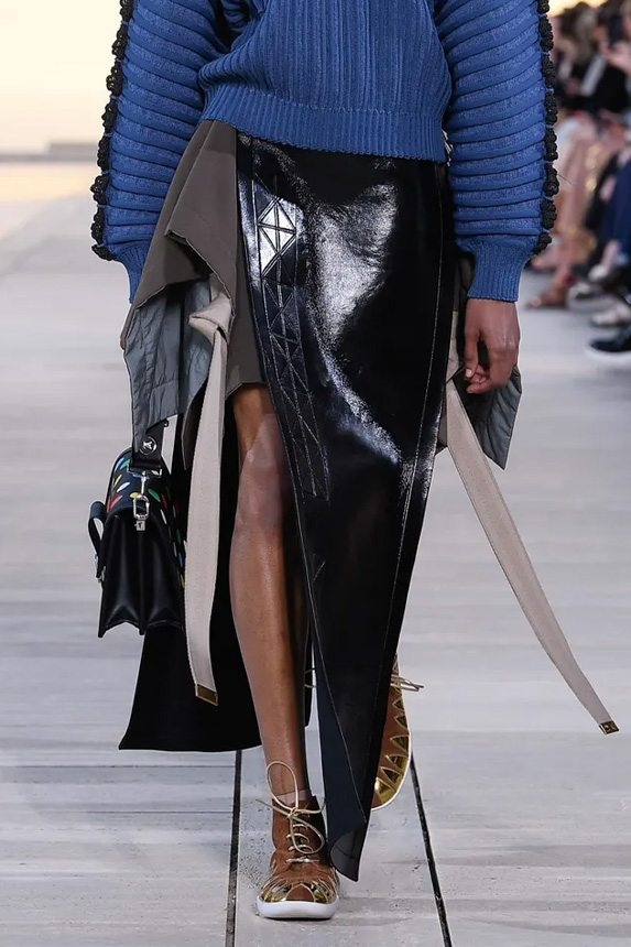 Bohemian Academia. FW23 skirts are exploring heritage and a newfound freedom equally. The essential range will build on column midi skirts and handkerchief silhouettes, which resonate those ides of something still and something dynamic. The category begins to open up to returning classics like the trumpet shape or A-Line, which add a sophisticated allure and feel very fashionable with trending low-waists. Due to the big success of the academic pleat style. Consumers still show interest in the style after the big social media boom during FW22 fashion week and maintain a growth of +50% YOY in search rates. Now, new quilt skirt emerge from the highlands by mixing layers or interpreting shorter lengths. Next to that, a deliberately minimal pleated skirts is feeling fresh again as it can explore a new focus on construction and detail.