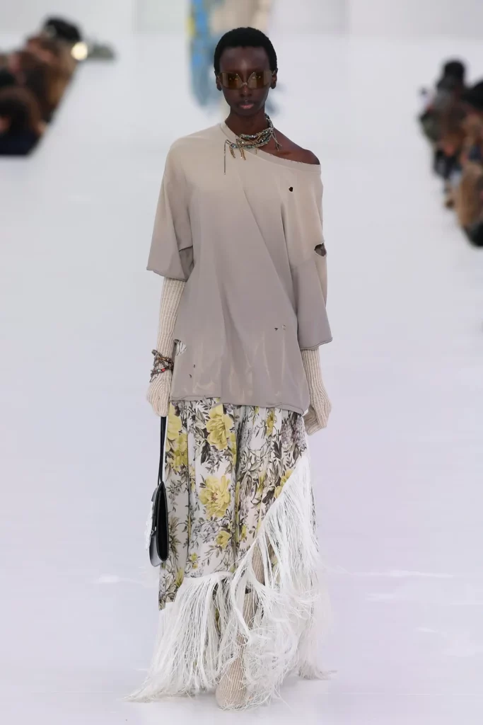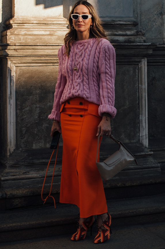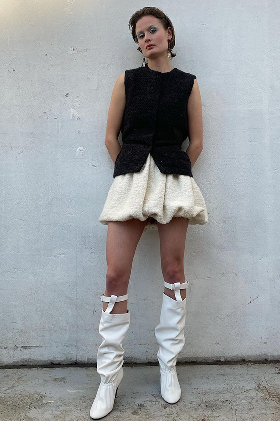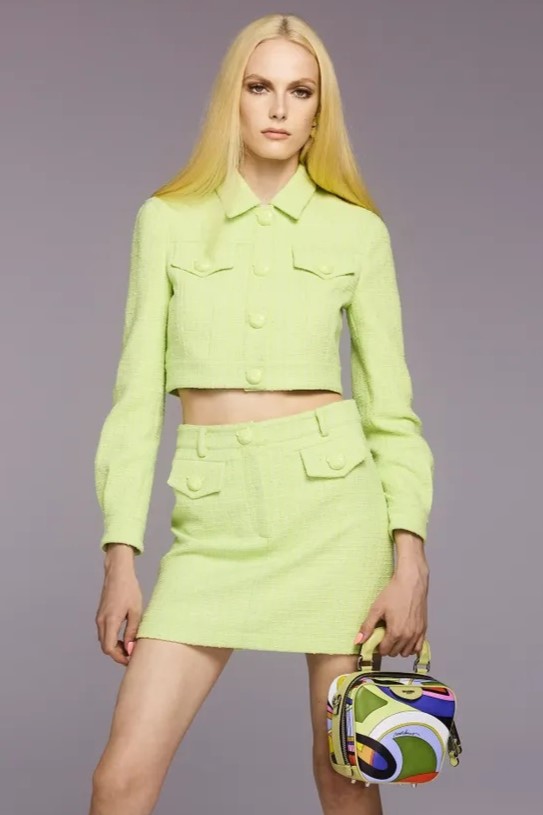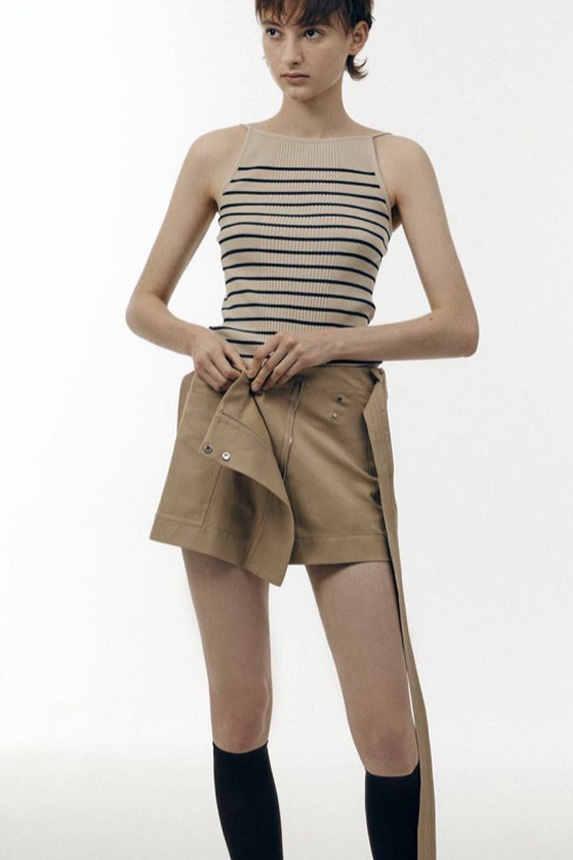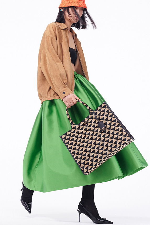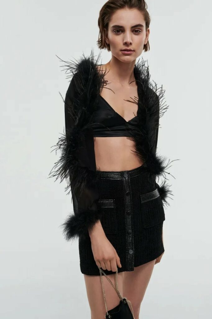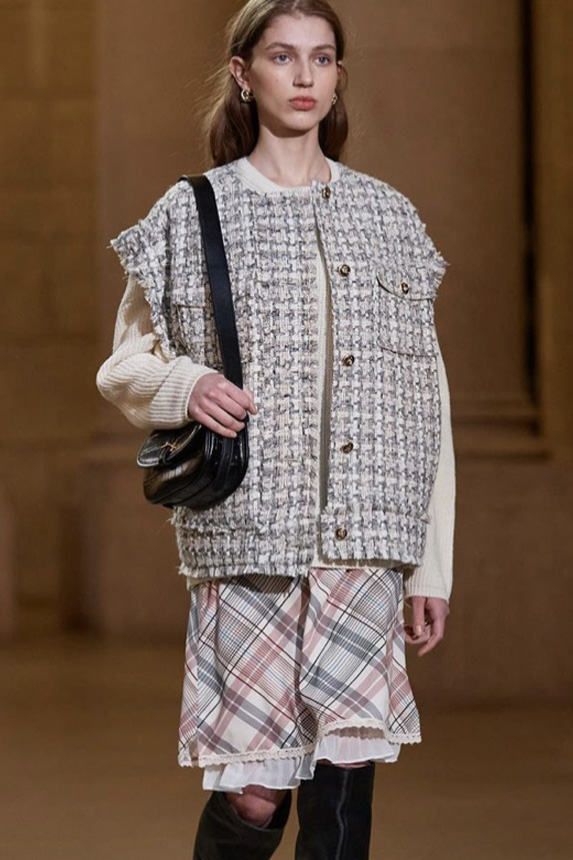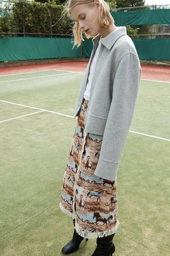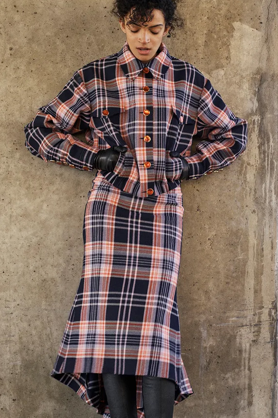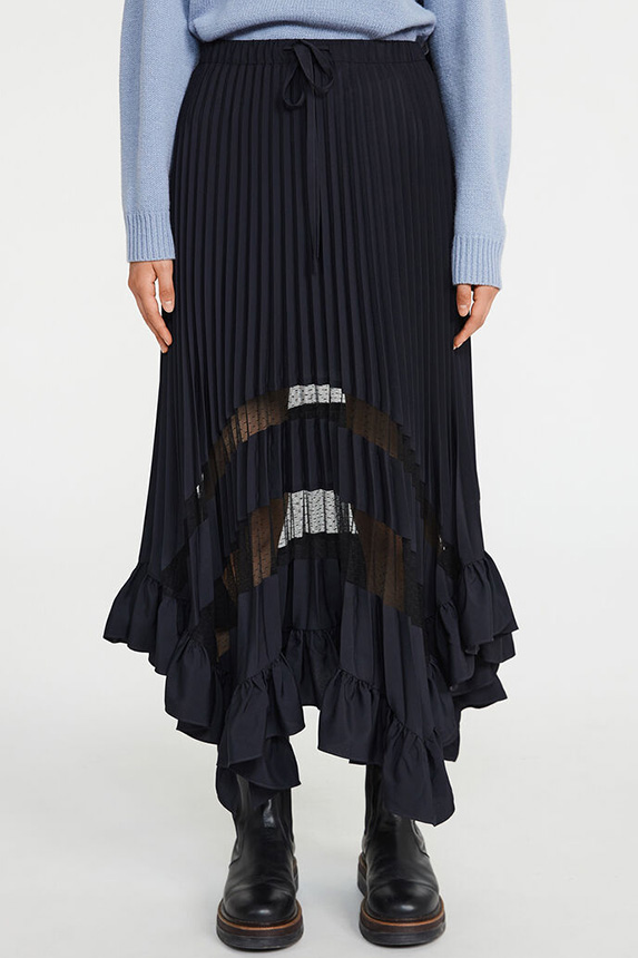 Bohemian Academia. FW23 skirts are exploring heritage and a newfound freedom equally. The essential range will build on column midi skirts and handkerchief silhouettes, which resonate those ides of something still and something dynamic. The category begins to open up to returning classics like the trumpet shape or A-Line, which add a sophisticated allure and feel very fashionable with trending low-waists. Due to the big success of the academic pleat style. Consumers still show interest in the style after the big social media boom during FW22 fashion week and maintain a growth of +50% YOY in search rates. Now, new quilt skirt emerge from the highlands by mixing layers or interpreting shorter lengths. Next to that, a deliberately minimal pleated skirts is feeling fresh again as it can explore a new focus on construction and detail.