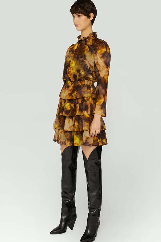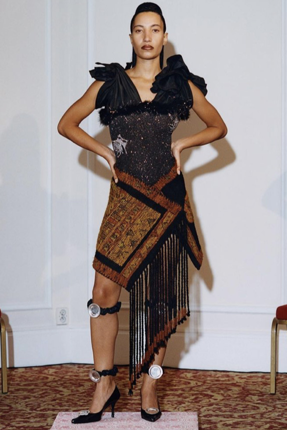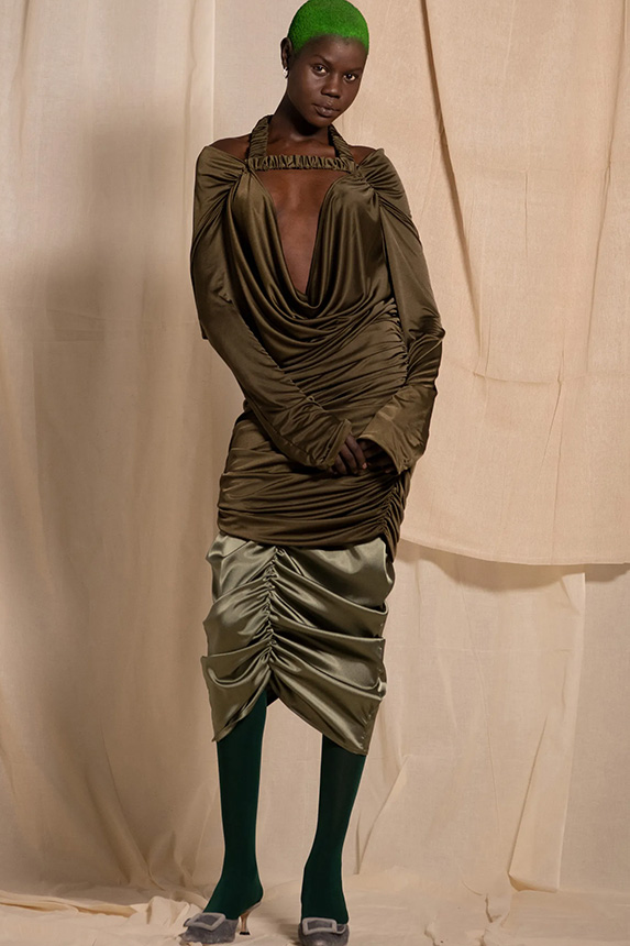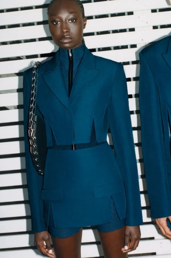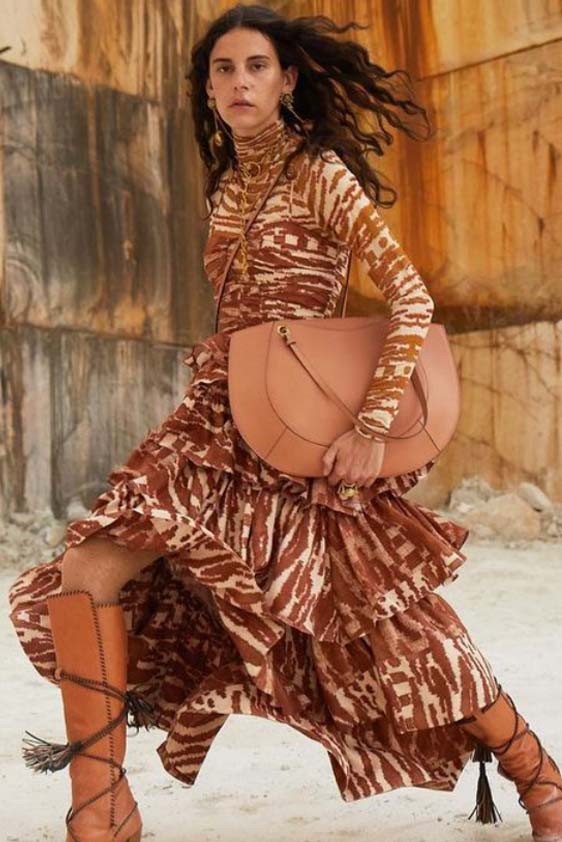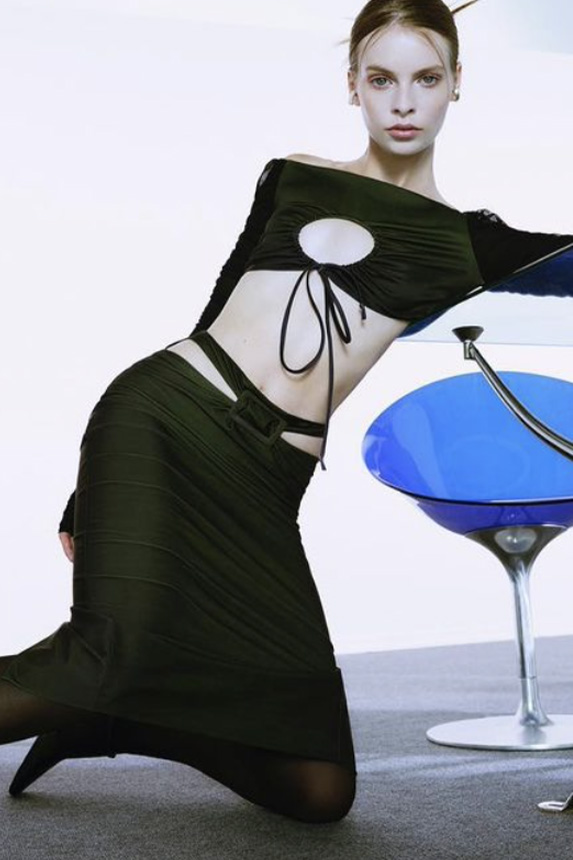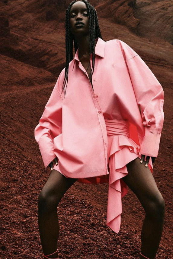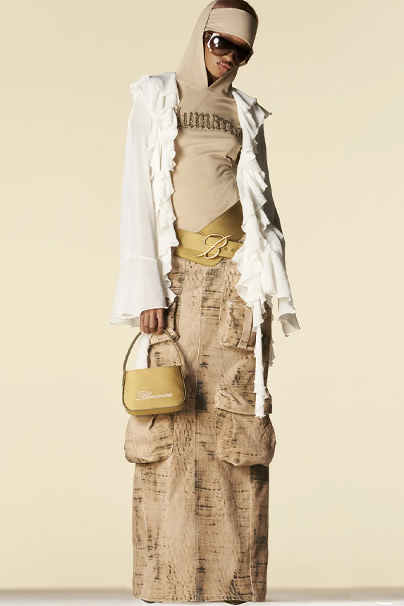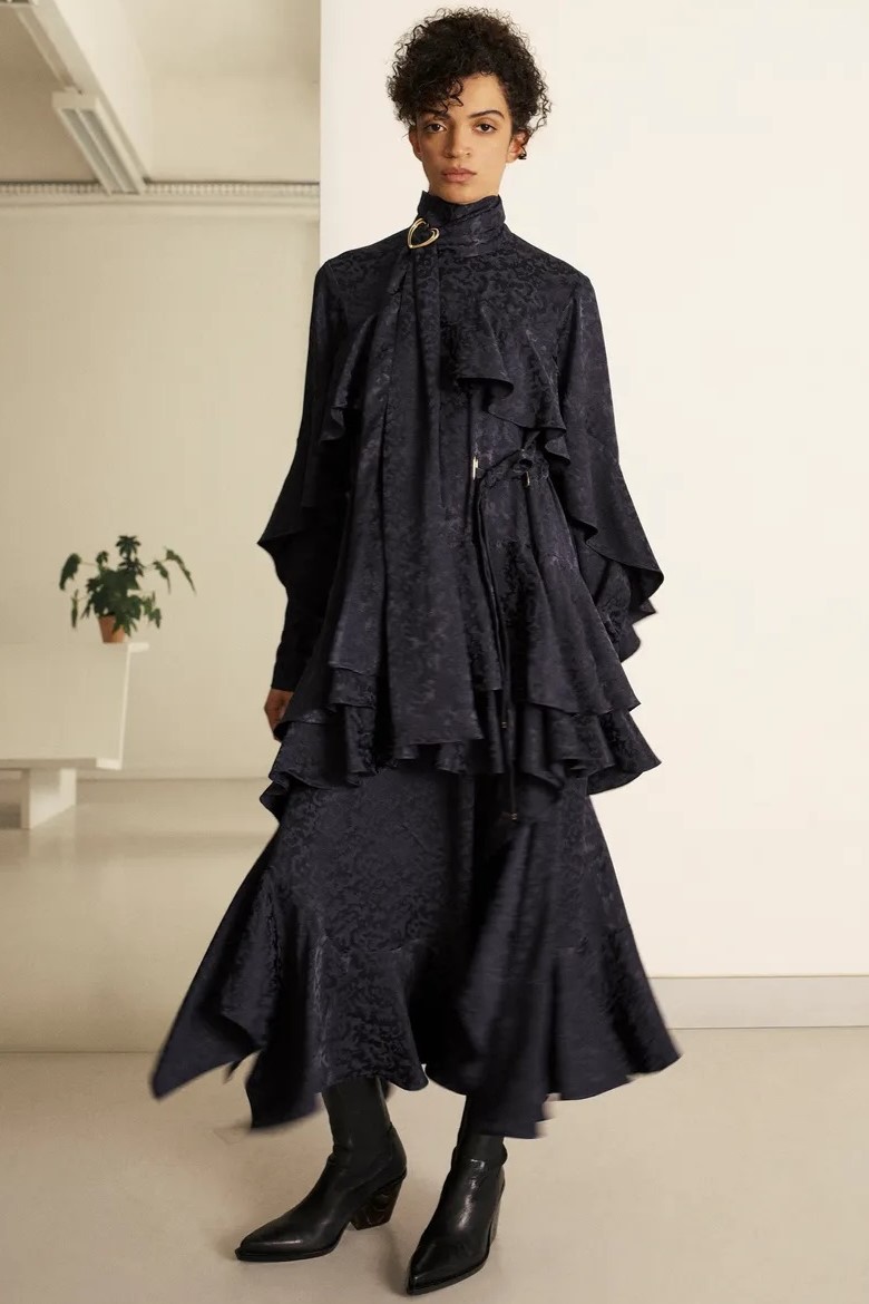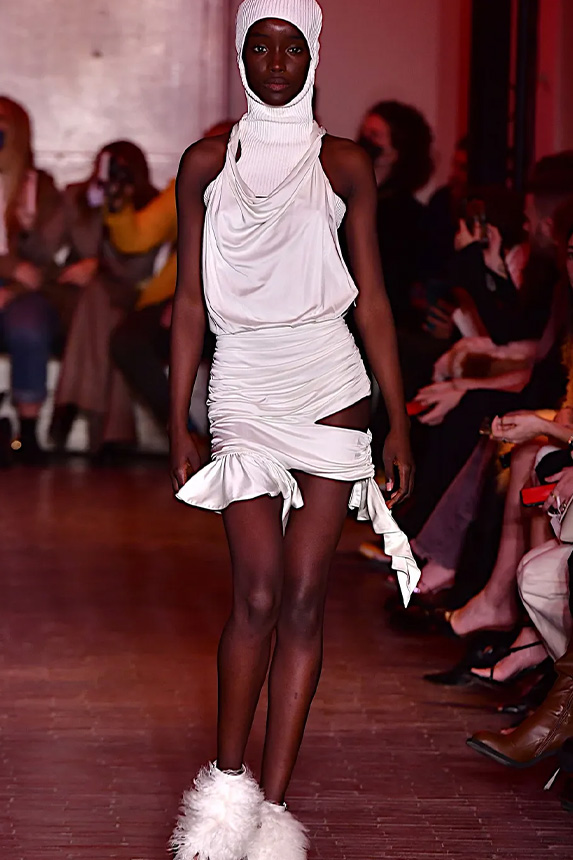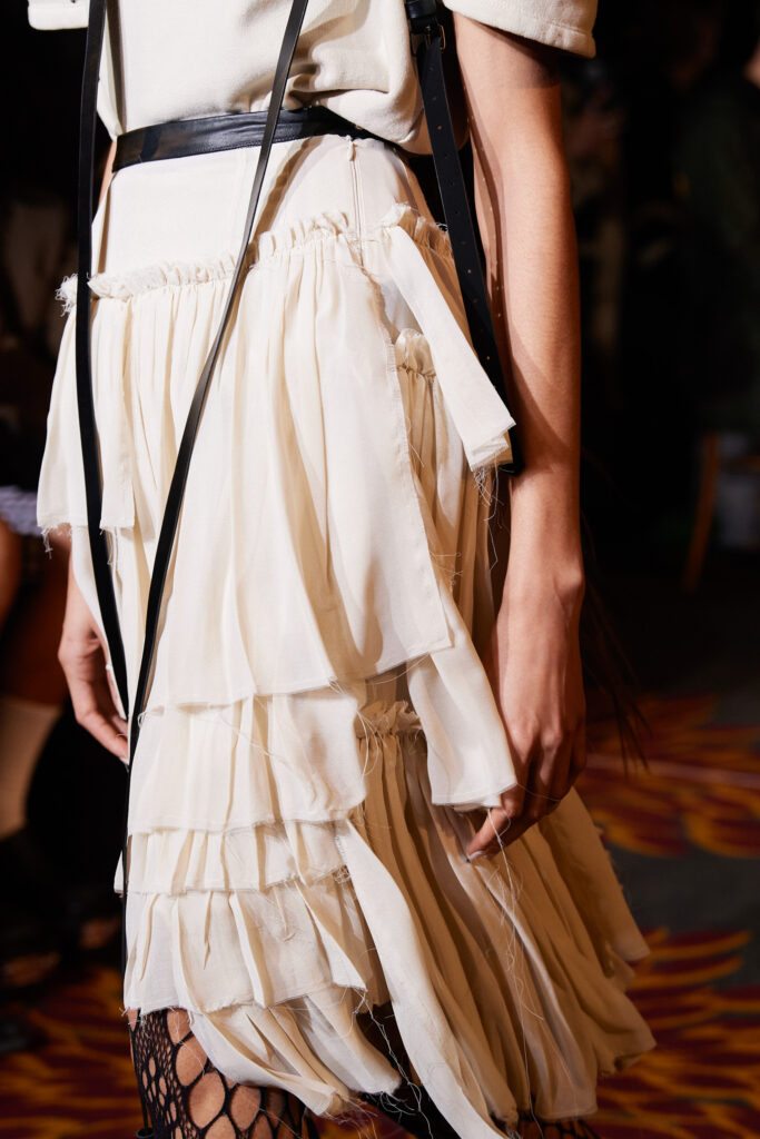 A girly appeal is inspiring detail like ruffles, volant and frills to be appropriated in more eccentric ways to introduce a sense of feminine fun. Similarly representative of new feminine spirit, empowered dslimfits remain strong. With a need for clean minimals, this shapes restore impactful no-fuzz silhouettes from midi to dramatic full-length. For a more fashionable look sophisticated cut-outs, buttoning tabs or multiple gatherings can be added too. And for embellishments a very delicate look is favored for the commercial range, while punk effects can attain a young and edgy client. For this most fashionable cohort, lingerie inspirations will continue to grow their momentum with lacing and hooks, while dramatic low waists and lowered belts and flounces depict the Millenial Y2K look.