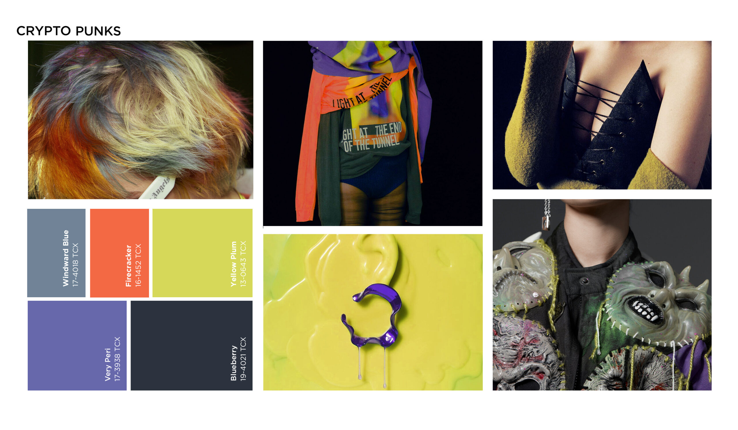 This visionary color story combines classic tones with contemporary shades, pairing strong acid lights with dark, desaturated hues. The unexpected color mix provides a refined sense of rebellion, that goes beyond classic subcultural palettes and suggests that new worlds are building. Mixing and matching familiar punk color stories with hyper-contemporary hues reinforces the digital aura of the trend. From a new limey yellow to the zeitgeist color very peri, this palette is an ode to the fusion of fungible and non-fungible worlds.