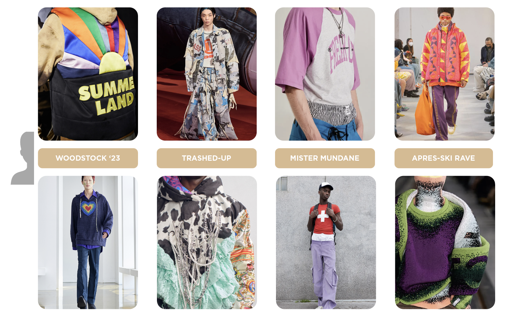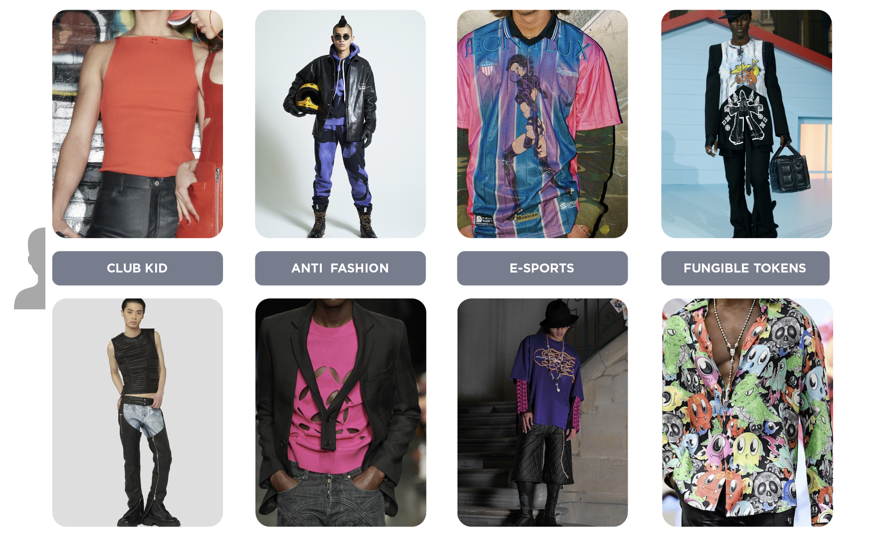 For AW23, young men will continue to explore the 90s and 2000s for fashion inspiration. The 90s club kid trend embraces a divergent masculinity, with tight-fitting pants and slightly cropped jersey tops. The look is drawing references from rave culture and EDM dance parties, distinctly liberating masculine sexuality and emphasizing the need for enhanced experiences. As subculture offers a means to create peer groups and like-minded communities, a feeling of rebellion and resentment and a wish for extreme revolt approaches fashion in an anti-fashion kind of way. This trend will be disrupting classic silhouettes and push for a punky, deconstructive looks. For this youth generation, gaming remains at the forefront of entertainment, creating hypes and online communities. E-sport is a trend that will propose a 2023 e-gamer uniform, far beyond the expected nerdy and slouchy look of classic gamers. Sportswear jerseys and wide shorts in digital color palettes are shaping the base of this new aesthetic and feel equally ready for web and world. Similarly ready for the metaverse, the new notion for digital fashion and NFTs reshapes the understanding of owning and creating. Things that are fungible regain importance next to the influx of non-fungible objects. For design that still aspires for the avatar look, adding licensed cartoon and character prints or gimmicky headwear that will bring digital figures to reality straight out of the metaverse.