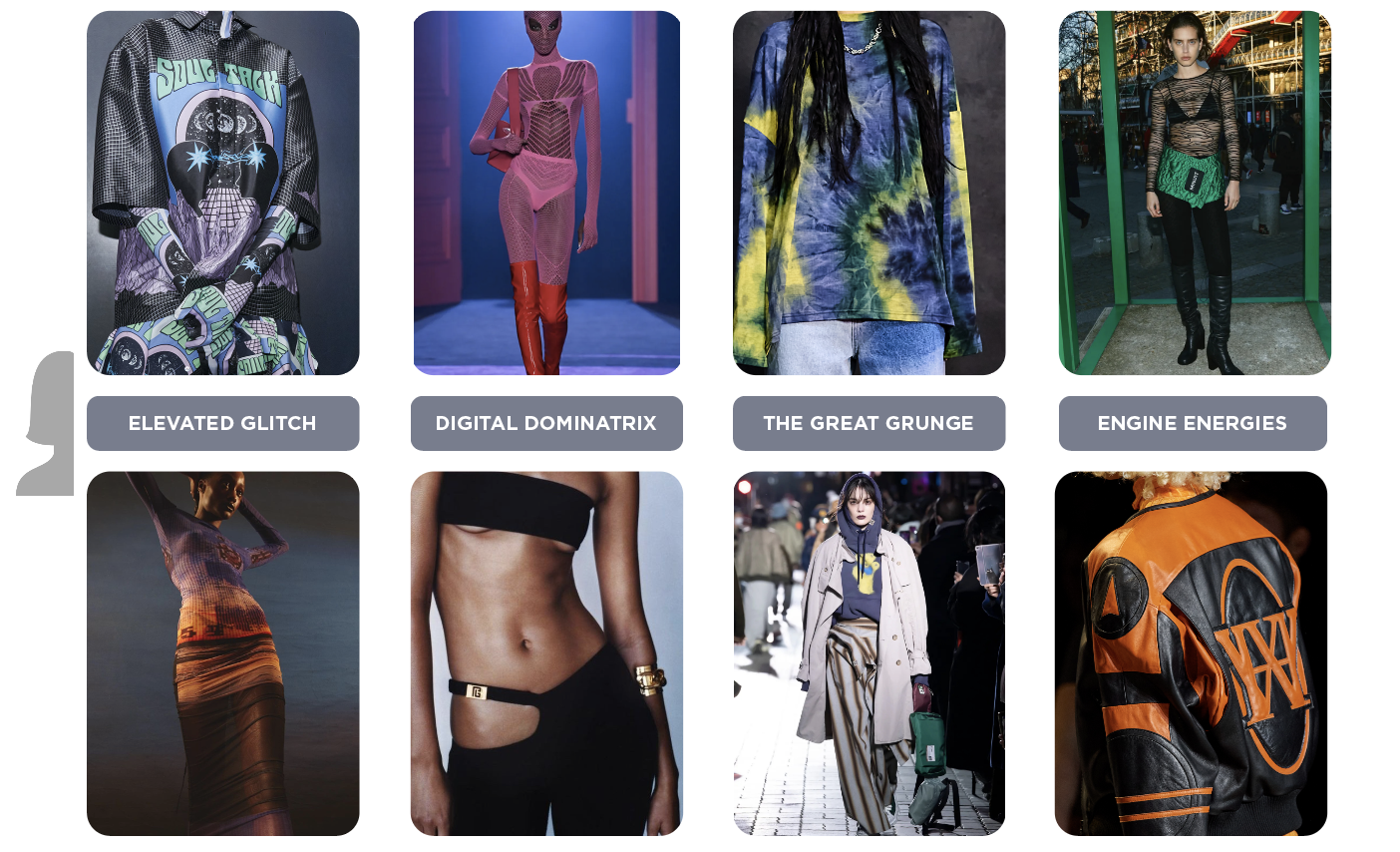 For crypto punks, streetwear and teenage universes are essential stylistic drivers. Younger generations are exploring their possibilities to build a life with the possibilities of Web 3.0. The possibilities of NFTs and digital design will be creating a #glitchcore influence. Gaming and cartoon elements will serve as color and print inspiration and update unexpected pieces from tailoring to classic jerseys styles. The current subversive aesthetics within the womenswear market remains and will experience a push towards the world of hidden desires and digital dominatrix themes. Platforms like onlyfans are gaining increasing popularity. This growth shows that sexuality is entering the public eye more than ever, pushing for a kinky or fetish-driven style. While this trend remains edgy, it is an important driver within the change-making spirit of our zeitgeist. Womenswear is currently infused with strong subculture influences that trace back to the Y2K nostalgia within fashion. The great grunge will propose an authentic grunge look for AW23. Based on used and washed-out pieces in oversized fits, the style aims to de-emphasize the silhouette and juxtapose the hyper-sexuality of dominatrix-driven styles. Lastly, a taste for engine energies defines trends related to motor-sports and racing styles. Leather remains a leading material and padded jackets or belts can suggest elements of motor-cycling uniforms, resonating the desire for an adrenaline-rush and more intense experiences.