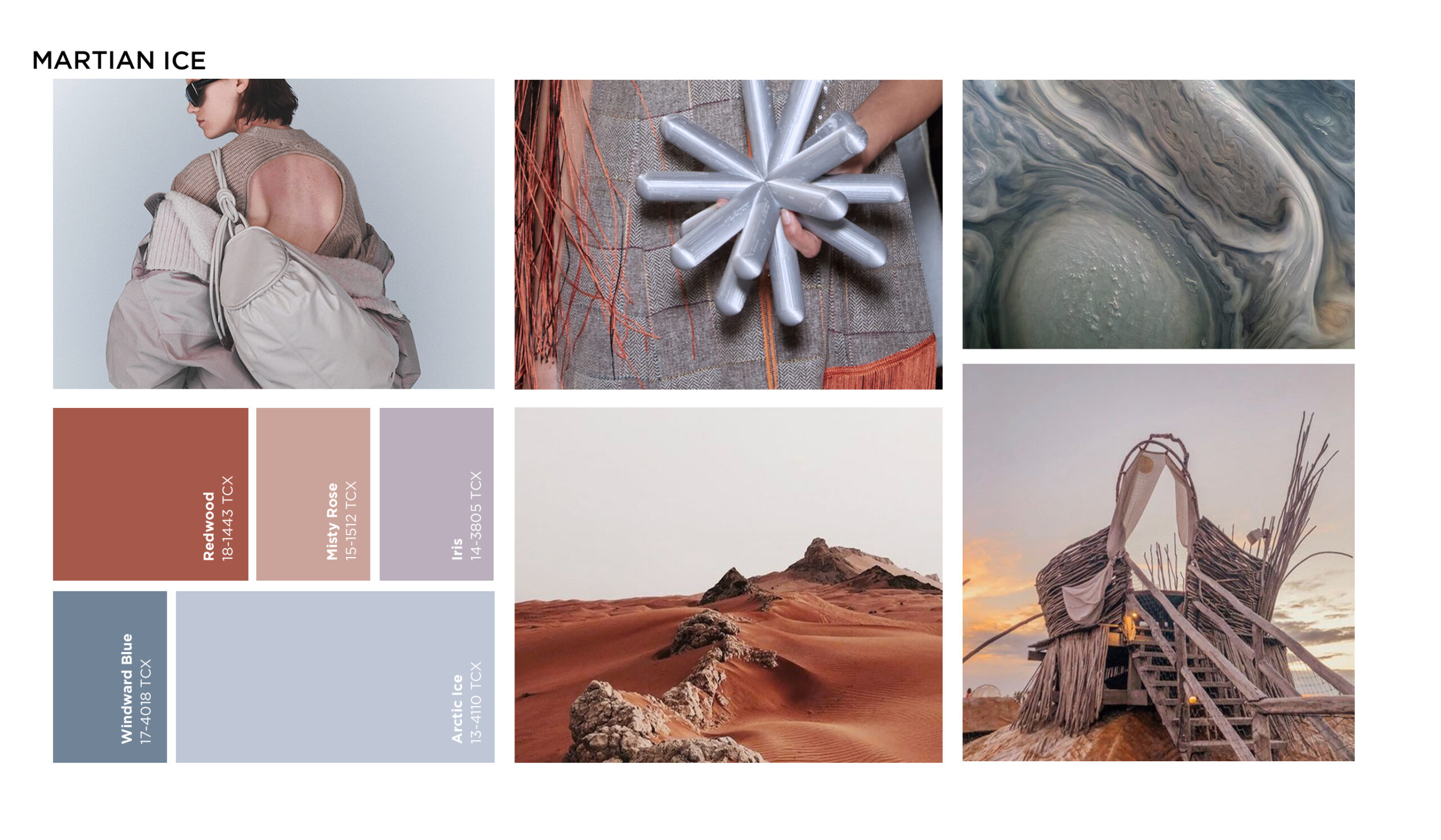 Martian Ice. 2023 will be expanding our trails into the solar system. The pandemic and the war have given us a taste of the apocalypse and certain are harnessing stronger survival instincts. To take the possibilities of technologies one step further, people will literally leave planet earth behind. Curious explorations will project consumers far-away into space in order to begin the construction of new communities and settlements. A pursuit to protect humankind evolves as our terrestrial solutions seem impossible to sustain our species longterm. Self-proclaimed heroes will be guided by their collective dream to persevere our kind in this doomed and uncertain era. With a new planet, they hope for new ways and possibilities of how life can evolve. Protective armors will become an integral part of survivalist being as consumers will need to shield and secure their existence in those unknown territories.