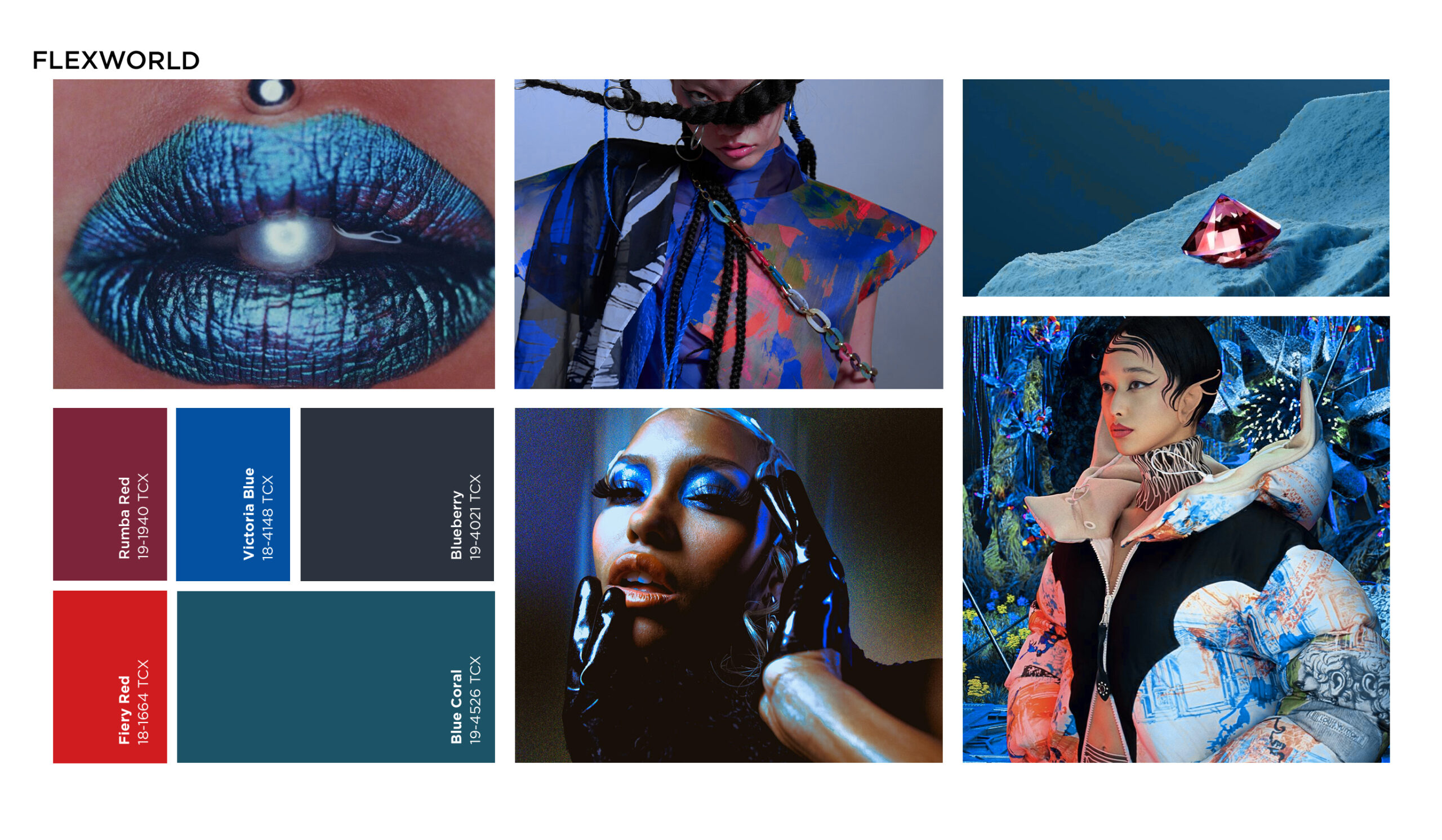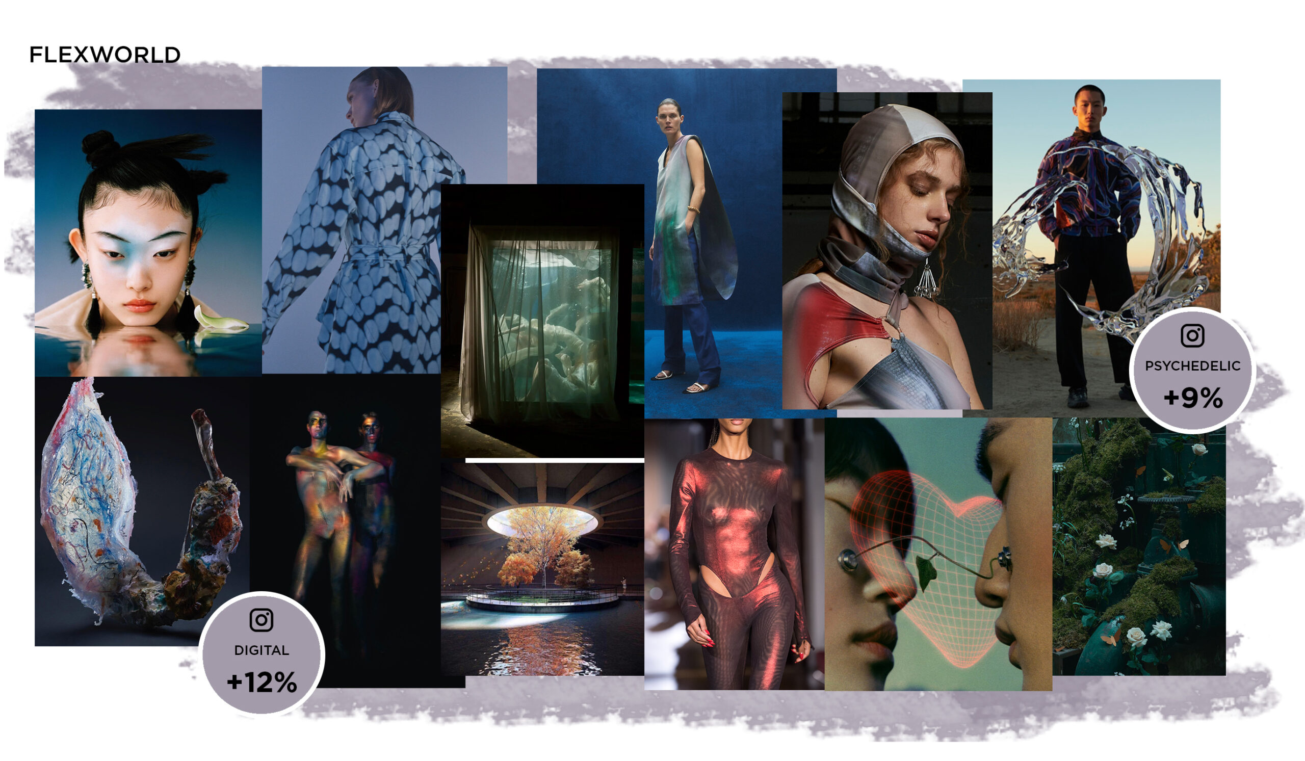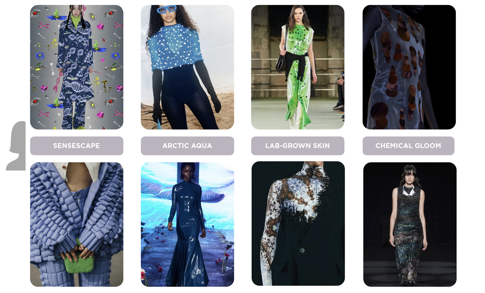 Flexworld dives into a science and tech-enhanced future and comes along a variety of unexpected design directions. Senses were suppressed for years, accelerating biological advancements to enhance human sensations. Those innovations inspire tactility of materials and print for AW23. On that note, sensecape will push fabric innovation to follow movement or adapt to the factors of our surrounding. Arctic aqua is exploring a colder narrative of ocean-ridden design themes, which begin to take movement within the industry. The unexplored territories and endless possibilities of oceanic worlds inspire excitement and fresh dreamscapes. Sleek and glossy silhouettes in stretchy nylons are leveling-up here. Another uncommon territory is introduced via lab-grown skins. The endless possibilities of bio-tech inspire creativity regarding new species and allow us to suggest surreal creatures now. A chemical gloom inspires occasion-led design. After a season of frivolous glitz and glam, AW23 feels more grounded and aware of the dangers embedded in the crisis. The beauty of industrial glooms and its dangerous flirtation with extreme technologies and bio-modifications propose a sense of seduction and allure here.