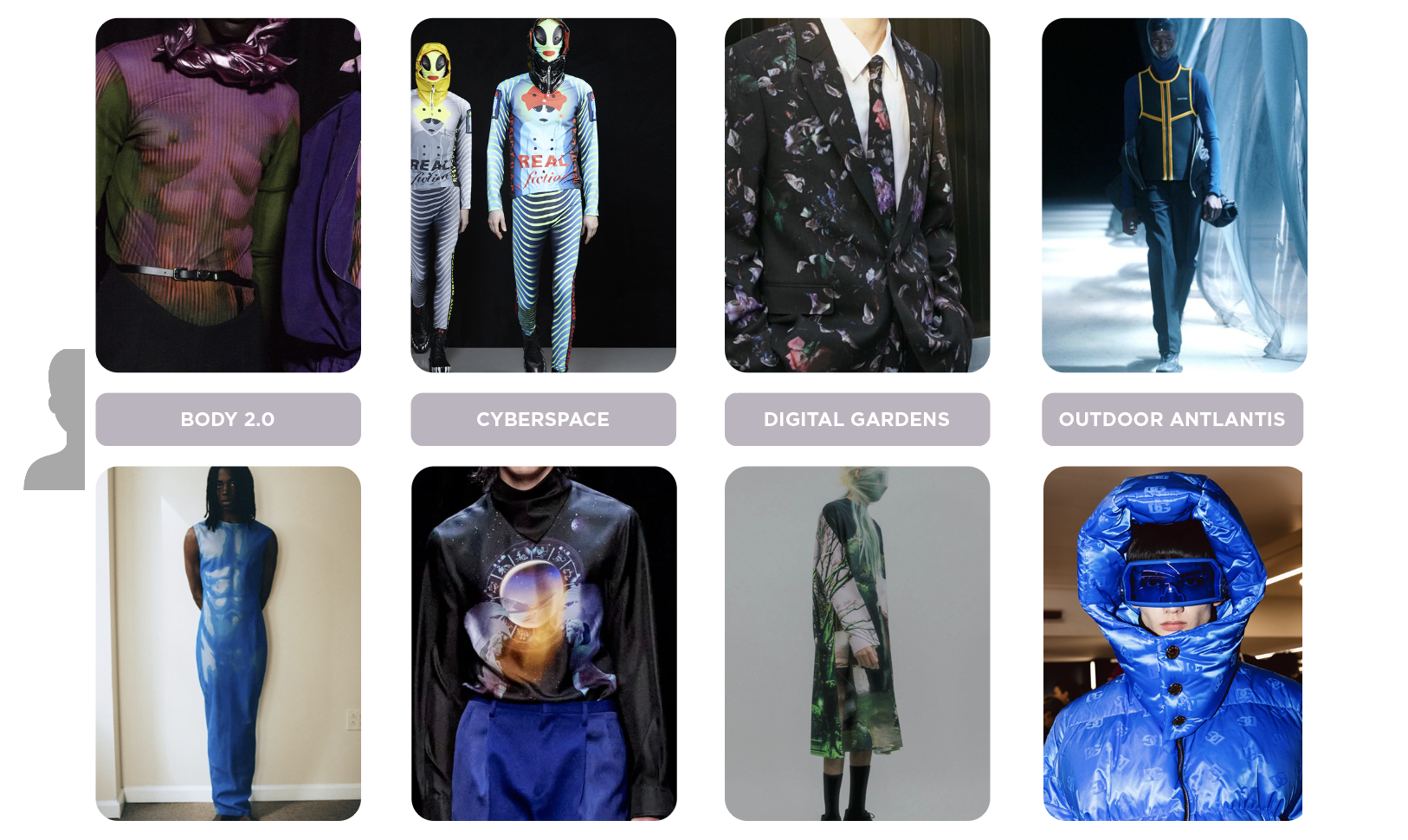 The idea of regeneration and the preservation of the planet has a strong influence on the menswear market. Flexworld proposes a new focus on the biological male silhouette for AW23, taking an X-ray perspective. The nude male body remains an uncommon object of inspiration for fashion, but through radically new ways of thinking it is coming in focus now. Prints reference the men’s form literally and more tailored silhouettes are some abstract way to propose such unexpected inspiration for design. The question of real vs fiction remains endearing and suggests new cyberspaces. Digitally enhanced or inspired prints, as well as avatar-like skins propose bodysuits in augmented color contrasts. As part of new hybrid worlds, digital gardens offer beautifully dark outlook of new worlds. Based on nature and the virtual space, the menswear market will explore the emerging aqua themes via a look for an outdoor atlantis. As an option for the ski holidays, diver suits and underwater details will serve as the drivers for outdoors themes now. Overall inspired by a palette of deep blues, new oceans and new aves are forming.
