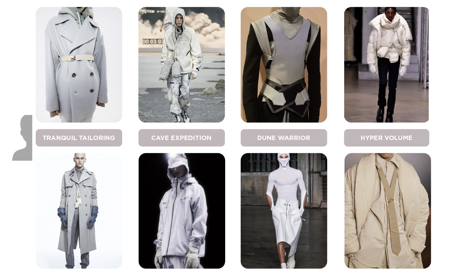 Menswear takes a turn towards streamlined design for this more futuristic trend. Tranquil tailoring offers a sleek new uniform silhouettes in more serene palettes with rounded-off edges. Soft surfaces simultaneously propose subtle tactility and add a more intimate note to the traditionally distant tailoring universe. No-fuzz is key here to focus on the essential. For future cave expeditions a new level of #gorpcore emerges. Light performance materials and utilitarian features pair with iconic outerwear jackets and trousers. Pushing for more and more utility, the reduced palette and stylized features are keeping a modern look. Another trend suggests a look for dune warriors. The trend draws reference from fighter characters of otherworldly gaming settings. Playing with form-fitting silhouettes, extreme cut-lines and armor-like elements is enhancing to the warrior look. Lastly, hyper volumes propose a design path for stylized, yet performing snow stories. Exploring diverse shapes based on quilted and puffed materials adds a new dimension to forms. This element of the unknown is taking consumers to seemingly unknown territory and appealing to explorational and pioneering minds.