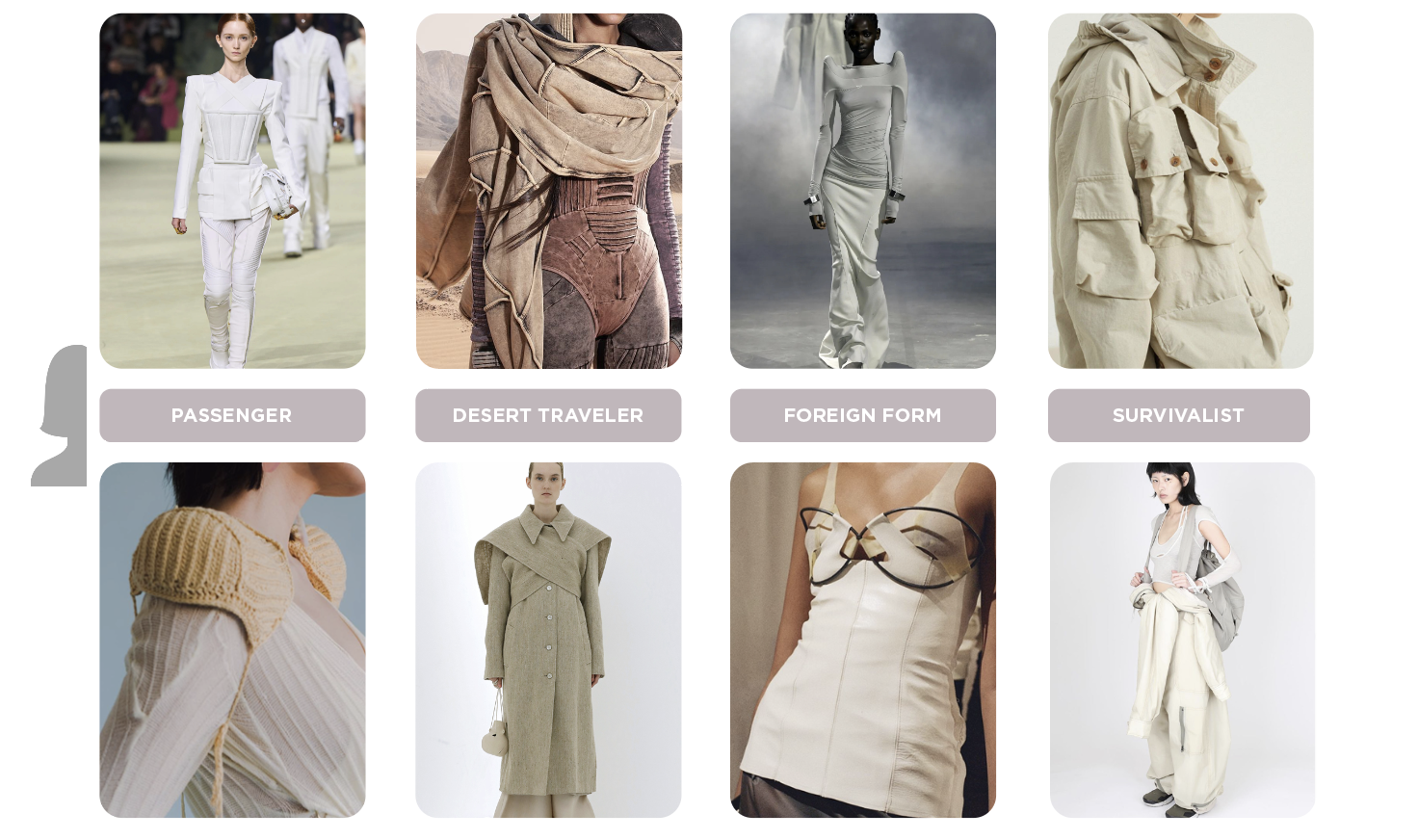 For the Martian Ice theme, design trends range from extreme pragmatism to serene minimal looks. A passenger theme, reminiscent of space-suits and armors, will create a protecting uniform for the next adventure and the new season. The theme is evolving recent collections surrounding the shielding looks of racing and warrior universes. Appropriating the intriguing dune and desert traveller inspiration of summer season for colder months, the sleek snowdrift look will incorporate hood and shawl-like elements for an airy warrior feel. On a more conceptual note, foreign forms propose new approaches to the female body. While women’s form is already explored and celebrated for all of its uniqueness, design will explore more experimental and imaginative shapes for AW23. Lastly, a need for post-apocalyptic functionality sees survivalist themes with strong utilitarian focus arise for AW23. With modular elements and practical add-ons like hooks, this trend provides high levels of reassurance and preparation for unexpected obstacles.