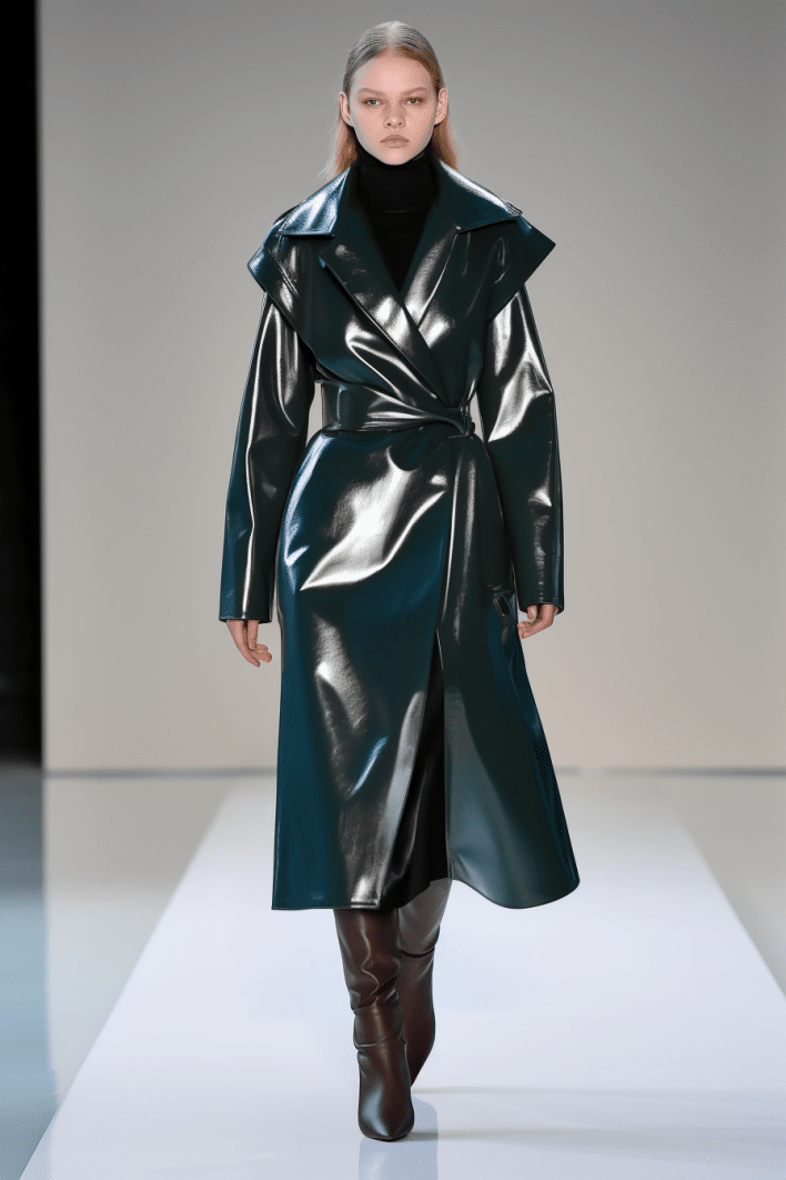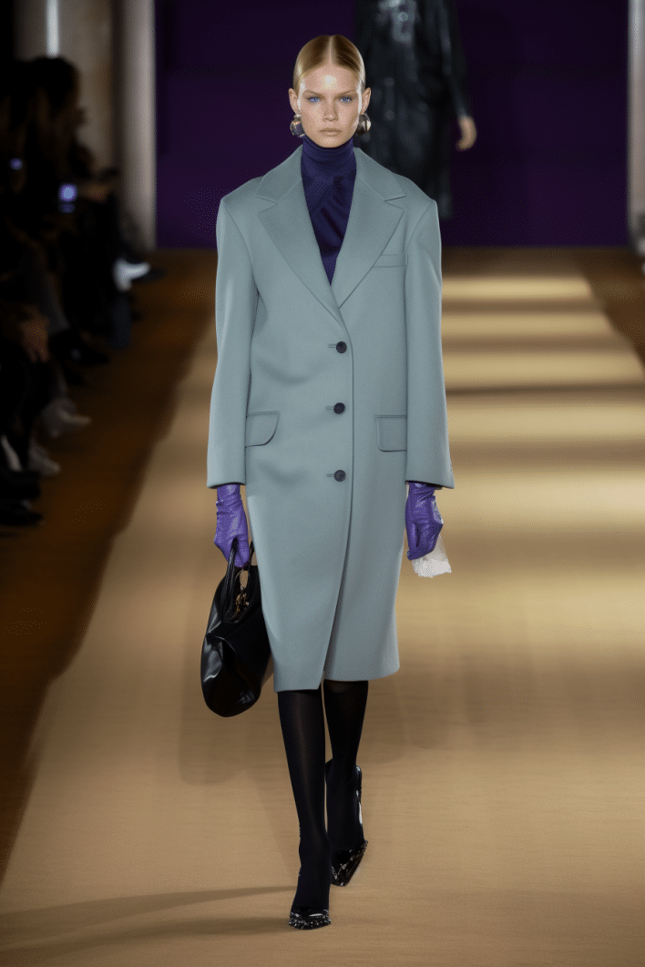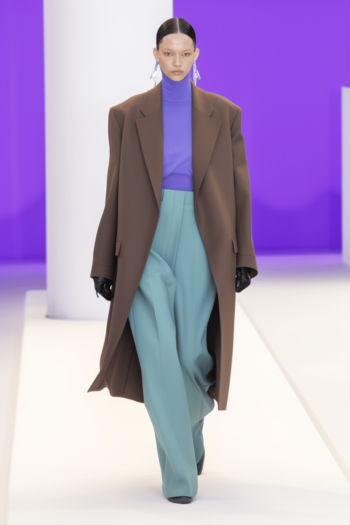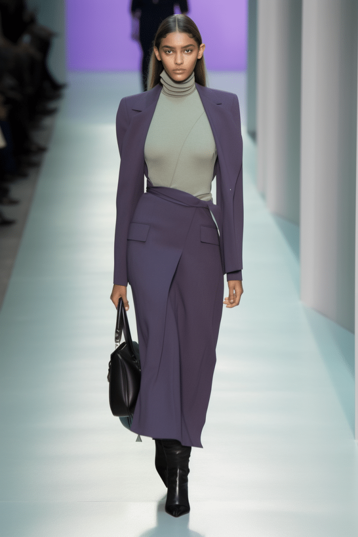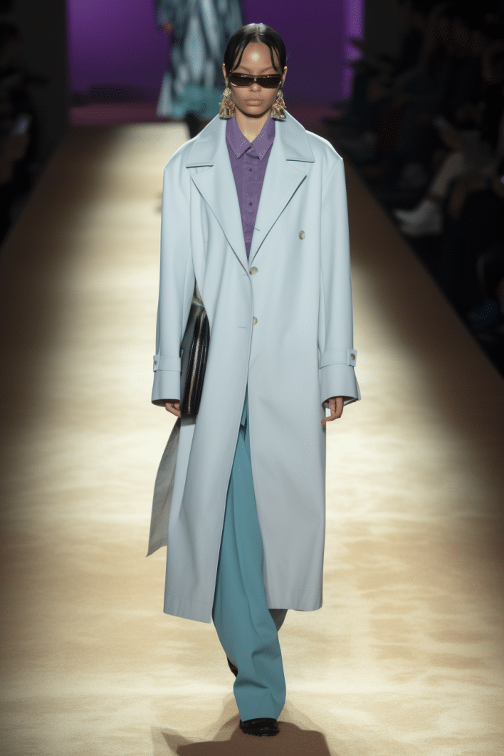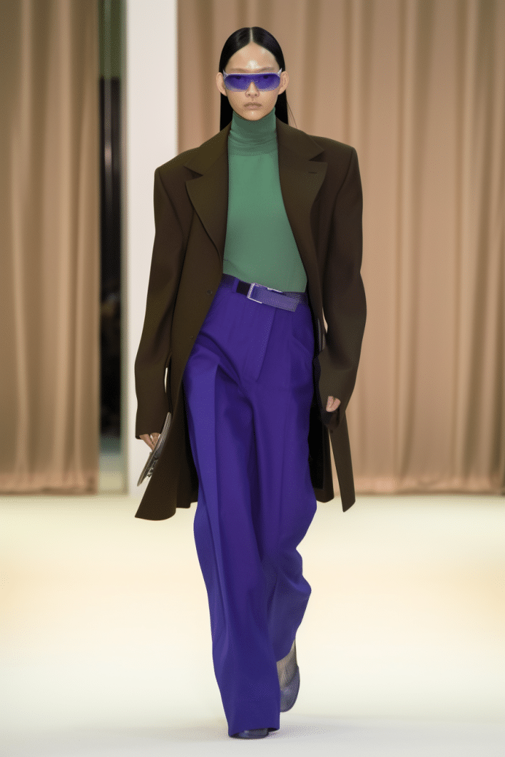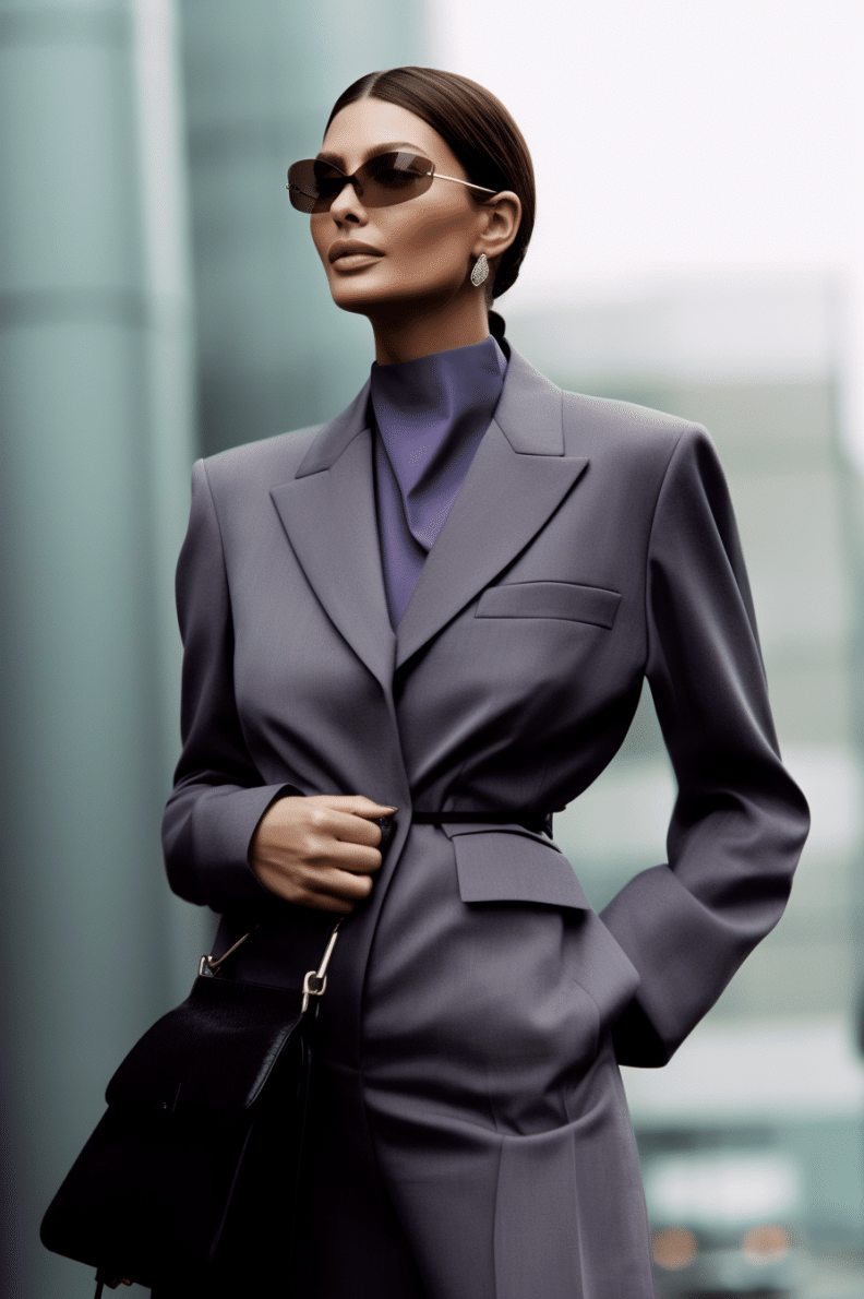 This macrotrend embodies a visionary mindset, characterized by intelligence, adaptability, and forward-thinking. Rooted in corporate minimalism, this trend presents a future business look that reworks pieces with a fresh perspective. The aesthetic is both essential and refined, embracing simplified lines and sleek design elements that create almost clinical silhouettes with futuristic notions. At its core, this trend celebrates innovation and timelessness, seamlessly integrating tech elements into office wear to create a harmonious fusion of form and function. Each piece exudes a sense of understated elegance, with a focus on clean silhouettes and versatile styling. Bold color highlights punctuate the miniaml and sleek look, adding vibrancy and energy to the ensemble. Here monochrome silhouettes can be disrupted or new color-block can be explored. Sharp contours define each piece, contributing to the overall sense of precision and sophistication of the style. Embracing the mantra of „less is more,“ this trend prioritizes essential pieces that are both versatile and impactful, allowing for effortless integration into various wardrobes. The result is a shar revisited corporate look that offers a seamless transition from the office to any other setting.