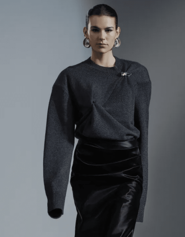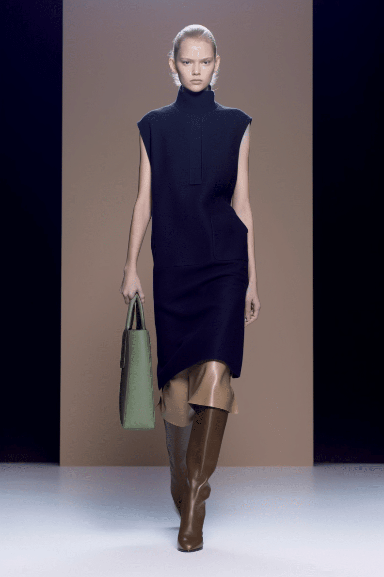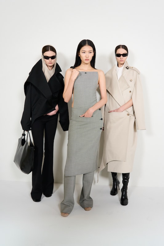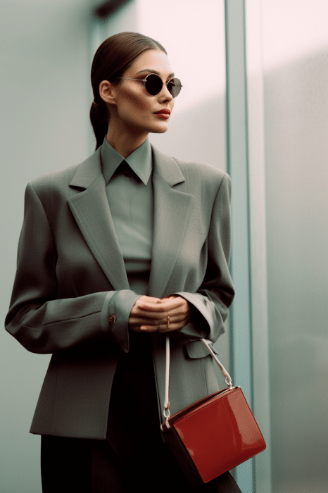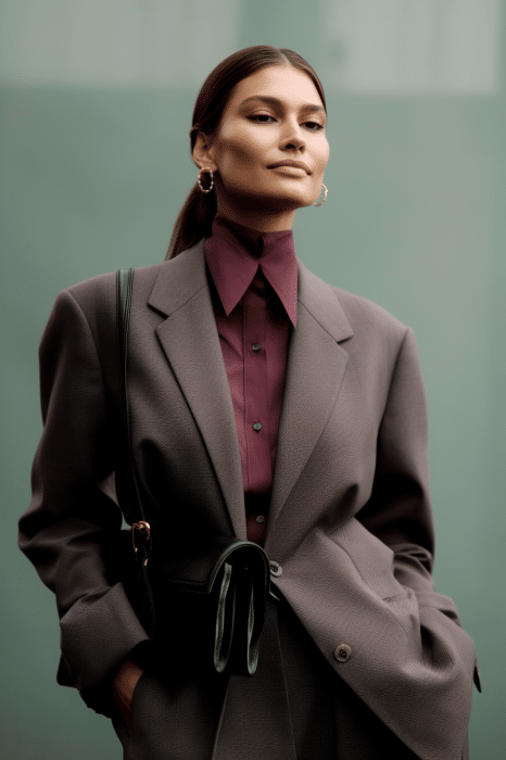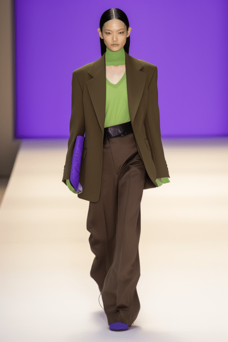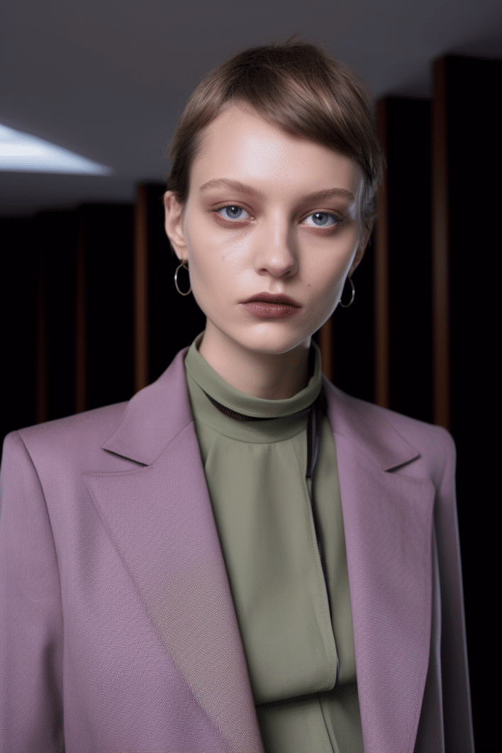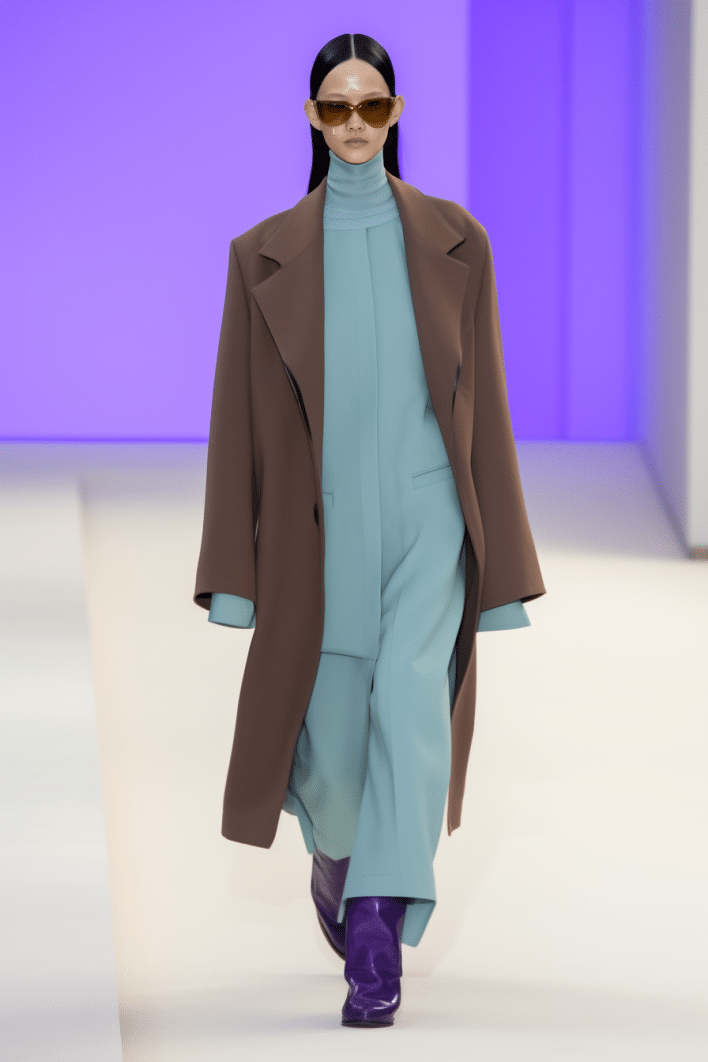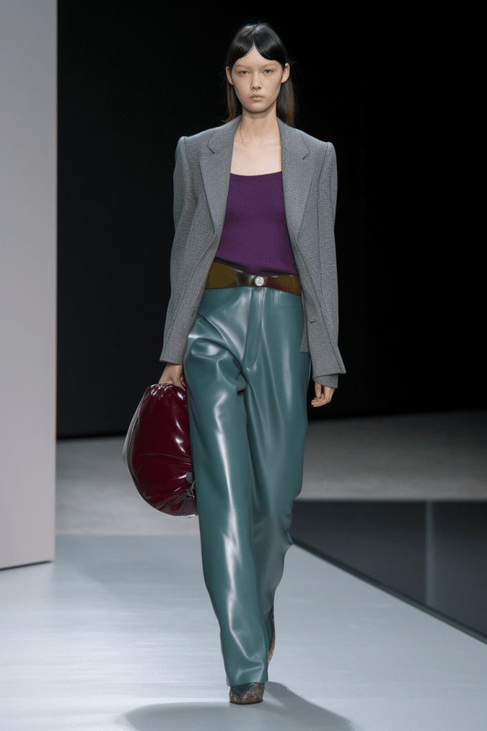 This macrotrend embodies a visionary mindset, characterized by intelligence, adaptability, and forward-thinking. Rooted in corporate minimalism, this trend presents a future business look that reworks pieces with a fresh perspective. The aesthetic is both essential and refined, embracing simplified lines and sleek design elements that create almost clinical silhouettes with futuristic notions. At its core, this trend celebrates innovation and timelessness, seamlessly integrating tech elements into office wear to create a harmonious fusion of form and function. Each piece exudes a sense of understated elegance, with a focus on clean silhouettes and versatile styling. Bold color highlights punctuate the miniaml and sleek look, adding vibrancy and energy to the ensemble. Here monochrome silhouettes can be disrupted or new color-block can be explored. Sharp contours define each piece, contributing to the overall sense of precision and sophistication of the style. Embracing the mantra of „less is more,“ this trend prioritizes essential pieces that are both versatile and impactful, allowing for effortless integration into various wardrobes. The result is a shar revisited corporate look that offers a seamless transition from the office to any other setting.