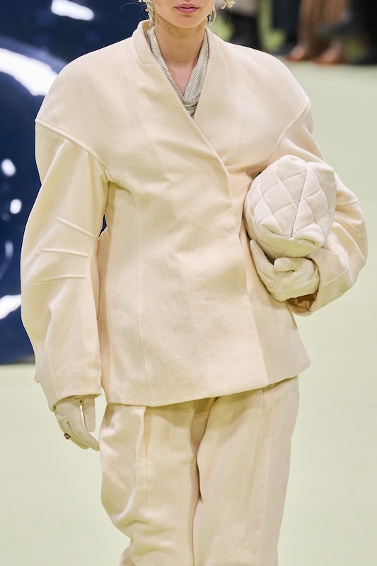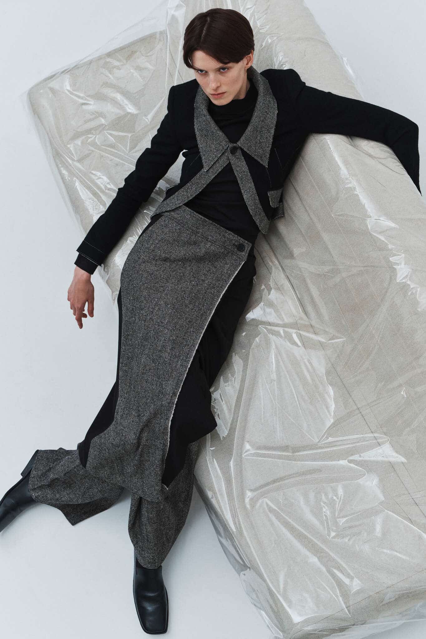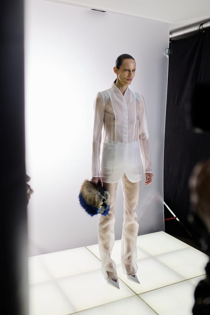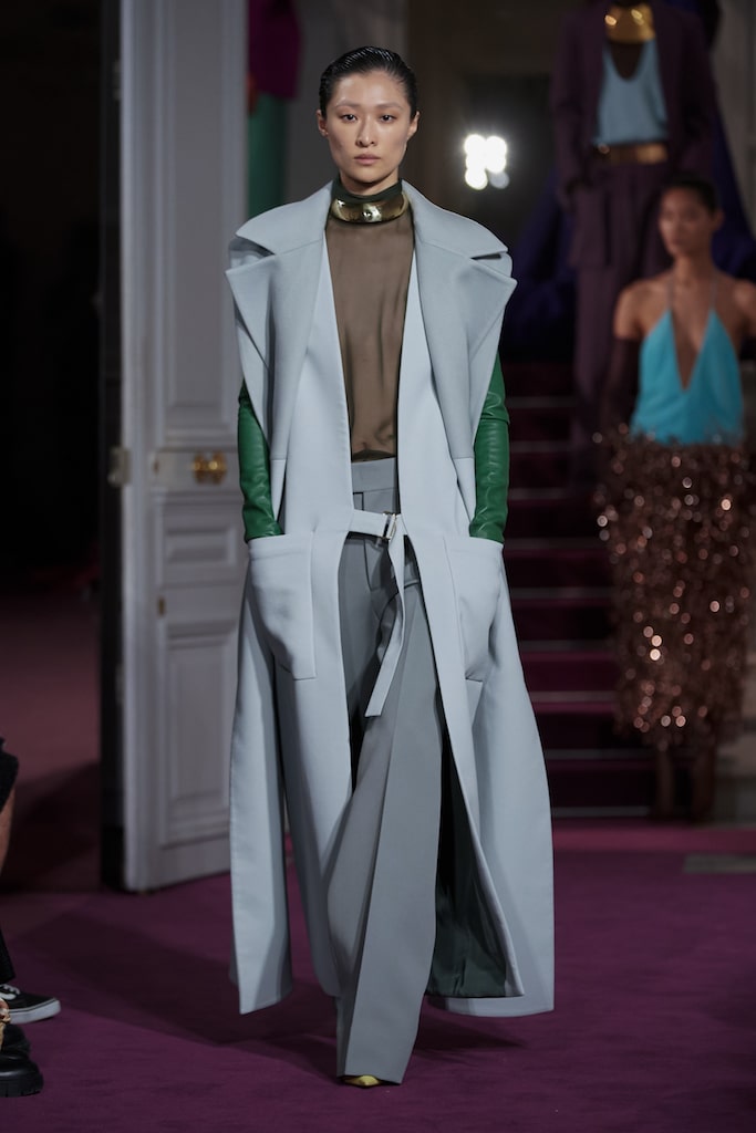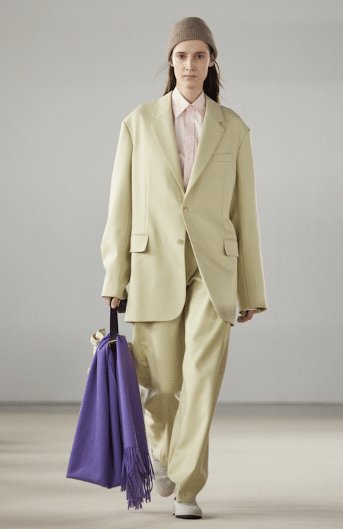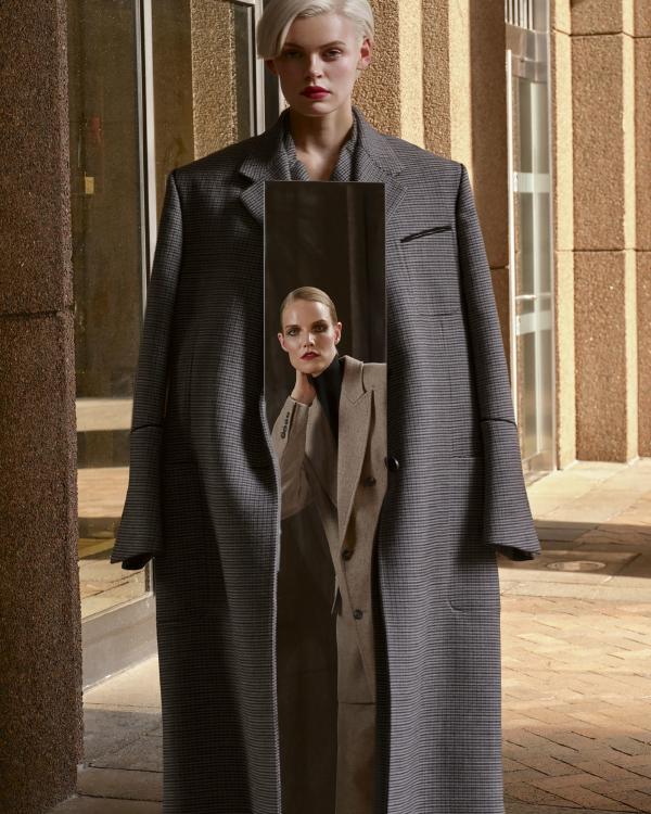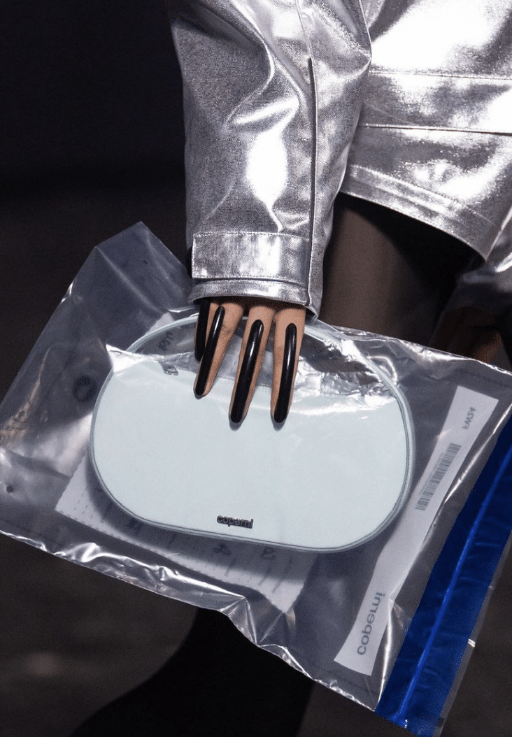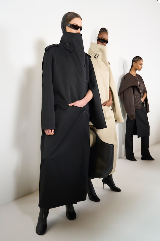 This macrotrend embodies a visionary mindset, characterized by intelligence, adaptability, and forward-thinking. Rooted in corporate minimalism, this trend presents a future business look that reworks pieces with a fresh perspective. The aesthetic is both essential and refined, embracing simplified lines and sleek design elements that create almost clinical silhouettes with futuristic notions. At its core, this trend celebrates innovation and timelessness, seamlessly integrating tech elements into office wear to create a harmonious fusion of form and function. Each piece exudes a sense of understated elegance, with a focus on clean silhouettes and versatile styling. Bold color highlights punctuate the miniaml and sleek look, adding vibrancy and energy to the ensemble. Here monochrome silhouettes can be disrupted or new color-block can be explored. Sharp contours define each piece, contributing to the overall sense of precision and sophistication of the style. Embracing the mantra of „less is more,“ this trend prioritizes essential pieces that are both versatile and impactful, allowing for effortless integration into various wardrobes. The result is a shar revisited corporate look that offers a seamless transition from the office to any other setting.