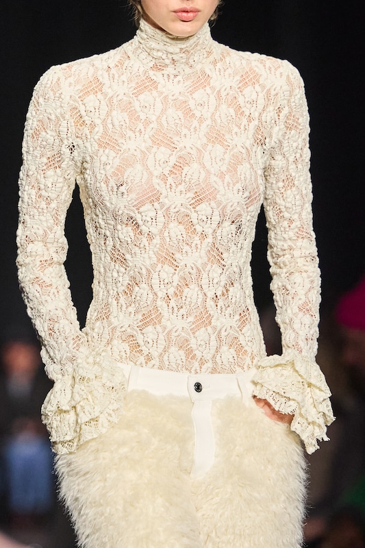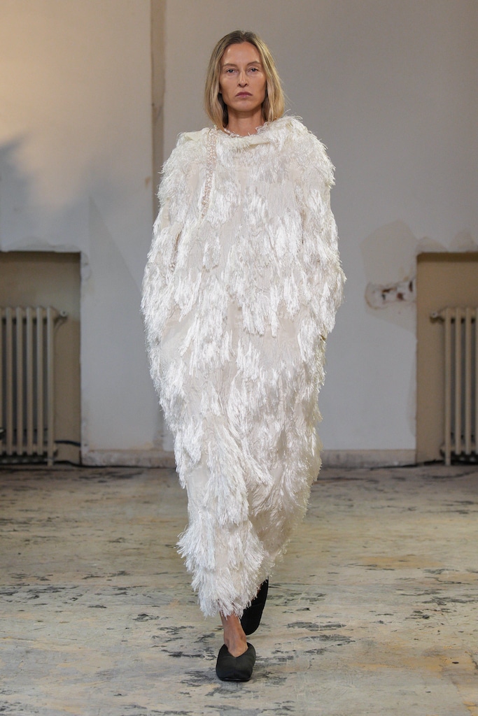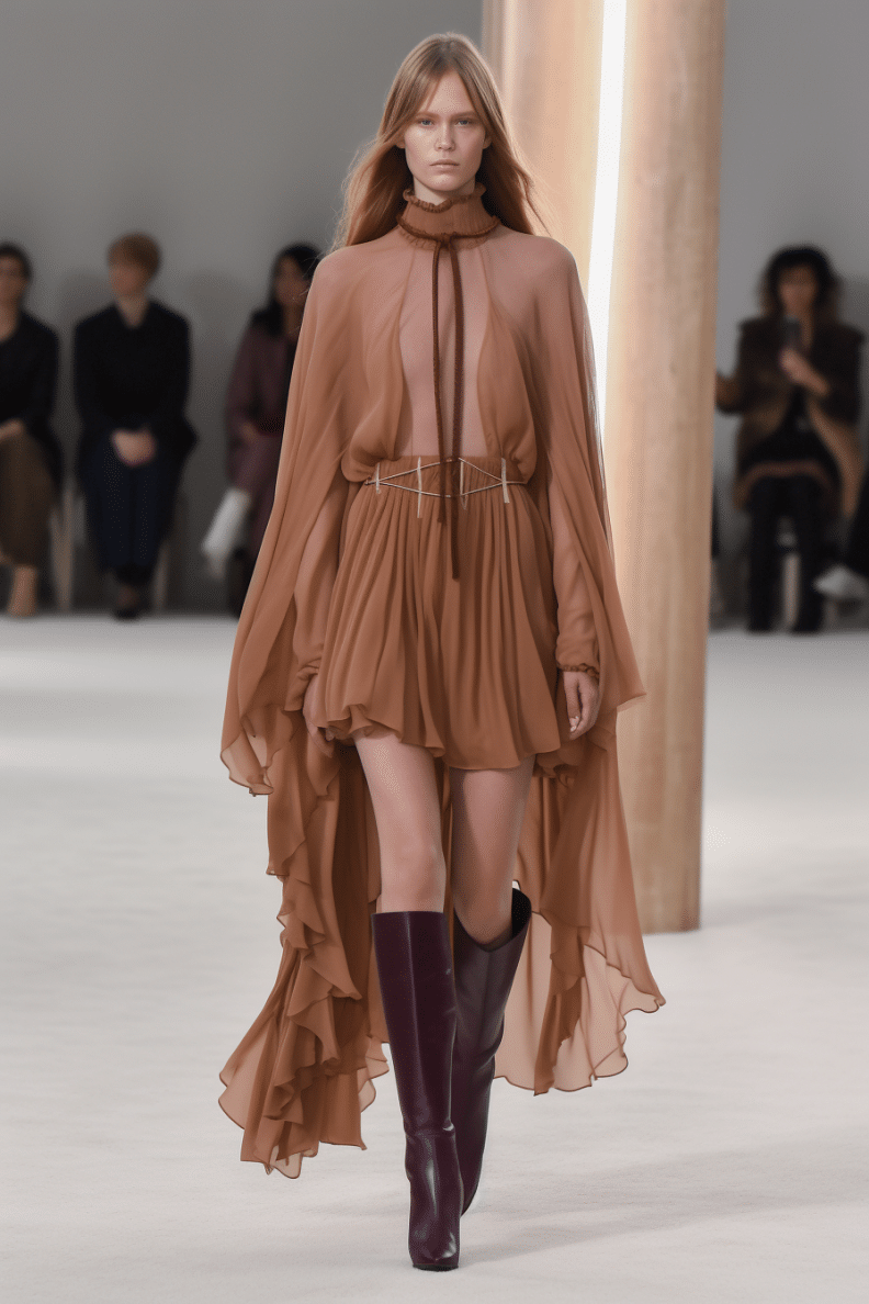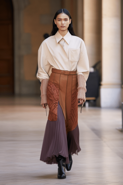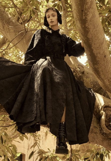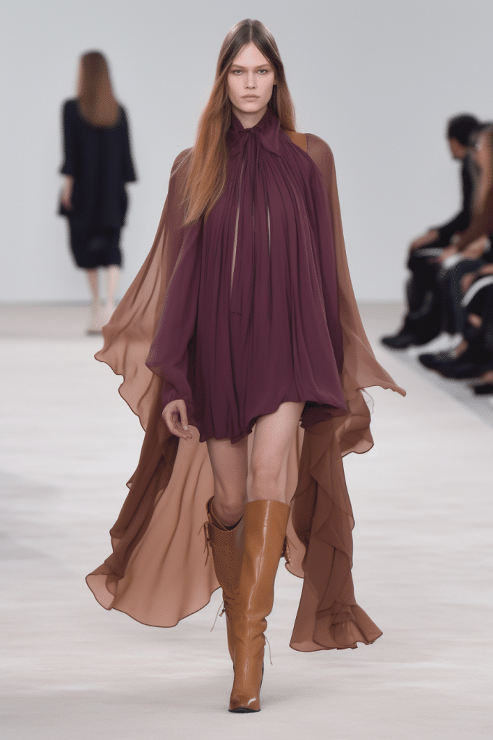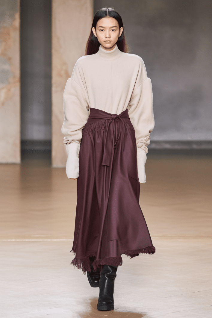 The macrotrend channels a mindset of restorative contemplation, drawing inspiration from austere ancestral traditions. Here, prevailing rigor and restraint are reviewed through more surereal lenses. It evokes a sense of reverence for past tarditions while embracing the present moment with inner peace and mindfulness. The aesthetic narrative unfolds from monk to priestess, where simplicity and modesty intertwine with a sense of splendor. Surreal modest dressing takes center stage. In black and whites, minimal monk-like silhouettes exude a sense of sacred elegance. While sacred nomads come in caped styles to add a touch of drama and mystique to the story. Heirloom additions of lace, openwork, or crafted knits and fringes add a touch of artisanal craftsmanship and heritage. Primal elements and ceremonial minimalism are underlining new looks and connect us to earth and spirituality. Each piece exudes a sense of active zen, inviting wearers to find plenitude in movement and stillness alike. This trend puts a focus on artisanal craftsmanship and heritage, creating a sense of connection to our roots. Overall, it offers a sanctuary in a fast-paced world, embracing the beauty of simplicity and finding solace in the timeless traditions of the past. It‘s a reminder to slow down, reflect, and find beauty in the quiet moments of life.