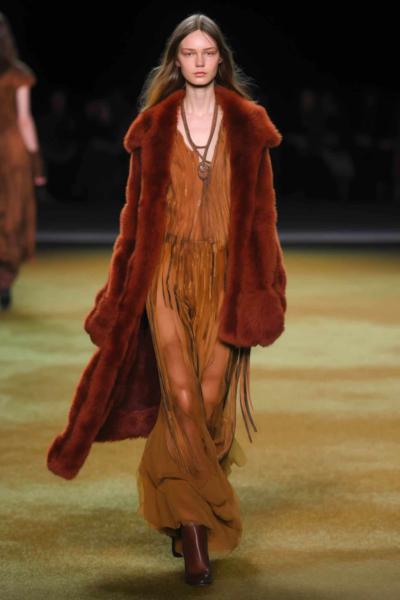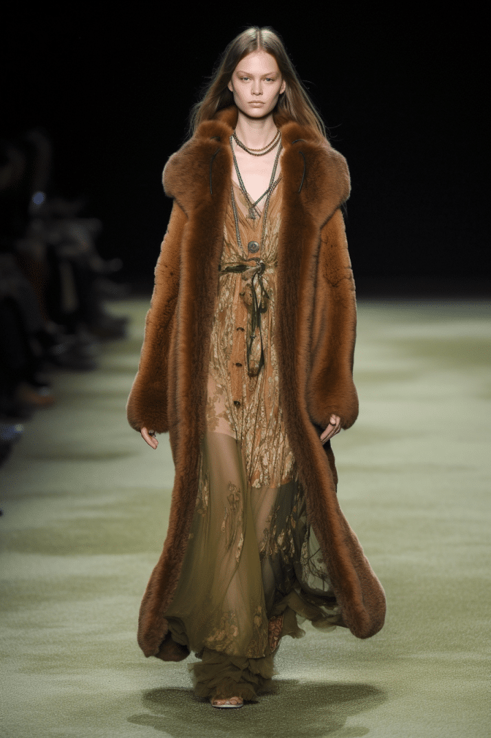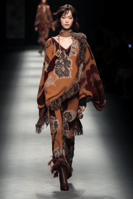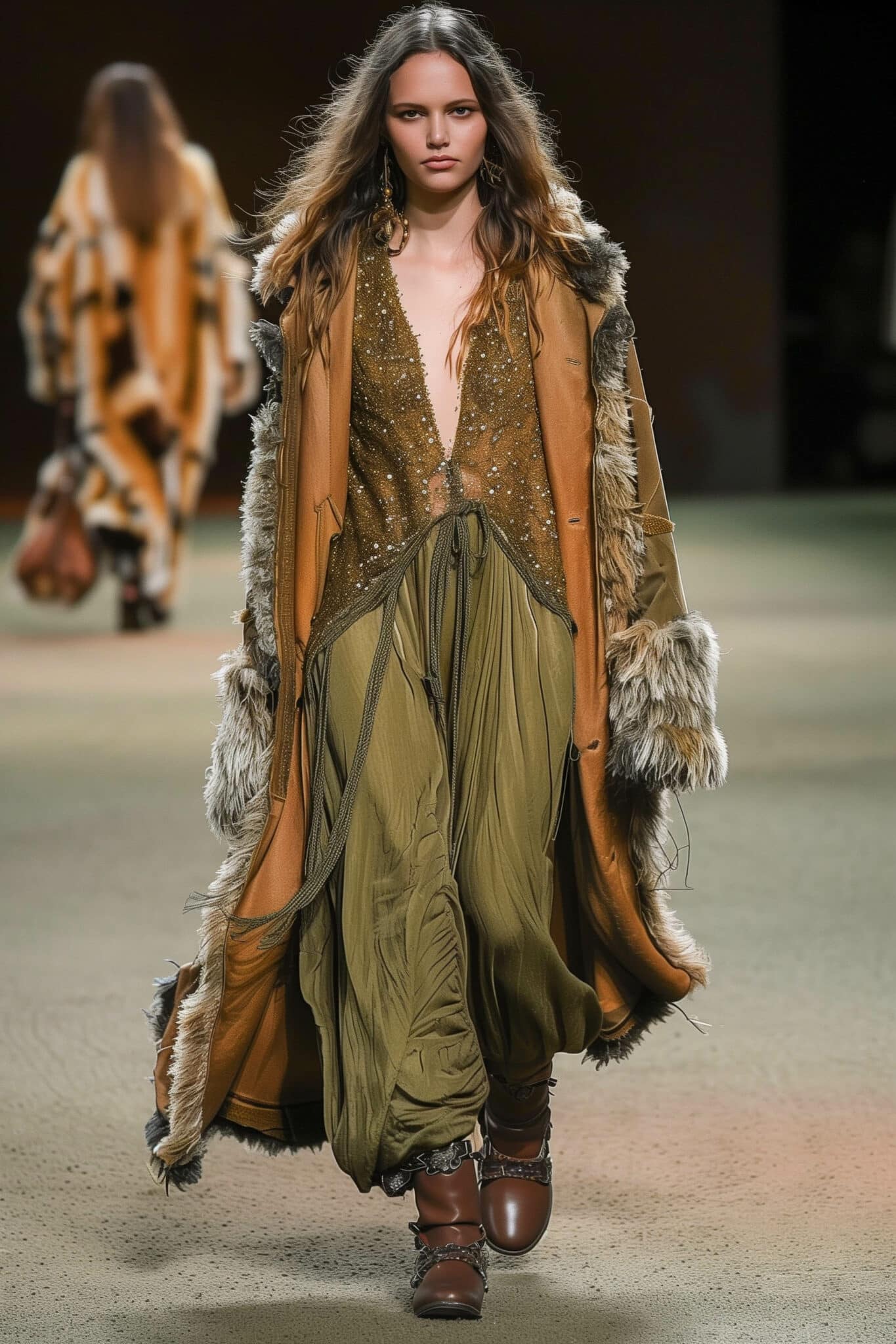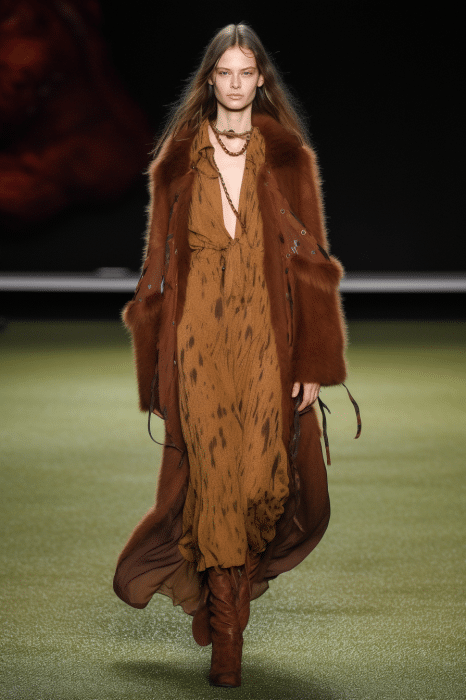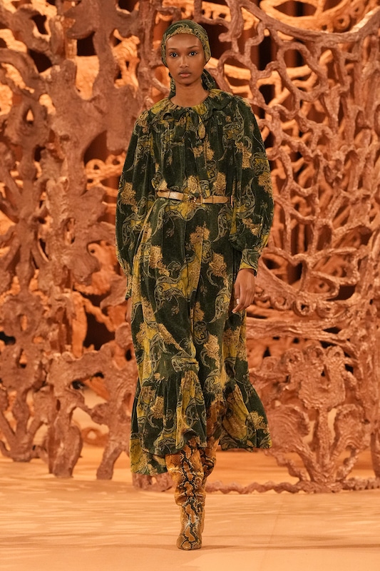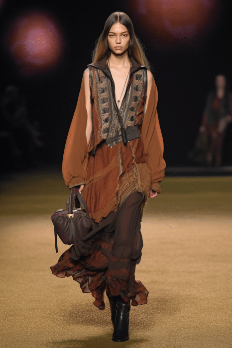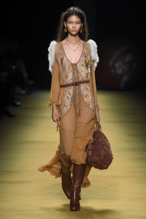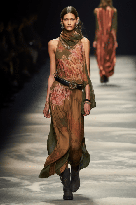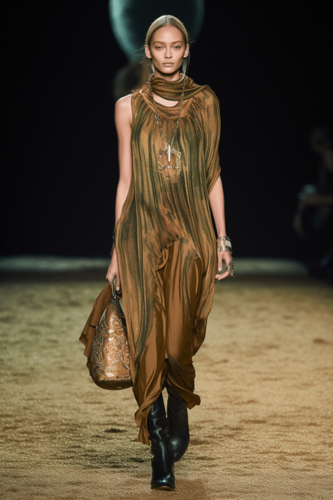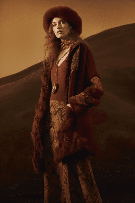 The aesthetic narrative fuses earthy stories and celestial notions, crafting new nomadic silhouettes in maxi length that billow with the whispers of ancient wisdom. Primal bohemian patterns embellish textiles, while layering and drapes create a sense of mystery. Chic silhouettes are juxtaposed with wilderness textiles and color palettes, marrying urban sophistication with the raw beauty of the untamed wilderness.