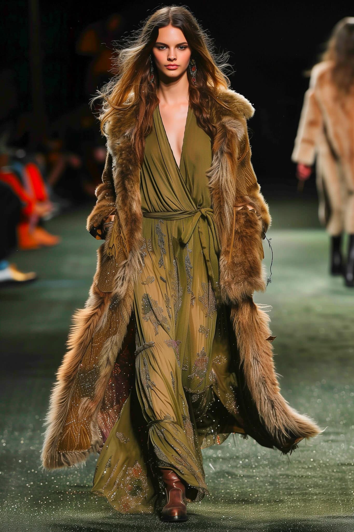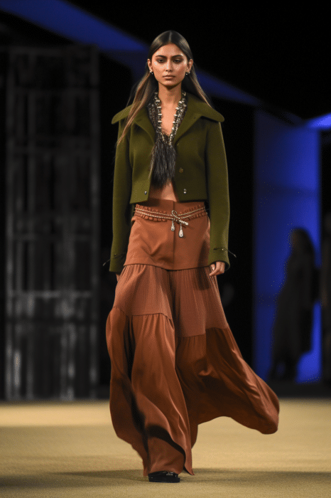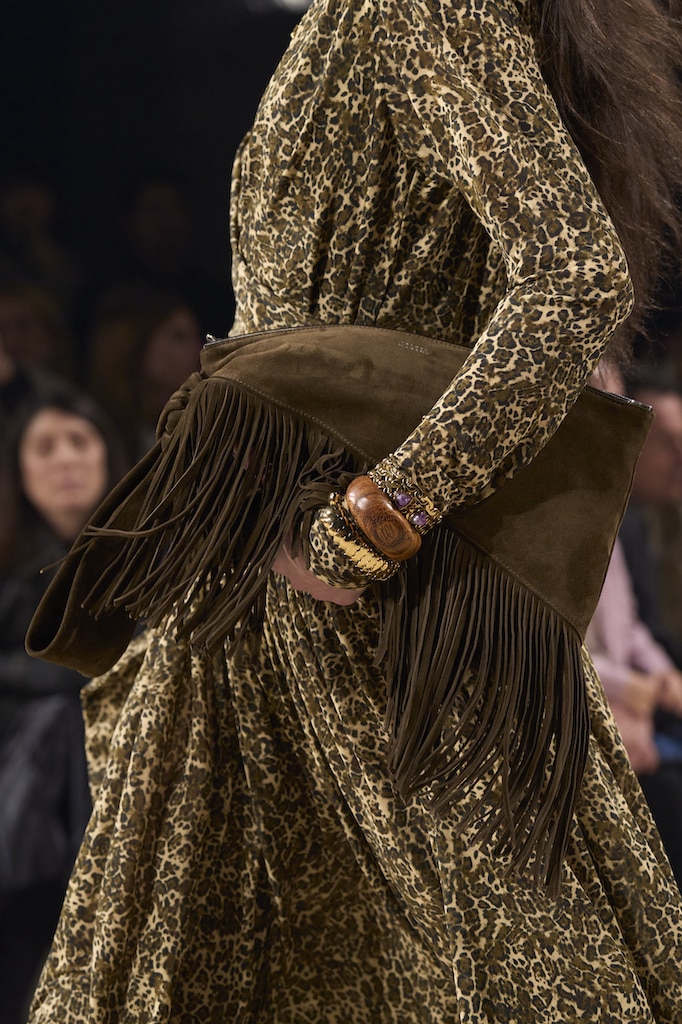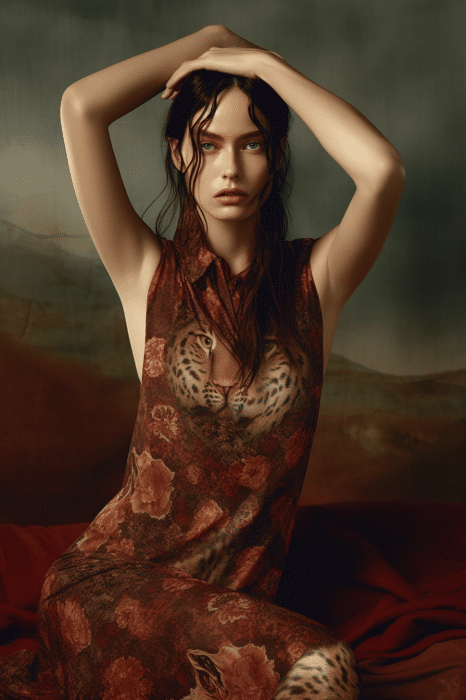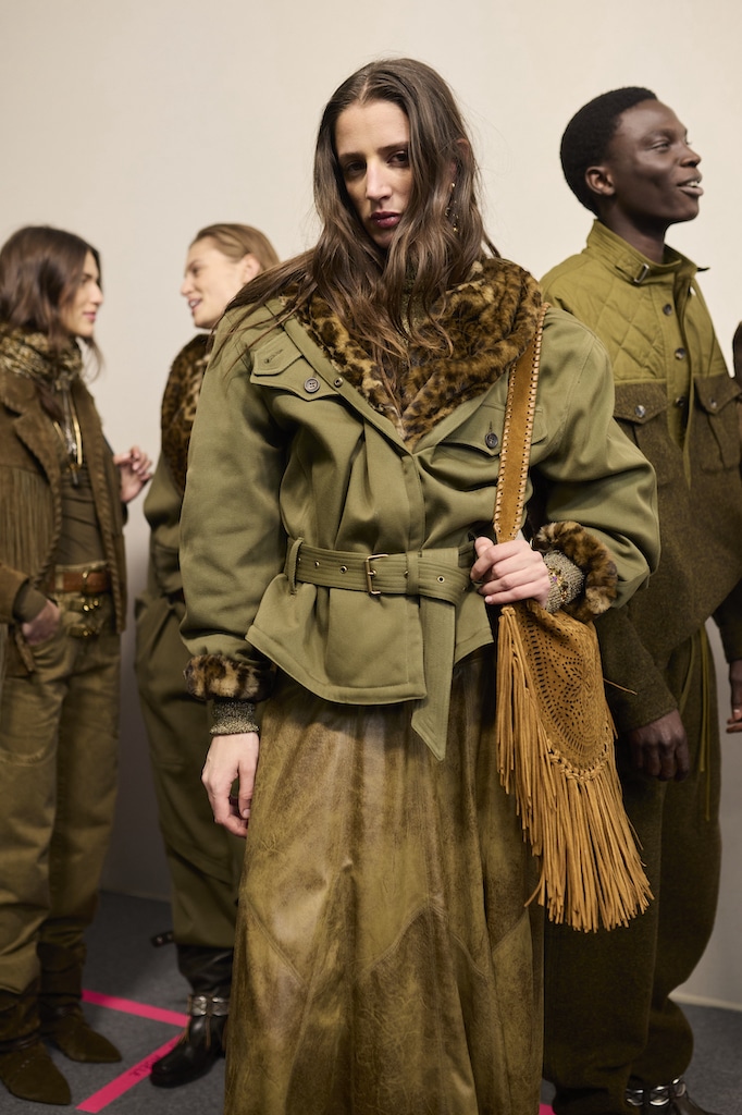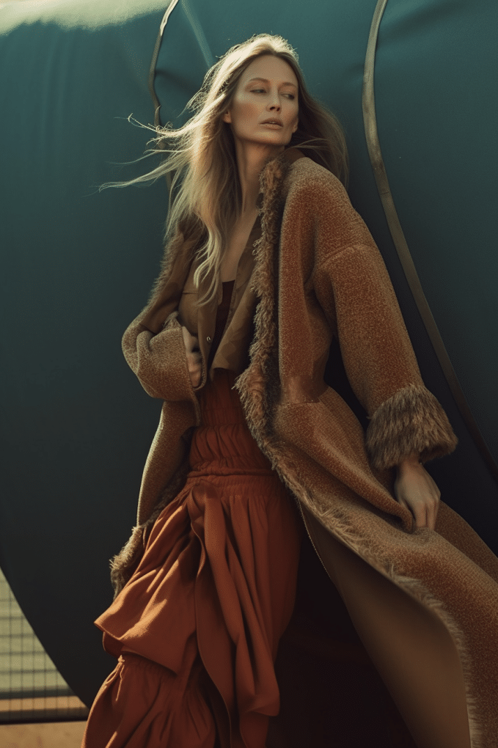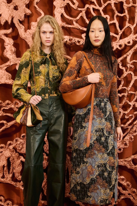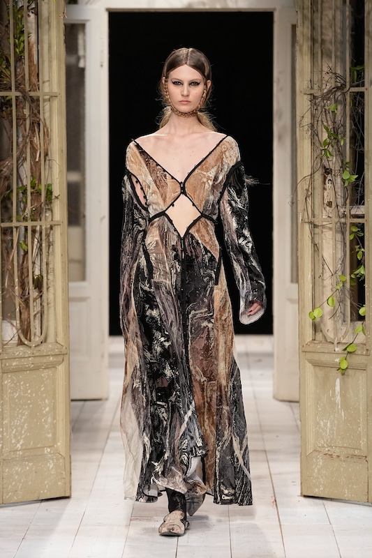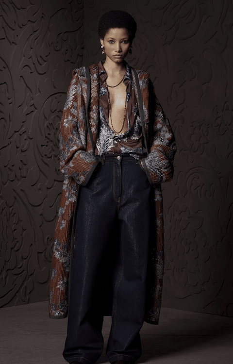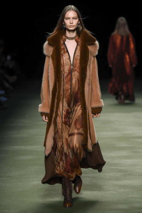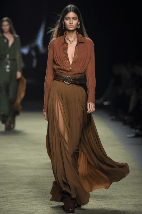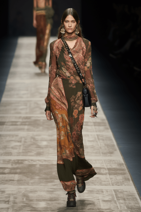 The aesthetic narrative fuses earthy stories and celestial notions, crafting new nomadic silhouettes in maxi length that billow with the whispers of ancient wisdom. Primal bohemian patterns embellish textiles, while layering and drapes create a sense of mystery. Chic silhouettes are juxtaposed with wilderness textiles and color palettes, marrying urban sophistication with the raw beauty of the untamed wilderness.