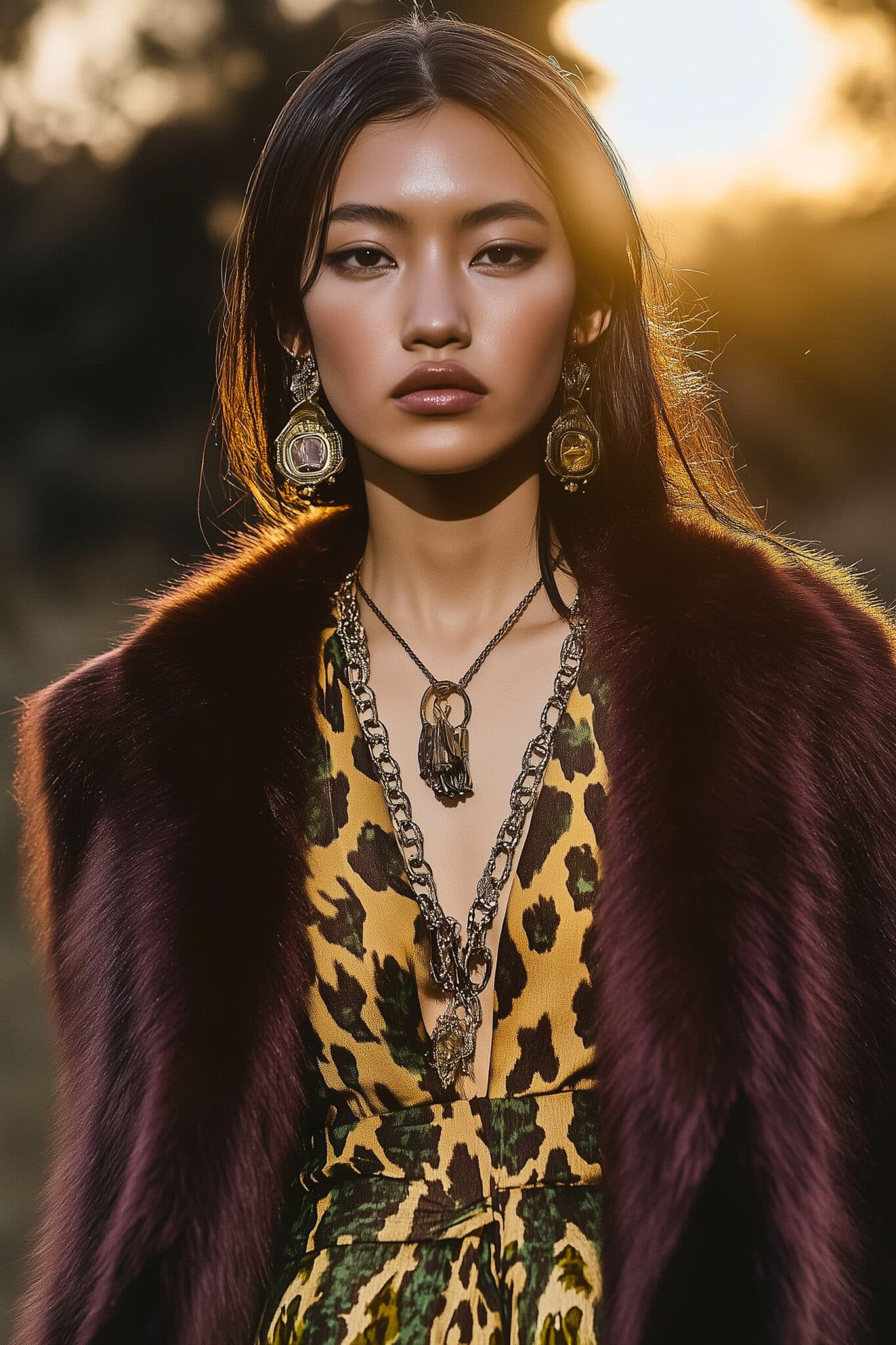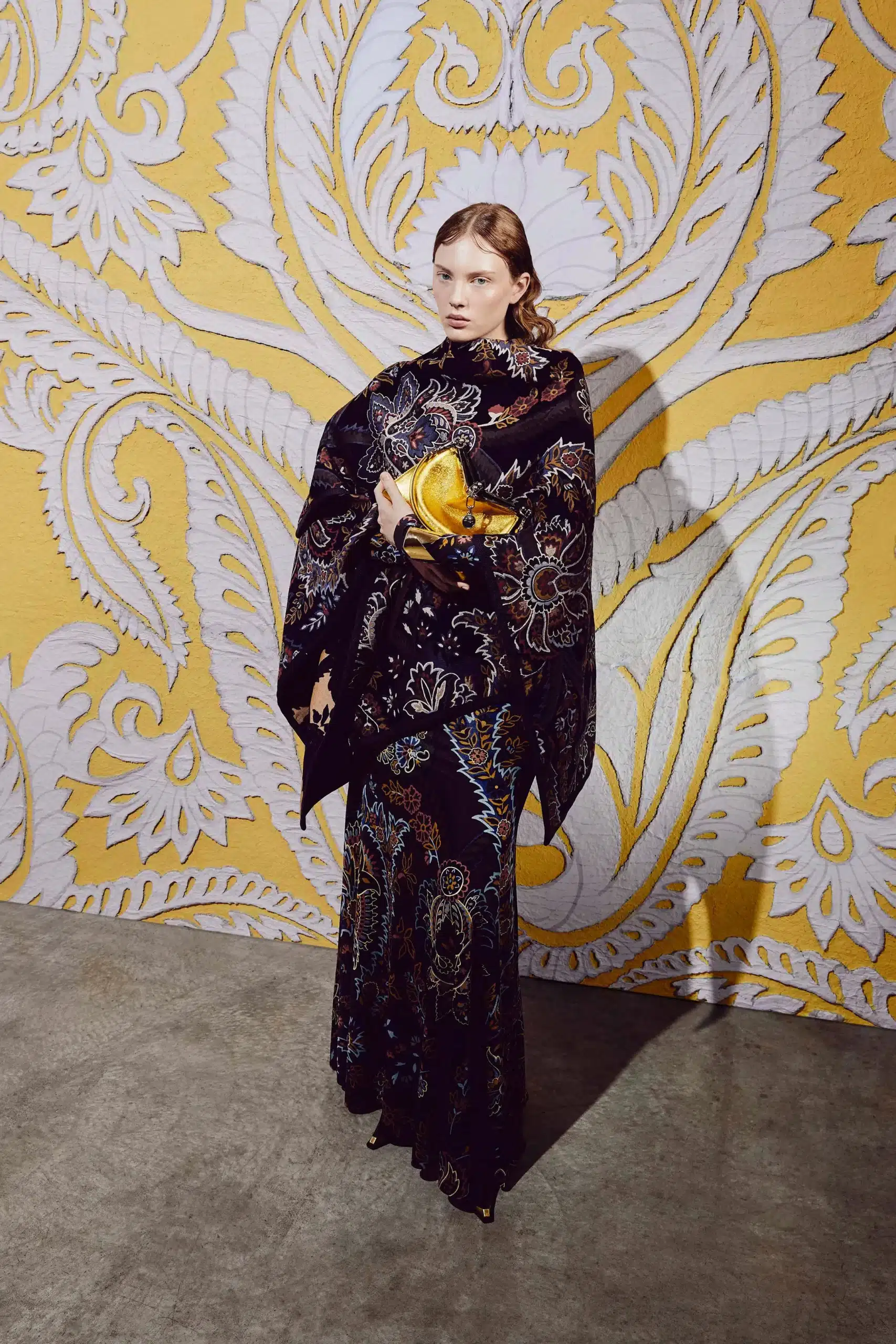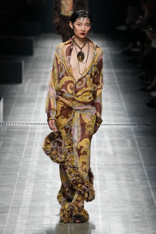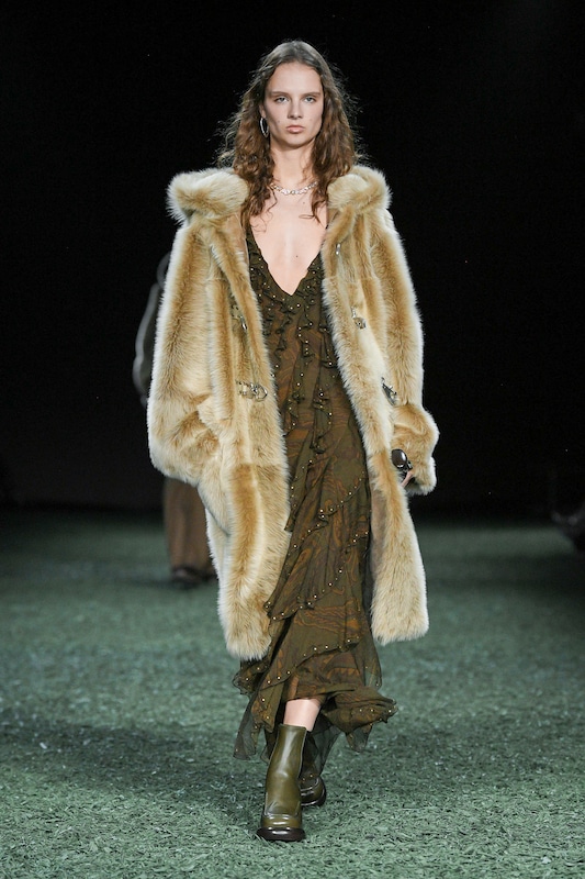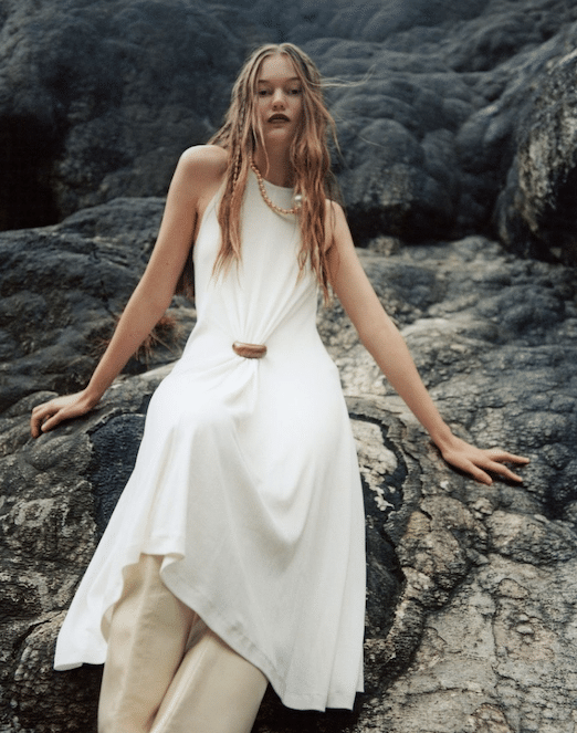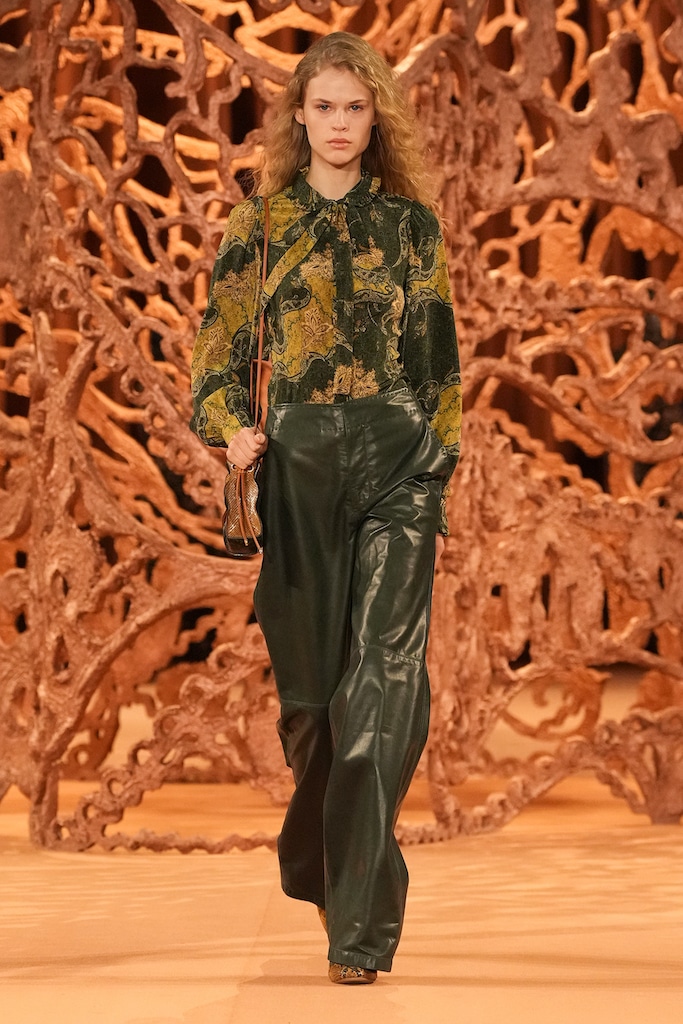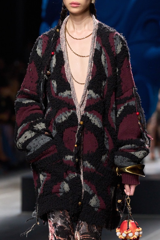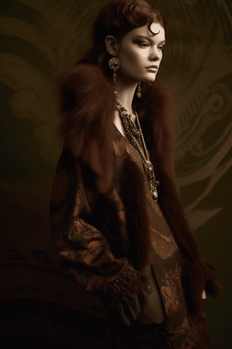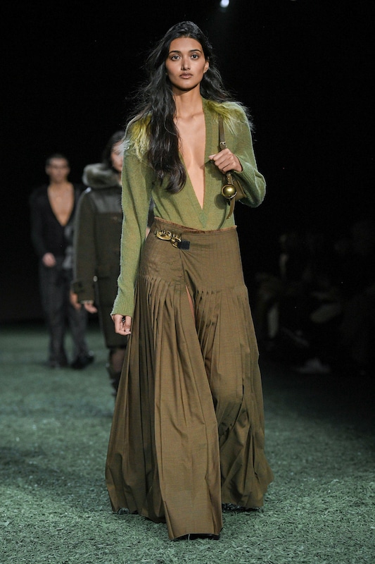 The aesthetic narrative fuses earthy stories and celestial notions, crafting new nomadic silhouettes in maxi length that billow with the whispers of ancient wisdom. Primal bohemian patterns embellish textiles, while layering and drapes create a sense of mystery. Chic silhouettes are juxtaposed with wilderness textiles and color palettes, marrying urban sophistication with the raw beauty of the untamed wilderness.