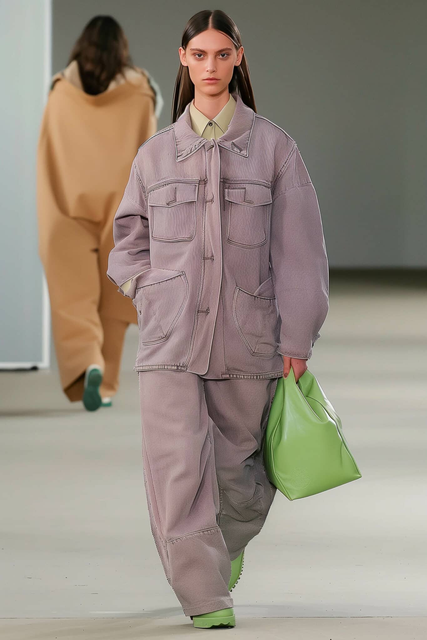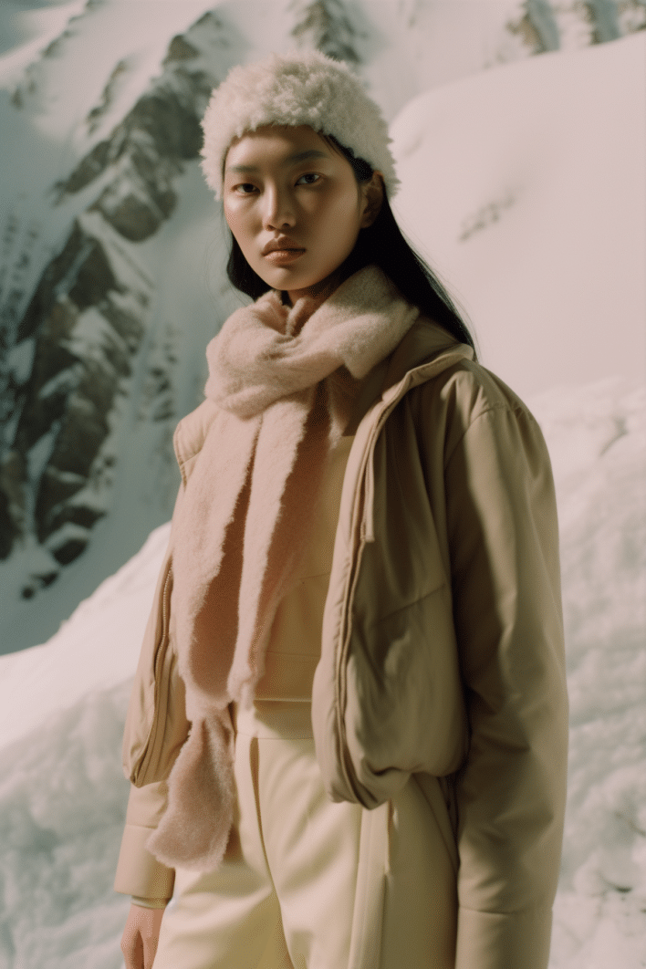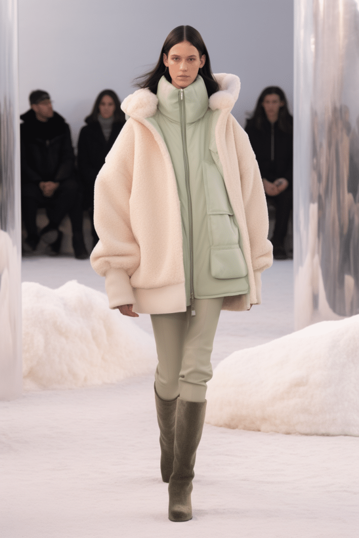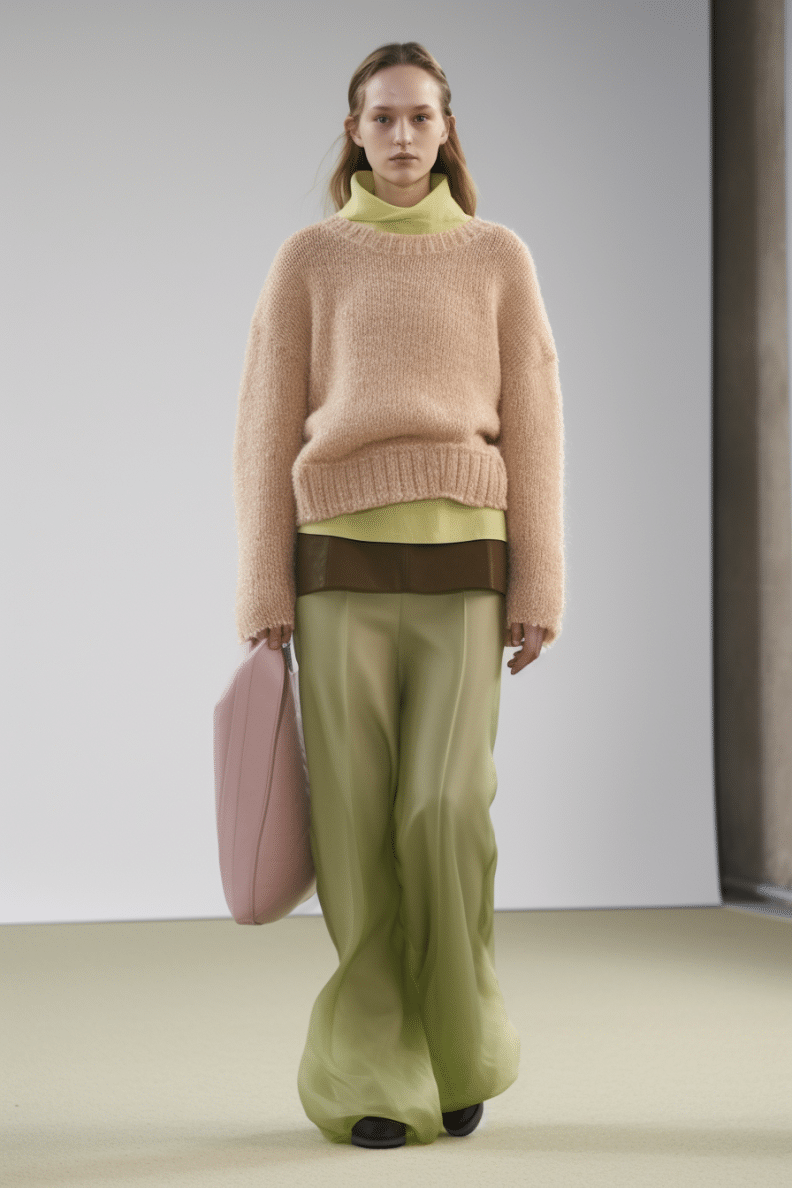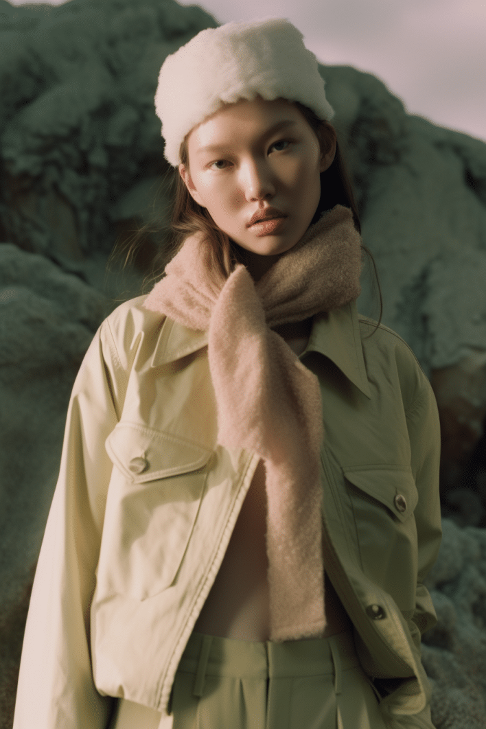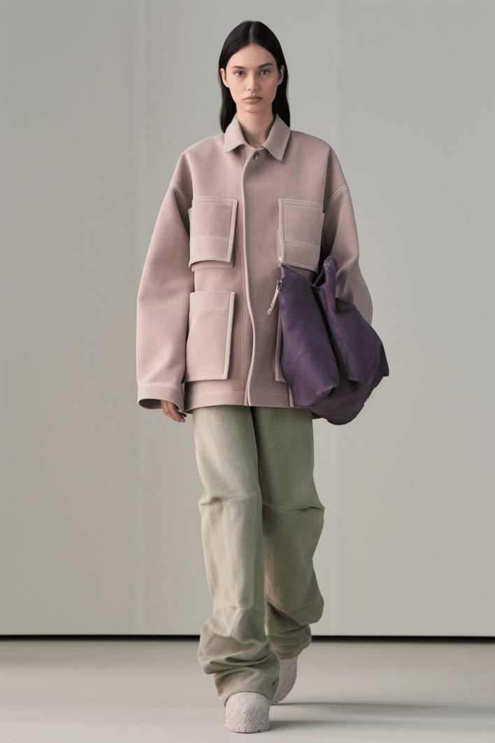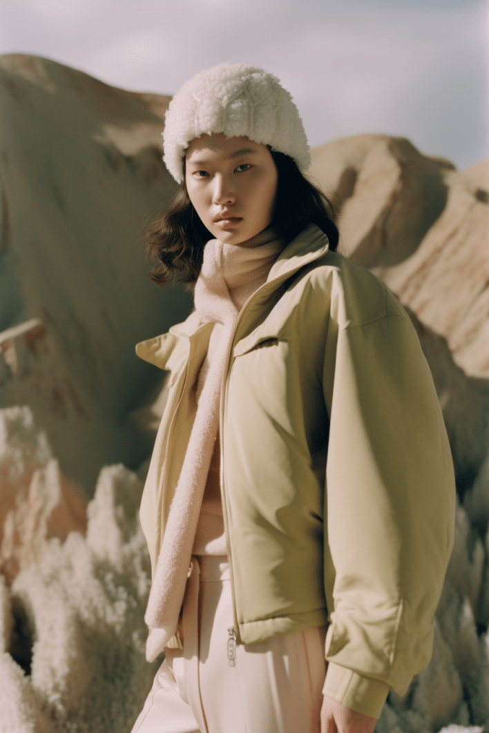 This trend encapsulates a mindset of pragmatism, intellect, and smart solutions. Rooted in a deep appreciation for functionality and efficiency, this trend embraces a poetic interpretation of the outdoors, infusing it with a serene and contemplative essence. The aesthetic reflects quiet utility and soft gorpcore. Subtly tinted pastel hues infuse this trend‘s palette, imbuing it with a tranquil and tender ambiance. Gentle basics with a ratehr genderless appeal form the foundation of this trend, allowing for effortless mix-and-match versatility. Soft knit essentials crafted from gauze and mohair evoke comfort and warmth, while micro-texture materials create an even more poetic, less harsh outdoor look. For the look, all-terrain capabilities ensure adaptability to diverse environments, while maintaining an aura of understated elegance. Understated puffer pieces seamlessly integrate into the silhouettes, offering both warmth and a soft pneumatic look without overwhelming the senses. Workwear takes on a dreamy worn-out appearance, enhancing its functionality with a touch of nostalgia and charm. More sophisticated and understated utility finishings further enhance the aesthetic, marrying form and function with a chic allure. At its core, the FW25/26 macro trend embodies a spirit of serene exploration, inviting to venture into the unknown with looks thar resonate calm confidence and respectful grace towards the outdoors.